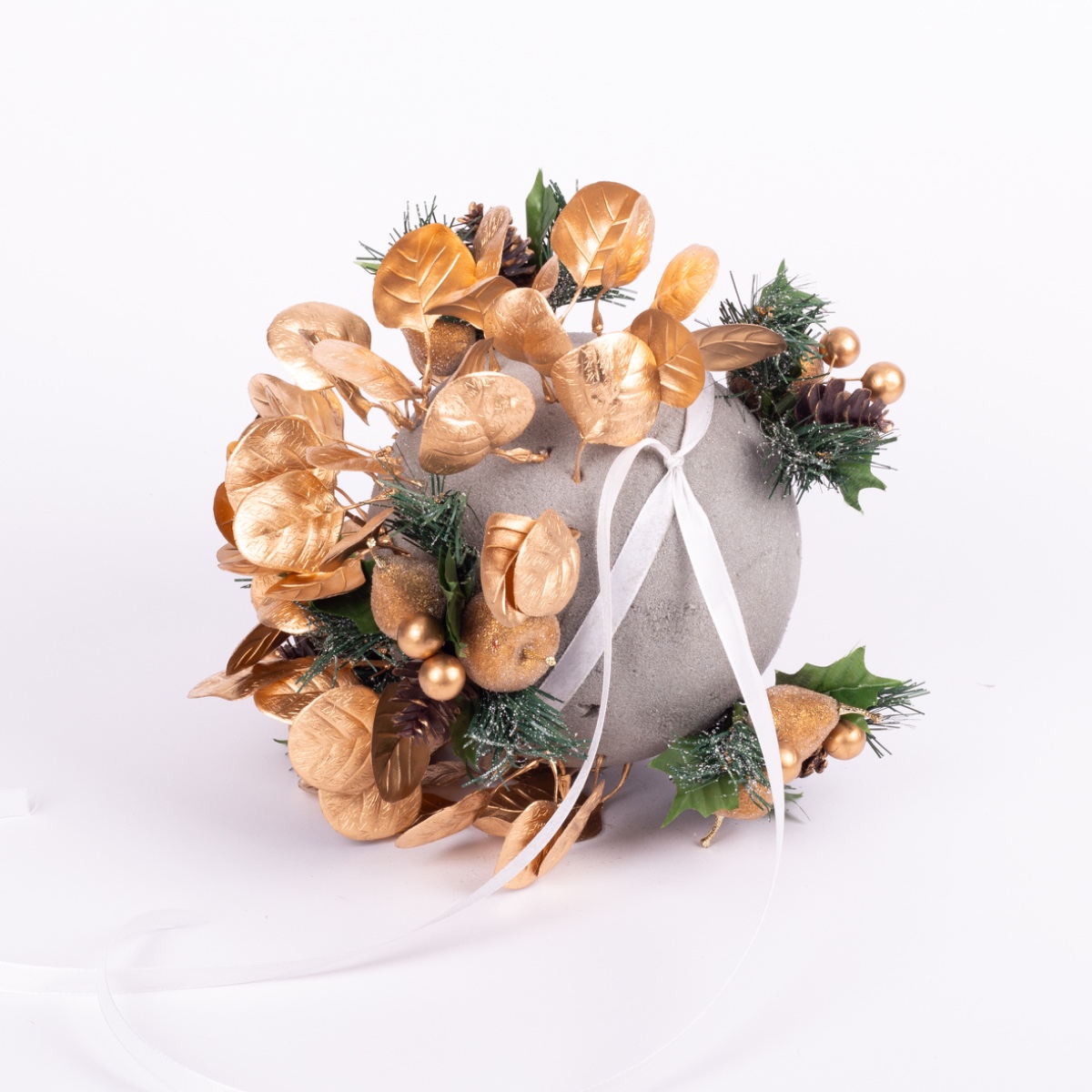 1. Enroulez d'abord le ruban de satin autour de la boule, nouez-le fermement et fixez-le avec 2 ou 3 agrafes ou épingles. Les extrémités du ruban de satin doivent mesurer au moins 40 cm de long, car elles serviront plus tard à suspendre la boule.
