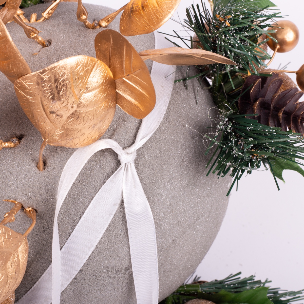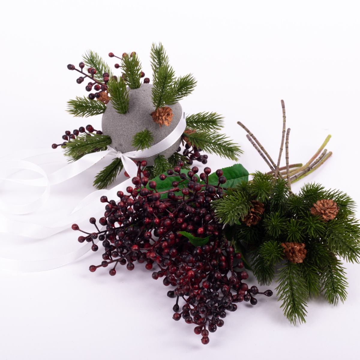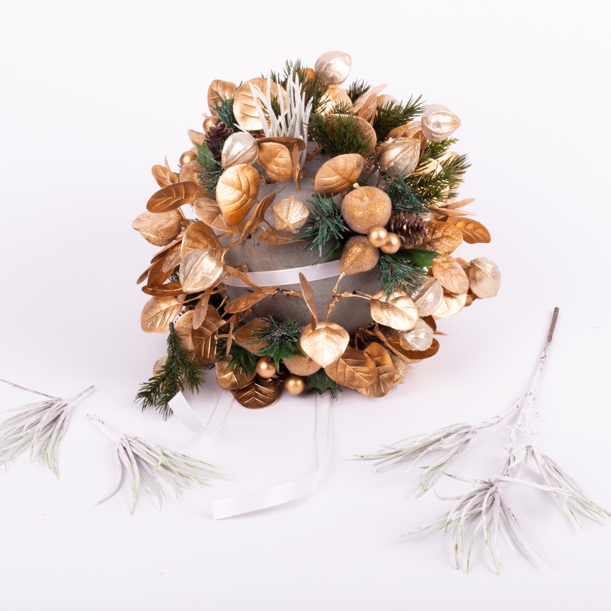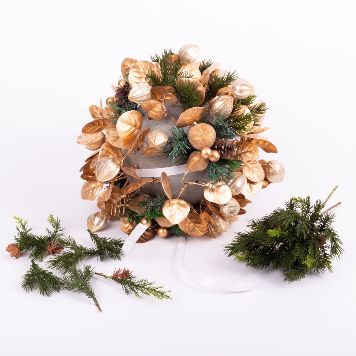 Il est important que la mousse florale soit le moins visible possible à la fin. Les branches à aiguilles sont particulièrement adaptées à cet effet.