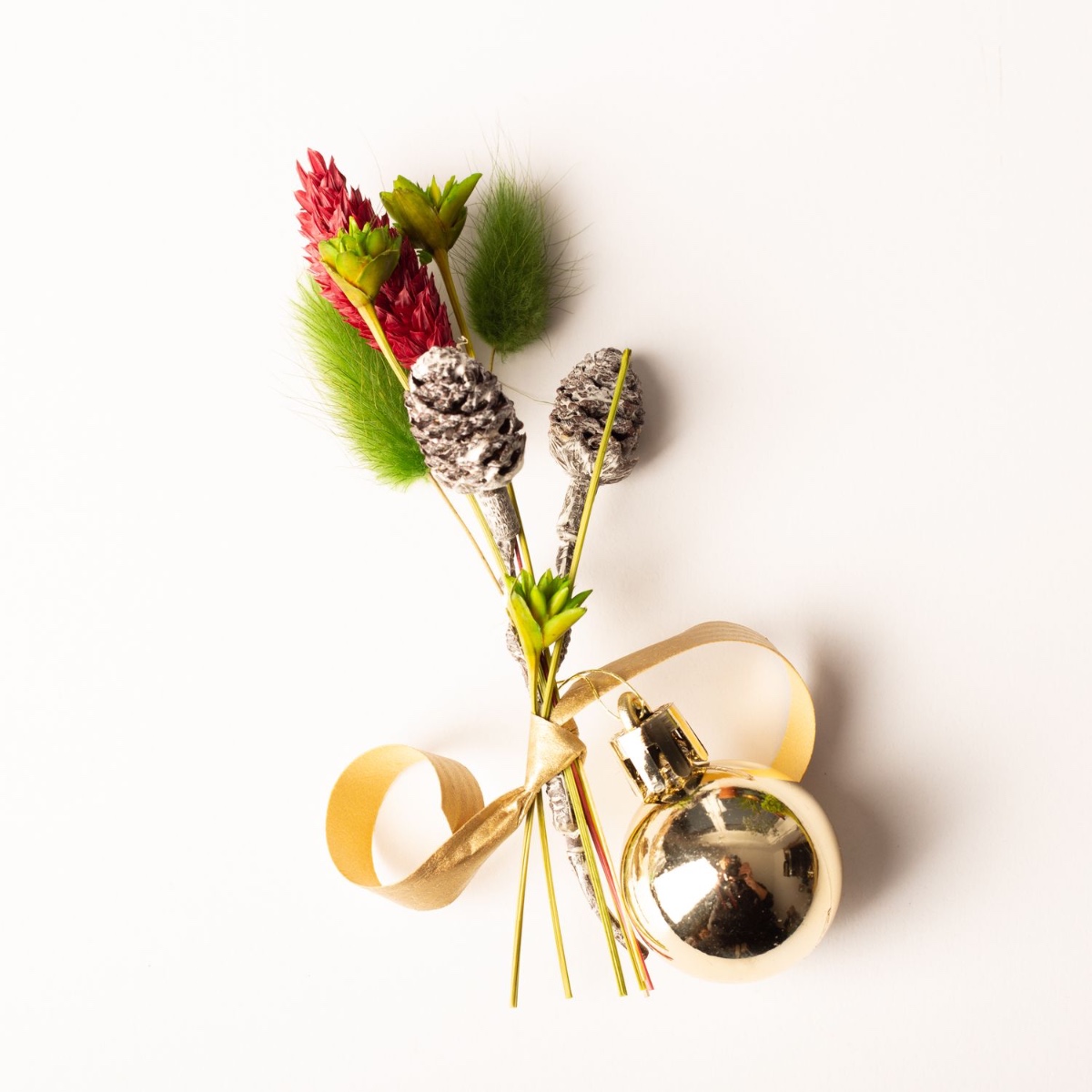 Conseil de création : coupez les fleurs séchées et la branche artificielle à environ 10 cm et assemblez-les pour former un petit bouquet. Utilisez un joli ruban pour l'attacher. Nous avons décoré le tout avec une mini boule de Noël ou un élément similaire.