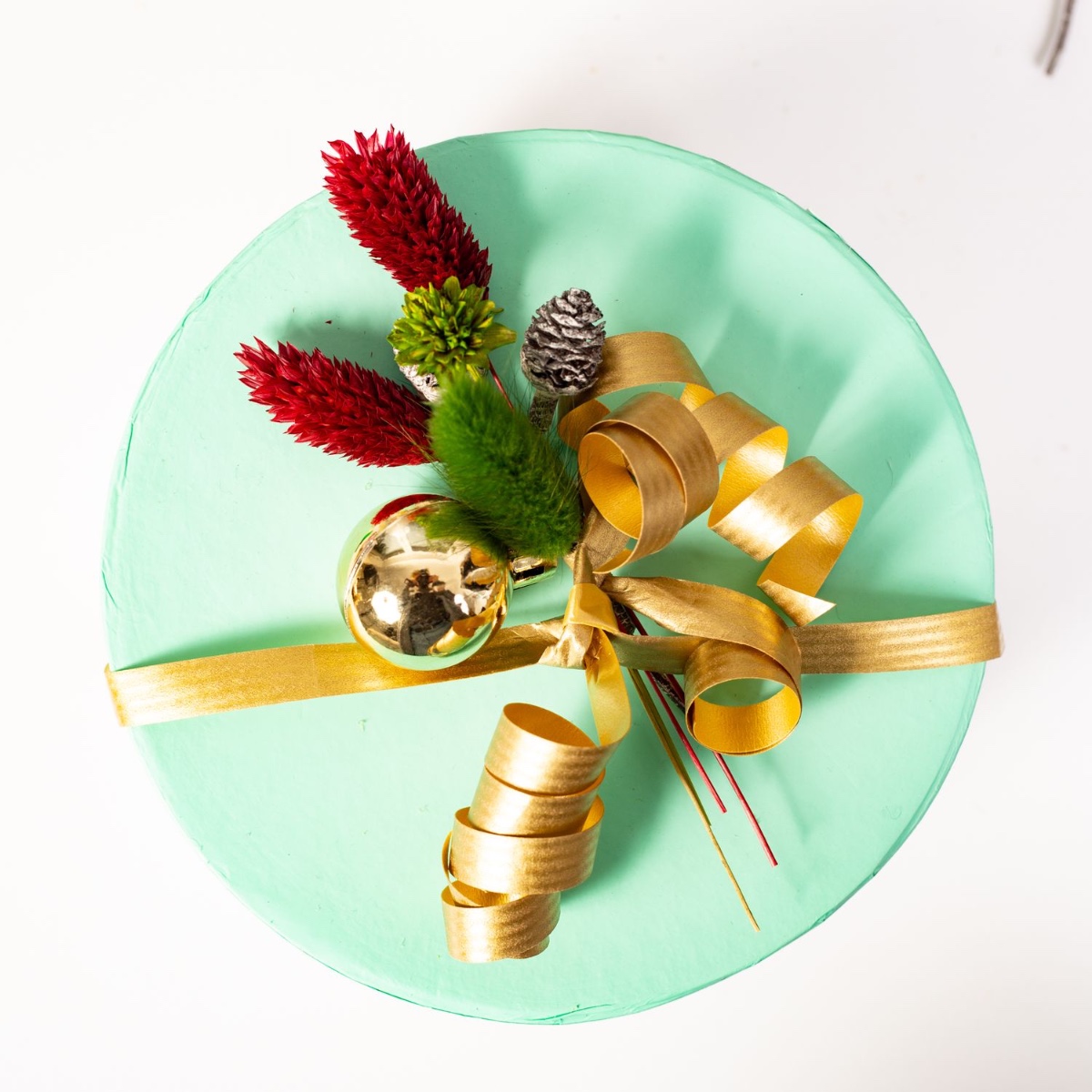 Rouge, vert et doré ! On ne pouvait pas choisir des couleurs plus festives. À partir de différentes fleurs séchées et d'une branche artificielle, nous avons confectionné un mini bouquet qui servira d'étiquette cadeau. Sur la boîte turquoise, cette combinaison de couleurs est très moderne et transforme chaque cadeau en une petite œuvre d'art. Car offrir, c'est aimer. Shop the Look !