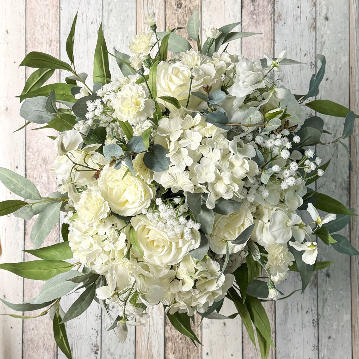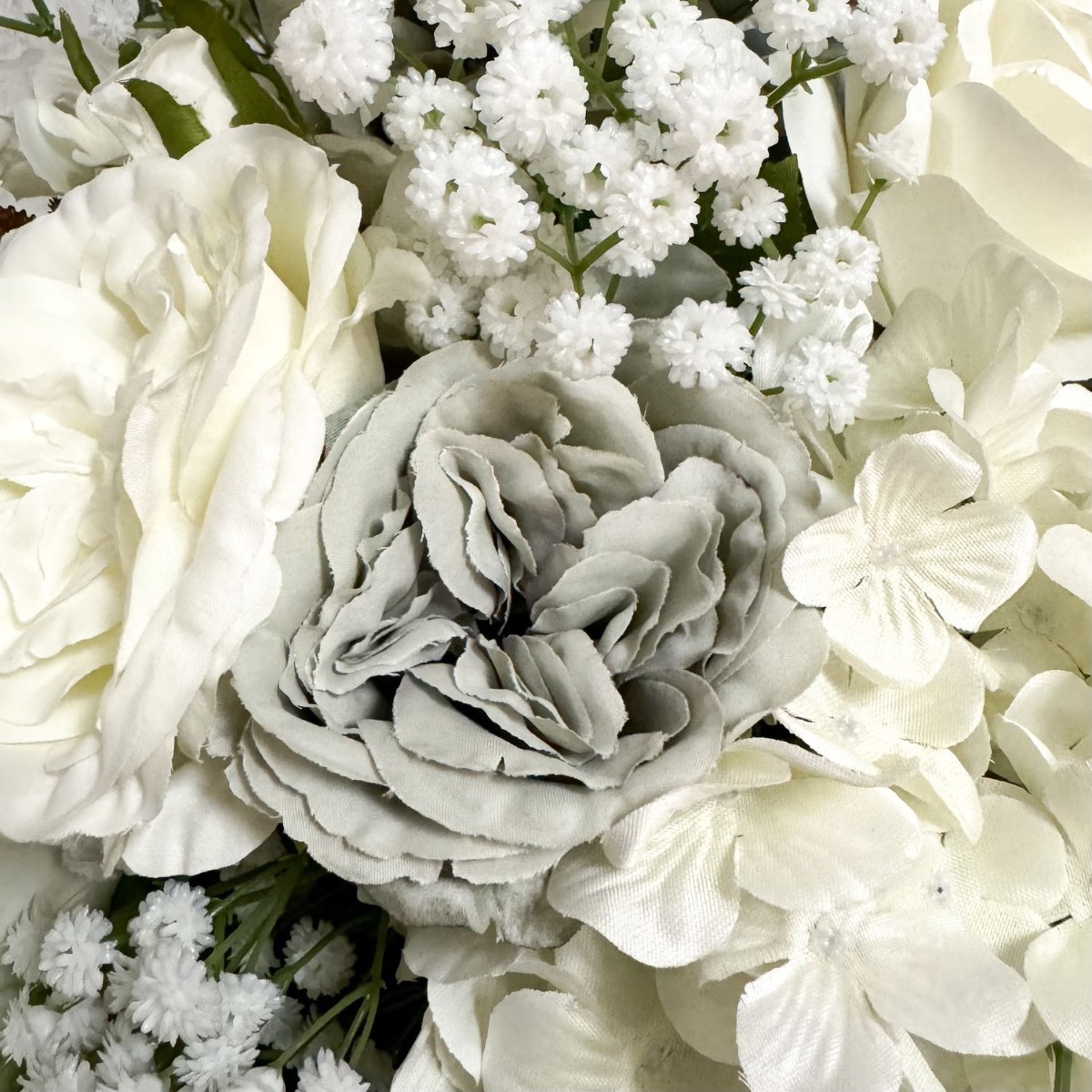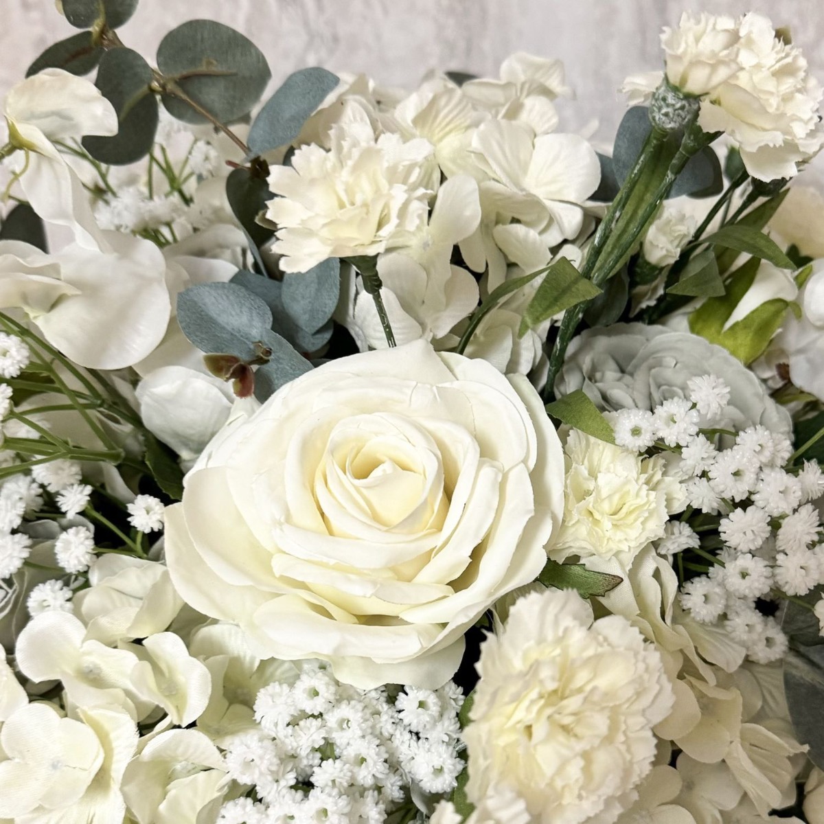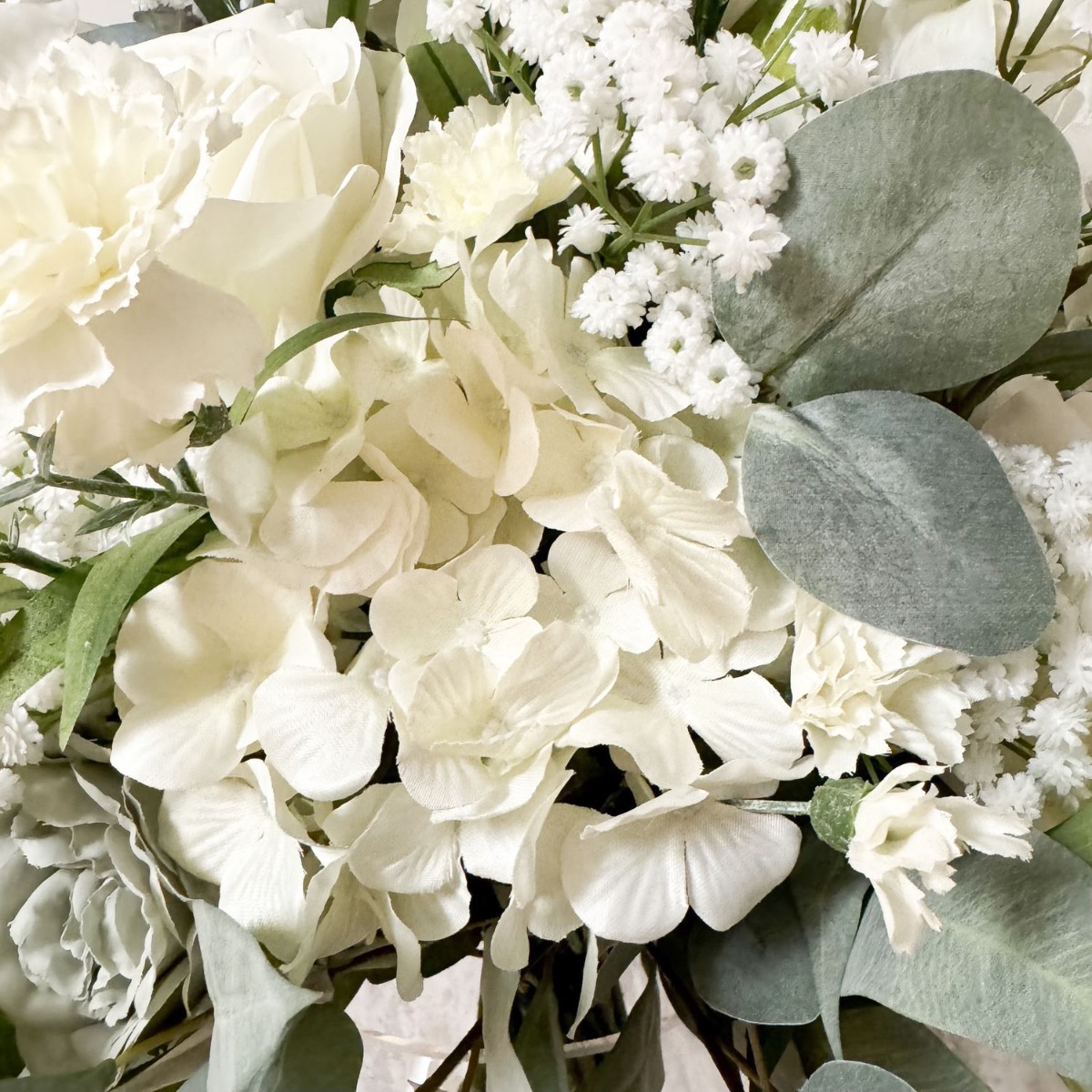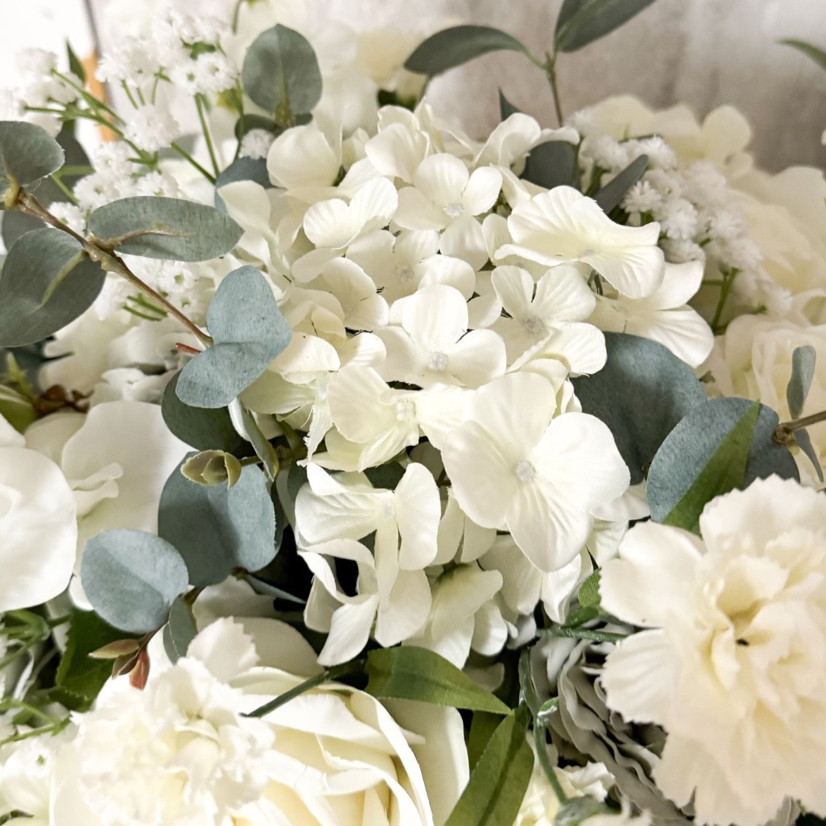 Volumineux et élégant ! Le bouquet déjà réalisé par Ghita Marine a beaucoup plu à une autre de nos clientes. Celle-ci le souhaitait simplement beaucoup plus volumineux. Pour conserver la beauté originelle de la composition florale, nous avons pris exactement les mêmes fleurs et avons simplement augmenté leur nombre. Lier le bouquet était déjà un véritable défi, car la quantité de fleurs tenait à peine dans une main. Le bouquet de fleurs a grandi et s'est transformé en un impressionnant objet déco. A la moitié environ, on a d'abord attaché avec une ficelle ce qui avait déjà été confectionné. Ensuite, le reste des fleurs et des branches avec des feuilles ont suivi jusqu'à son achèvement. Le schéma de couleurs discret et réservé du bouquet est presque intemporel, mais se remarque néanmoins en raison de sa taille gigantesque. Vous aussi, vous aimeriez un ensemble floral aussi beau ? Shop the Look!