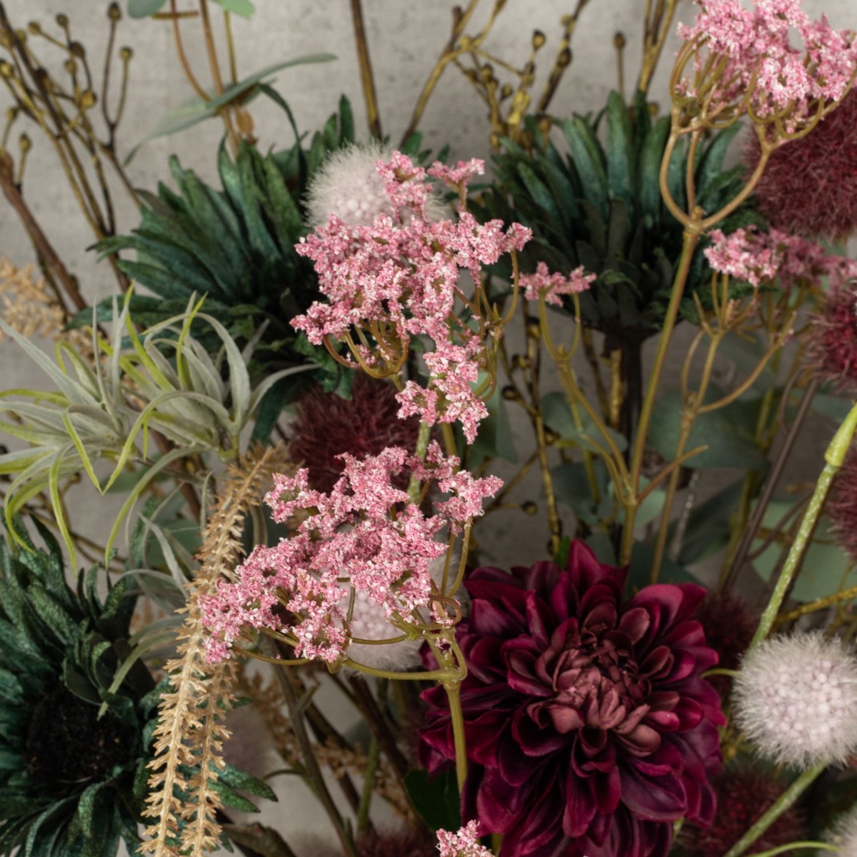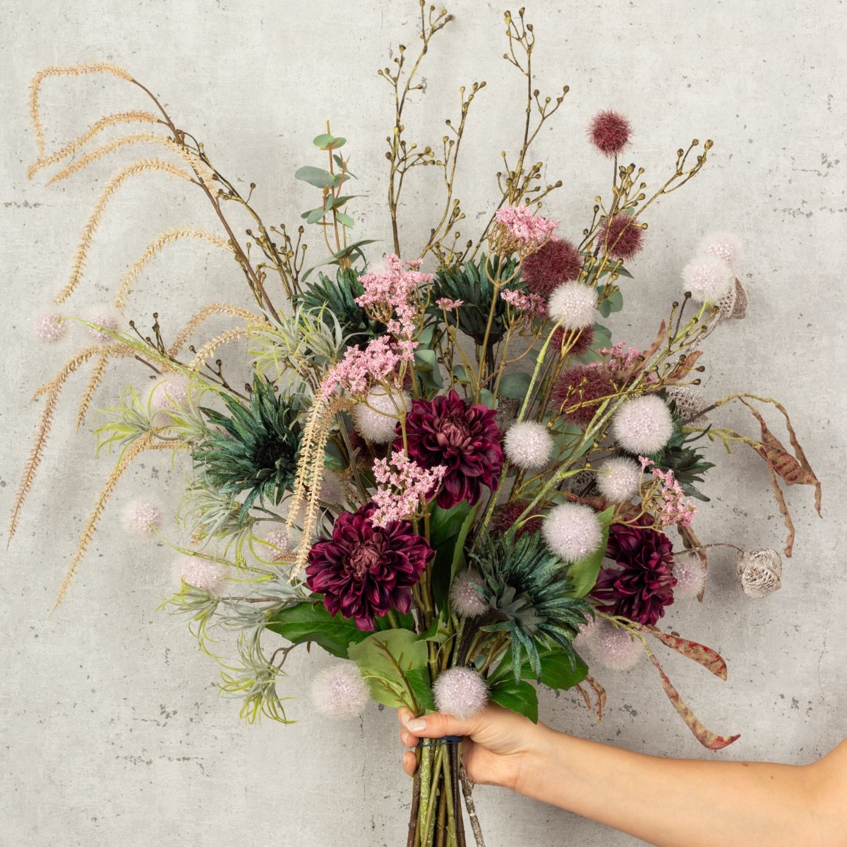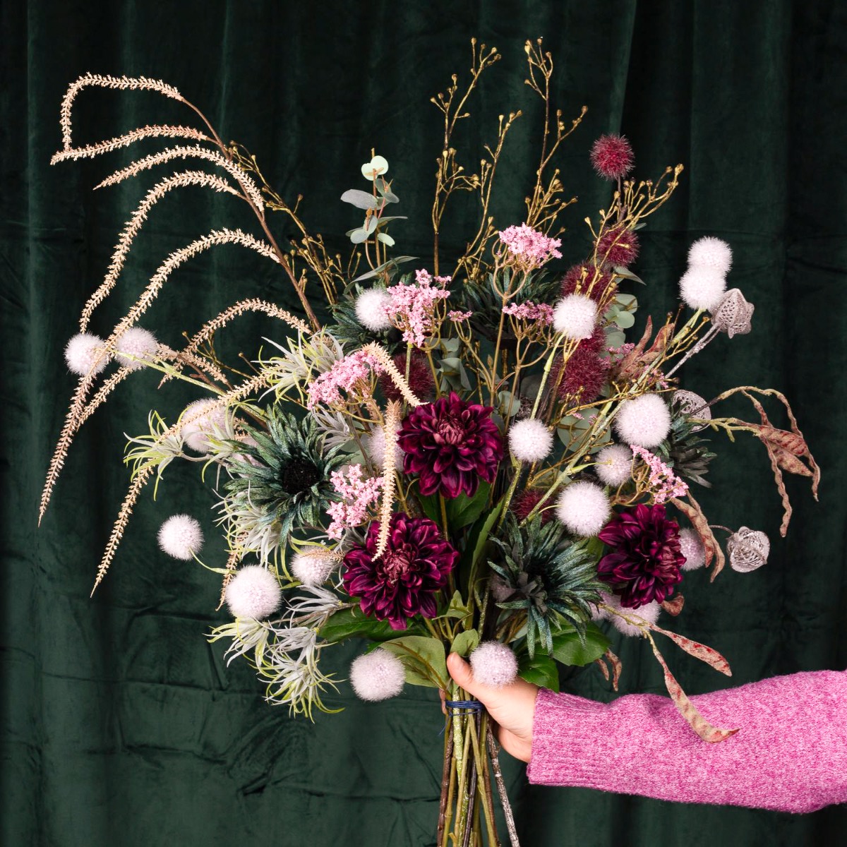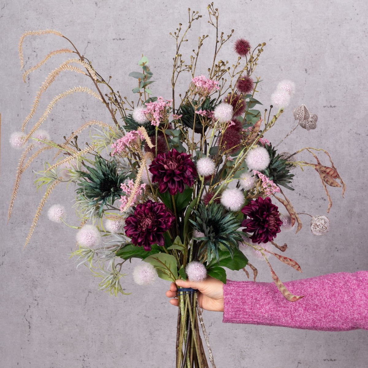 Un style en toute saison ! Cette nouvelle édition de l'un de nos looks les plus vendus a pris une nouvelle allure. Les dahlias brillent maintenant d'un ton fuchsia vif et illuminent le bouquet dans son ensemble. Ainsi, notre look hivernal plein d'ambiance s'est transformé en un look frais pour toute l'année, qui convient tout simplement partout. Nos clients sont ravis à chaque fois qu'ils tiennent ce bouquet dans leurs mains. Shop the look!