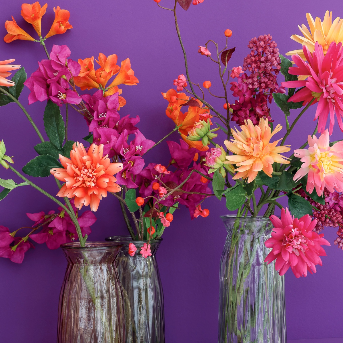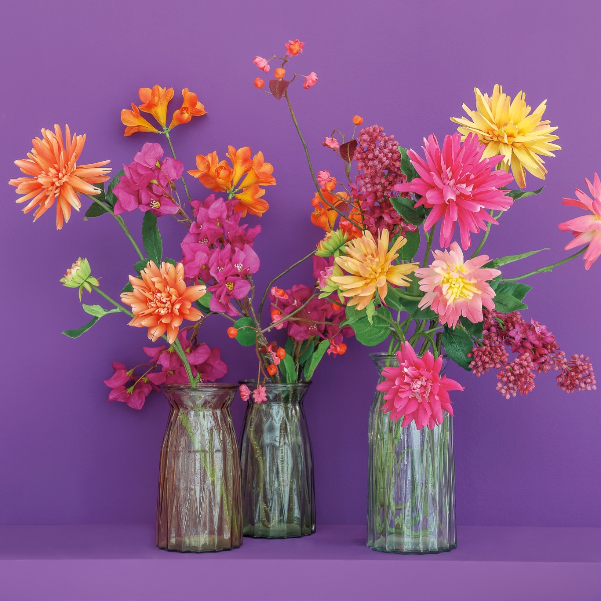 L'été est là et avec lui, tant de couleurs magnifiques. Si vous ne vous lassez pas de les admirer, faites entrer ces fleurs colorées dans votre maison ! Des dahlias roses, des campanules orange, des bougainvilliers roses, des chrysanthèmes jaune ocre et une branche de chou orange dévoilent toute leur splendeur. Cette idée déco est un peu plus discrète avec la fleur skimmia et les vases à fleurs « RUBIE » en rose et vert transparent. Après tout, nous ne voulons pas détourner l'attention des couleurs vives des magnifiques fleurs estivales, n'est-ce pas ? Shop the Look !Conseil de décoration : raccourcissez les tiges des fleurs. Il est préférable de couper chaque variété à une longueur différente afin de pouvoir répartir les fleurs dans les vases en créant des dégradés. Vous pouvez également courber délicatement les tiges dans la direction souhaitée.