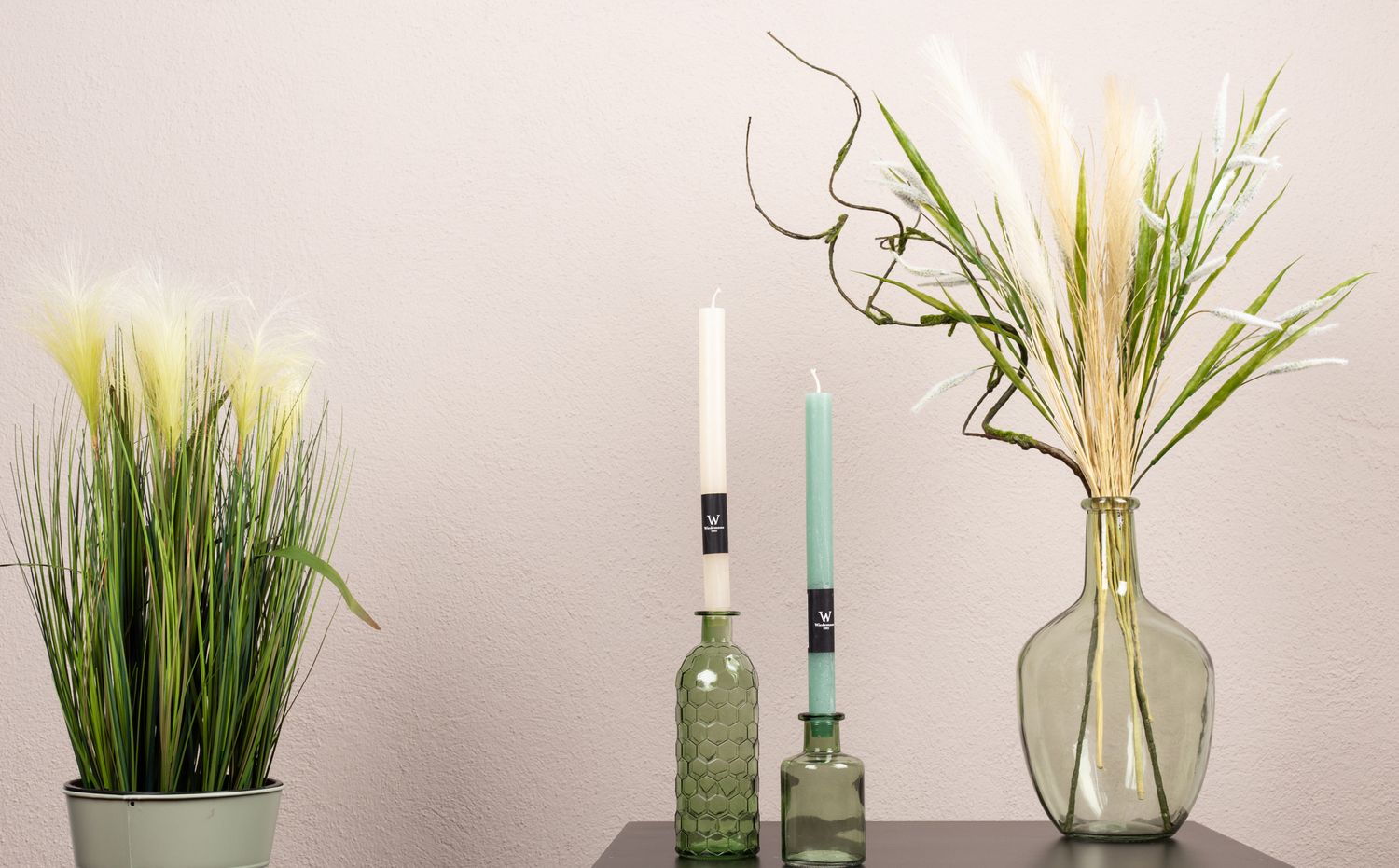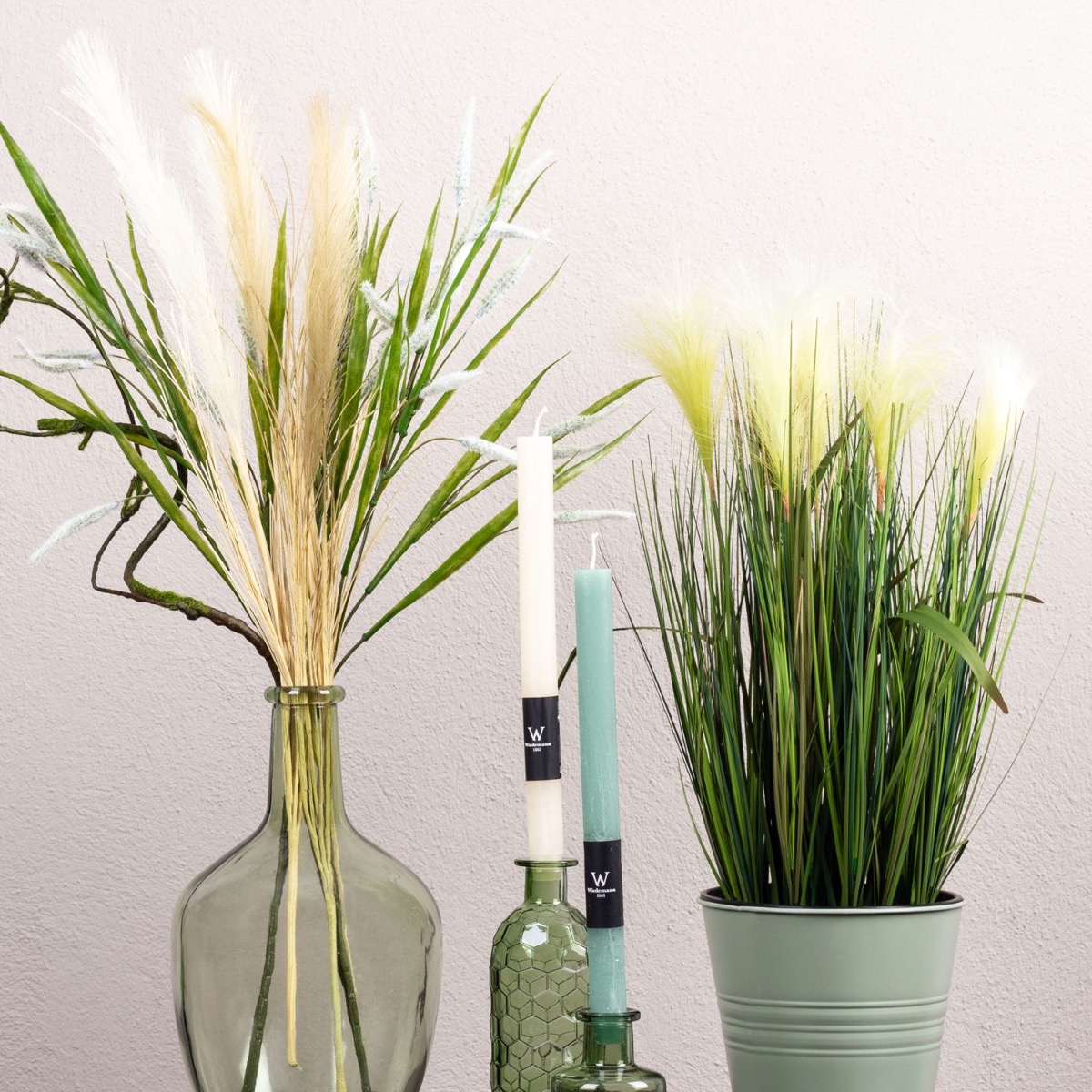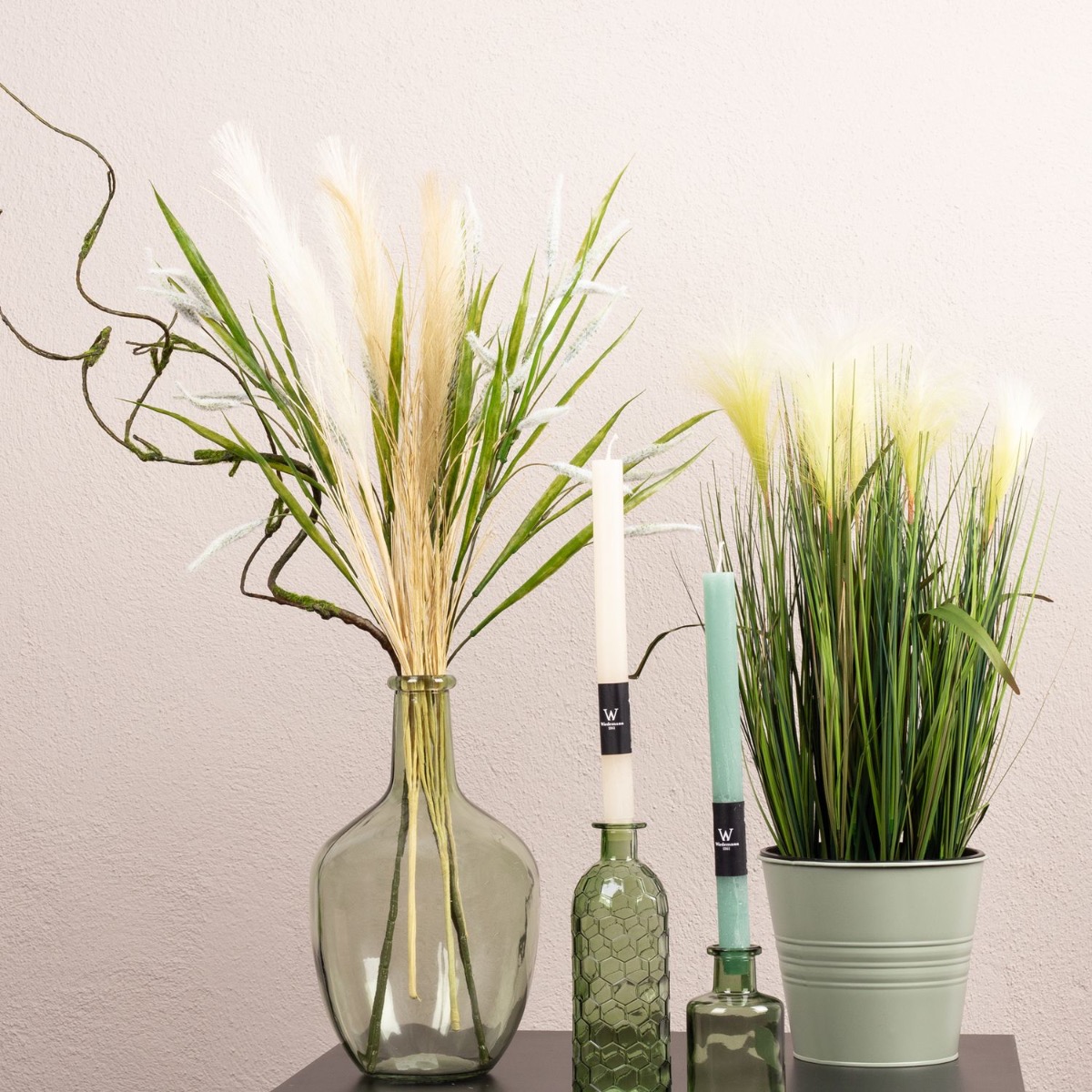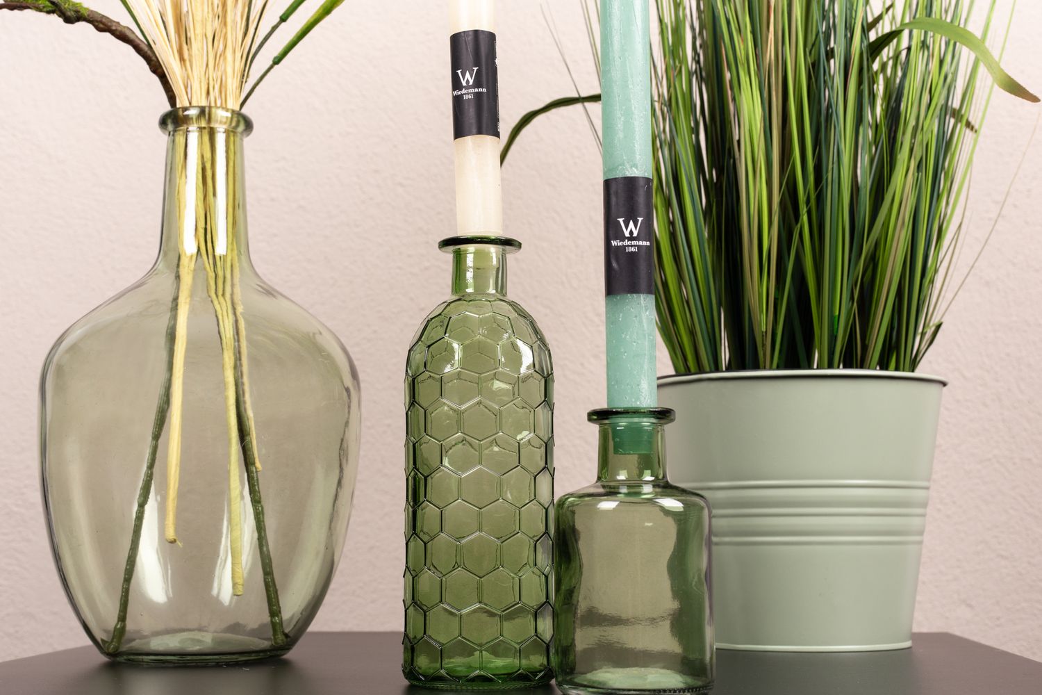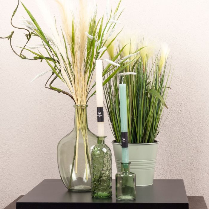 Vert, vert et vert! La couleur qui est toujours à la mode. Ce qui a un effet relaxant et apaisant pour les yeux est également une oasis de détente dans l'espace de vie. Notre look montre des herbes dans différentes nuances de vert et de brun, harmonieusement assorties les unes aux autres. Les bouteilles vertes ne conviennent pas seulement comme vase, mais sont également parfaites comme bougeoirs. Avec ce look, on sent presque la douce brise d'été. Shop the look!