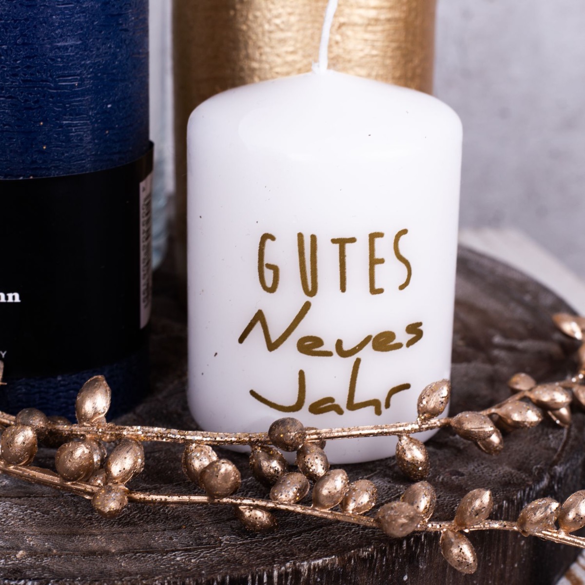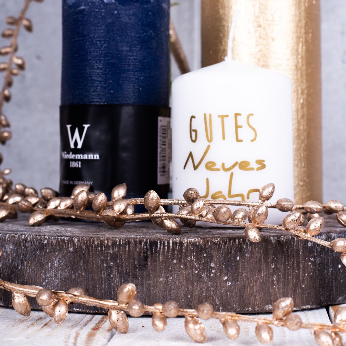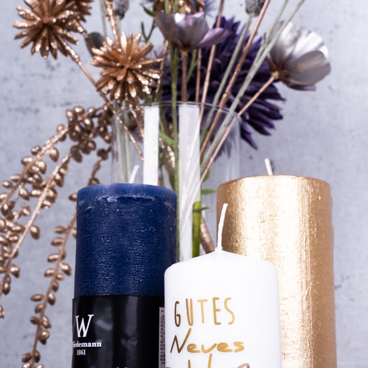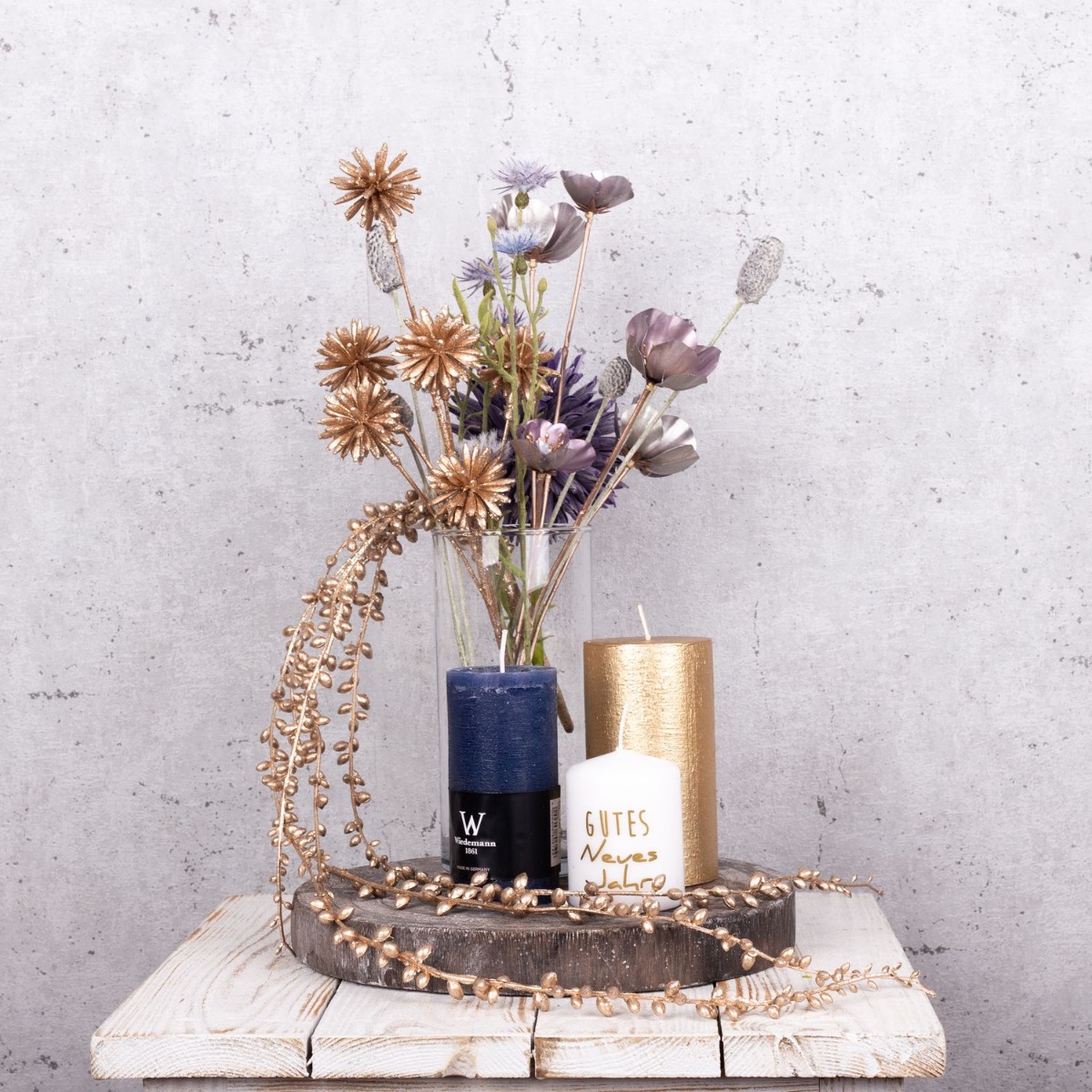 Conseil d'aménagement : Raccourcir les fleurs à la taille du vase et les mettre dans le vase. La suspension dorée de senecio doit bien serpenter vers le bas et entourer les bougies. Placer les bougies de manière à ce que la flamme ne soit pas trop proche des fleurs artificielles.
