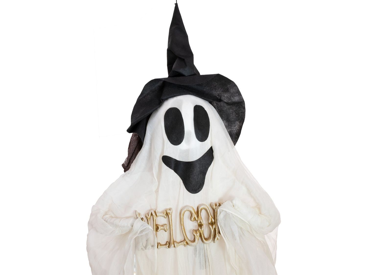 - Fantôme suspendu avec un sourire amical et un chapeau noir pointu (avec un nœud pour l'accrocher), enveloppé dans un tissu blanc aéré