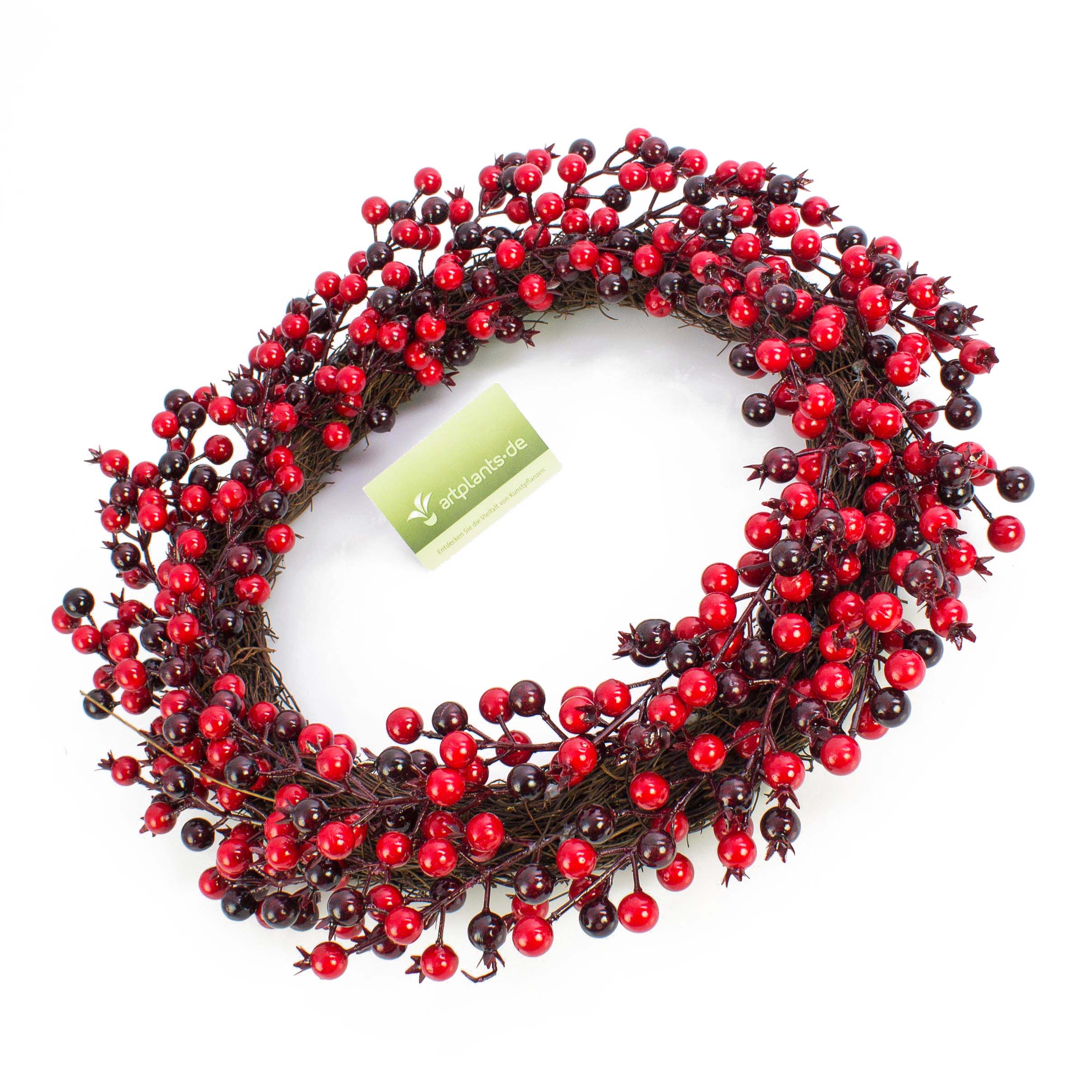 Couronne de baie artificielle de couleur rouge vin de diamètre extérieur d'environ 45 cm. Cet objet de décoration convient parfaitement pour des thèmes autour de l'automne ou de Noel.
