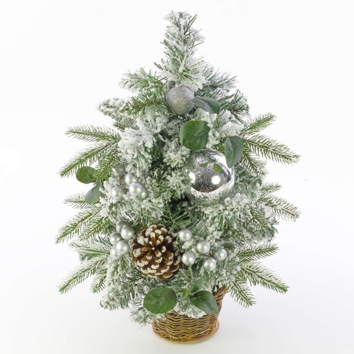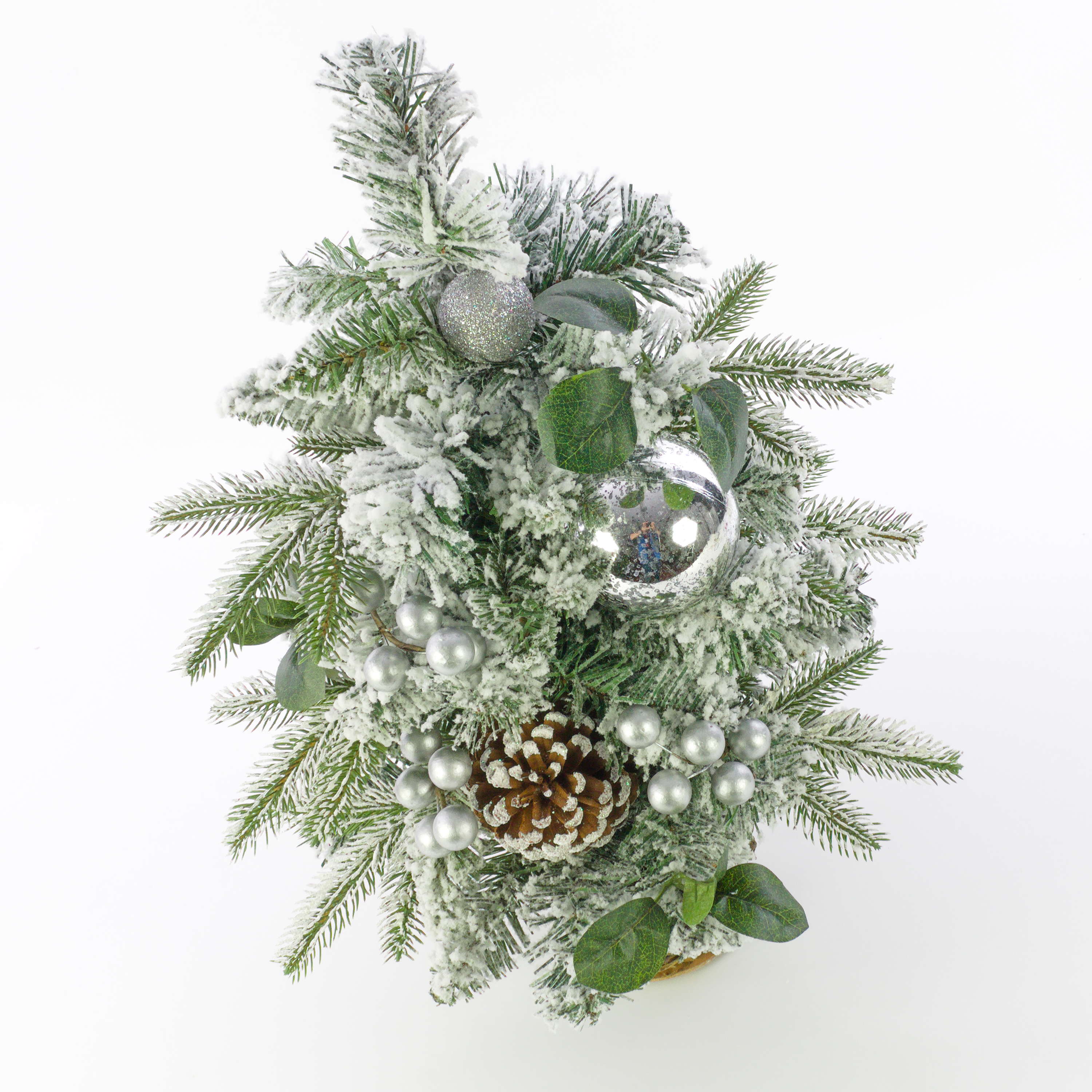 L'arbre de Noël décoratif HELSINKI d'une hauteur d'environ 50 cm et d'un diamètre d'env. 30 cm est fixé dans un panier en bois. Cet arbre artificiel est orné de boules de Noël argentées de tailles différentes, de neige artificielle et de nombreuses autres décorations de Noël. Les branches artificielles sont solidement reliées au tronc, de sorte que l'arbre de Noël artificiel soit placé rapidement et facilement à l'endroit souhaité.