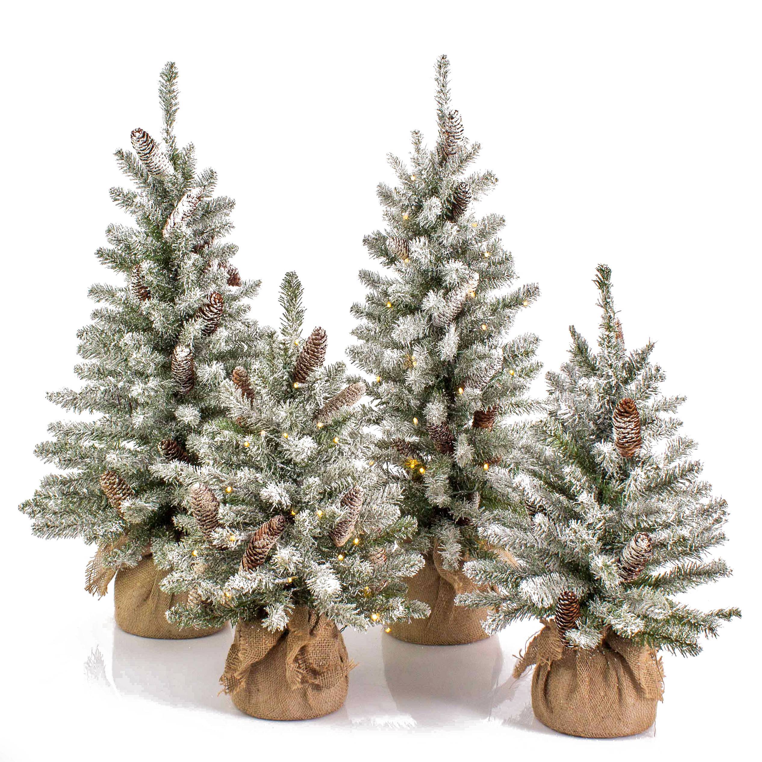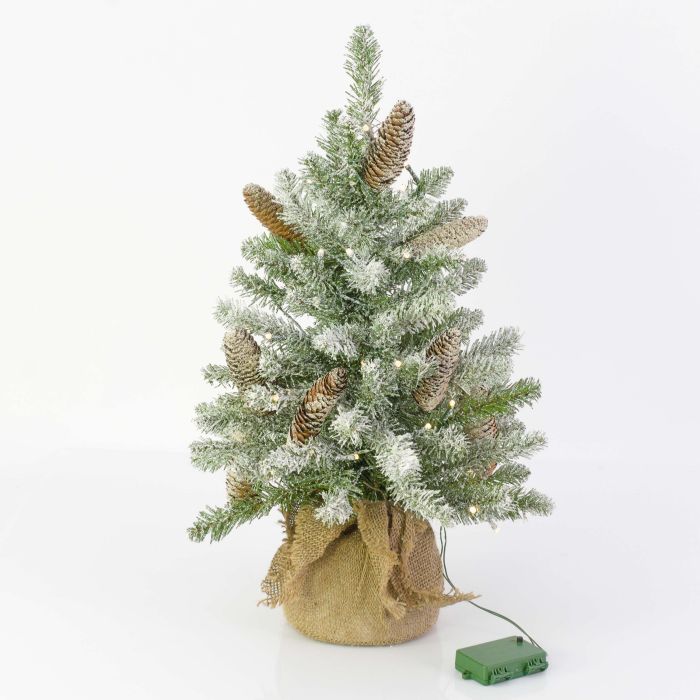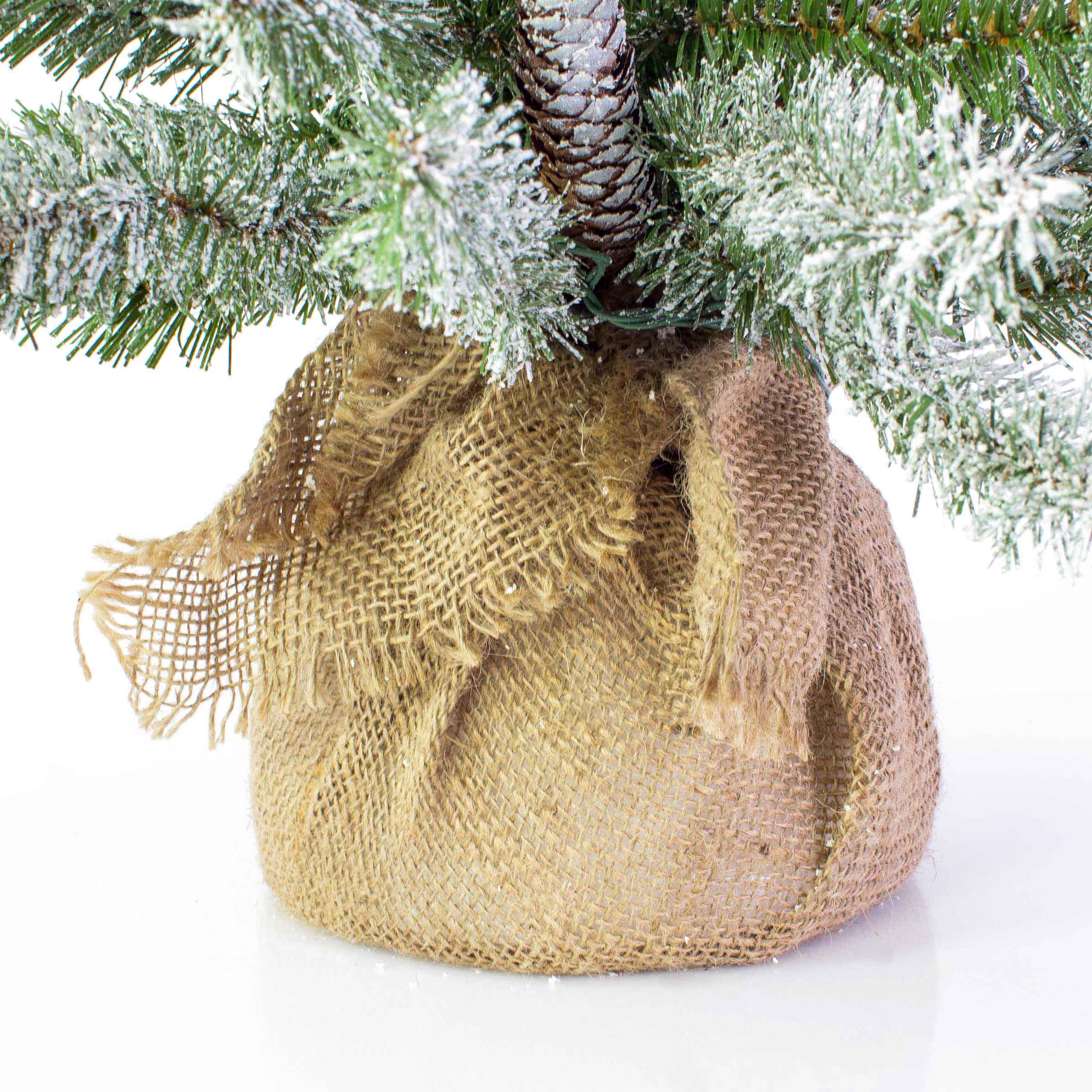 Faux sapin VIENNE, pommes de pin, sac de jute, LEDs, neige, 60cm, Ø40cm