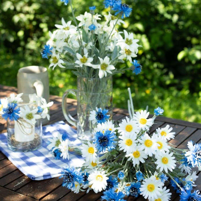 Bleu et blanc ! Voilà à quoi ressemble le ciel de Bavière. Et c'est aussi ainsi que nous avons conçu notre look. Lorsque le mot d'ordre est à nouveau "O'zapft is !", une période particulière commence à Munich. Le dirndl et le pantalon en cuir sont sortis de l'armoire et présentés à la fête de la bière. Une chope de bière en plus et la journée est parfaite. Mais entre-temps, on célèbre aussi cette fête dans d'autres régions de l'Allemagne. Et là, il est bien sûr particulièrement important d'avoir une décoration adaptée à portée de main. Le style "Wiesn" en fait tout simplement partie. Les marguerites et les bleuets sont notre blason bleu et blanc. Un bouquet pour la dame et un petit bouquet à la boutonnière pour l'homme, c'est la vraie tradition ! Le bouquet d'edelweiss et de bleuets n'existe que chez Artplants, car l'edelweiss est une plante protégée. L'edelweiss est synonyme de courage, de bravoure et d'amour. Eh bien, si ce n'est pas un message caché à l'attention de la bien-aimée ... Shop the look!