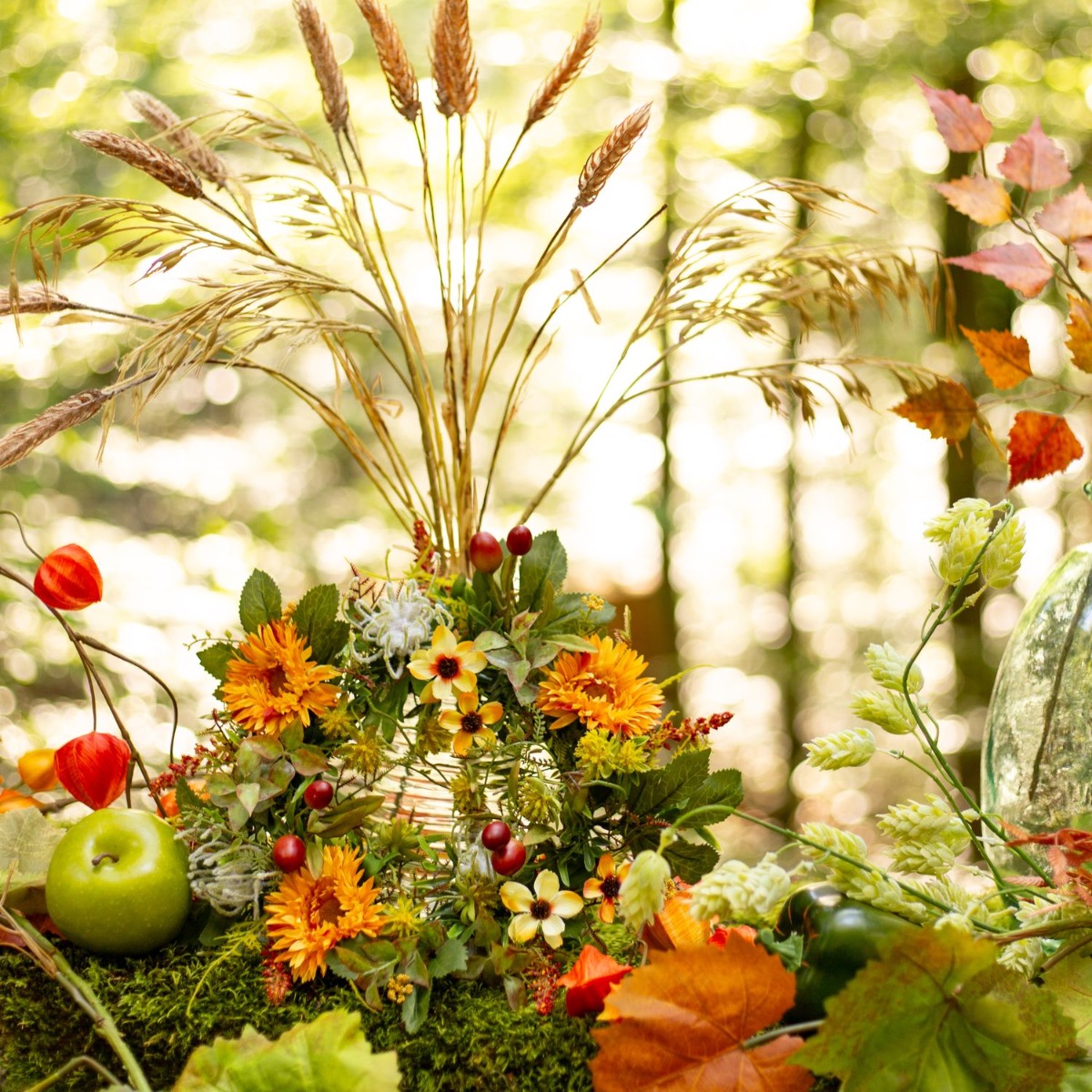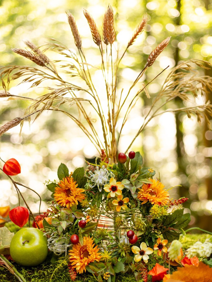 Le remerciement pour une récolte fructueuse ! Le fruit de la terre et le travail humain sont célébrés lors de la fête des récoltes. Une coutume autrefois païenne, célébrée depuis le 7e siècle. Pour ce look, nous avons créé un bouquet d'épis comme pièce maîtresse qui se trouve dans une bouteille à rainures. Une couronne automnale s'appuie sur la bouteille et quelques fruits encadrent le petit bouquet. Shop the look!