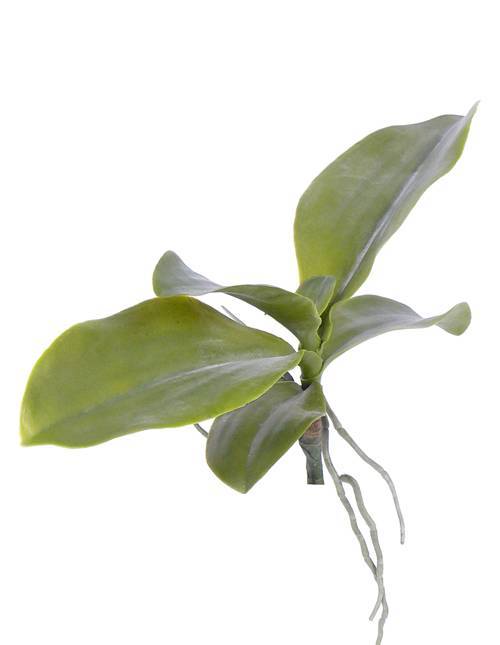 Feuilles artificielles d’orchidée de couleur verte. Les feuilles sont fixées à la tige et sont pourvues de quelques racines aériennes.