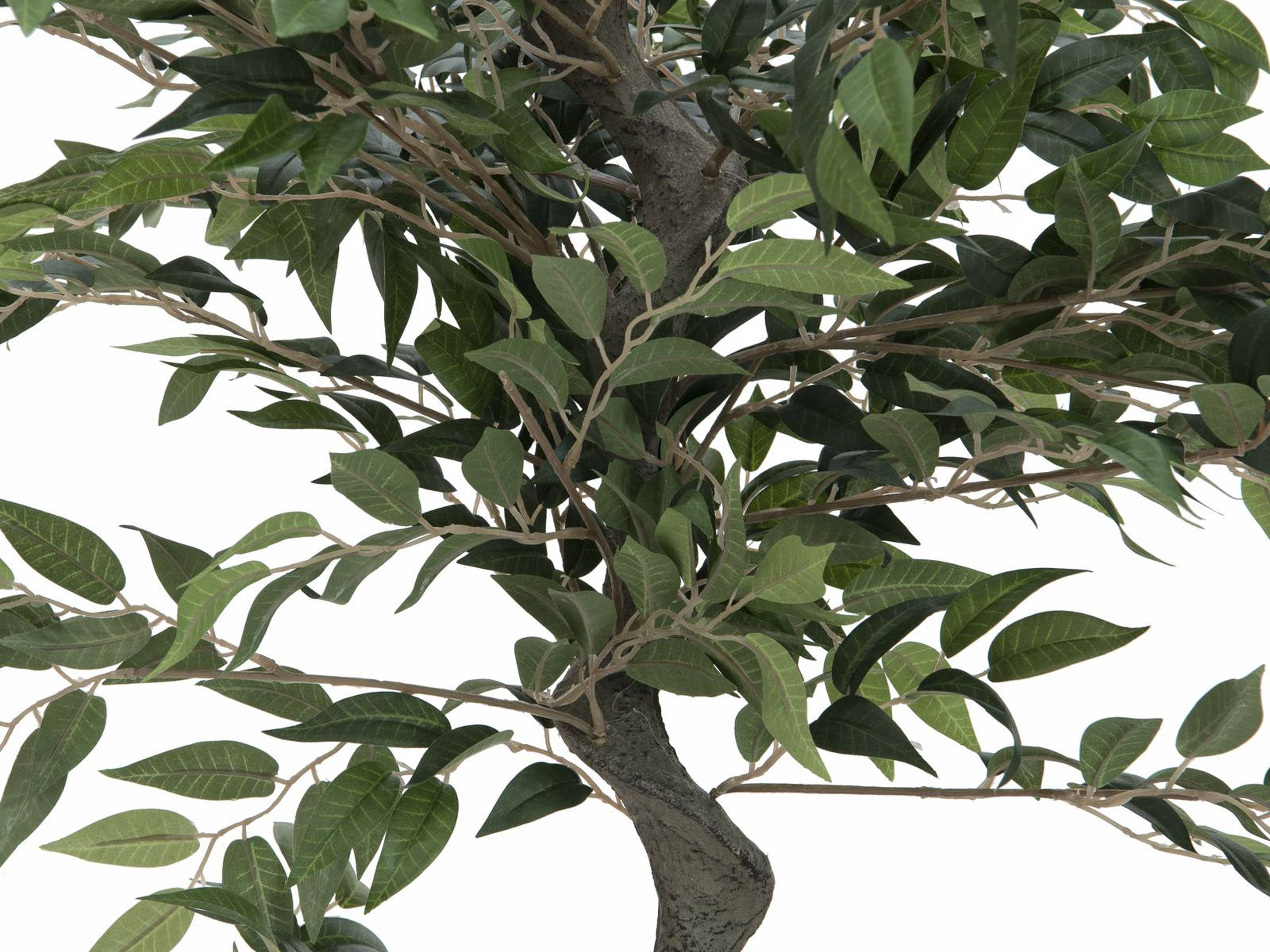 - Pourvue de nombreuses feuilles fidèlement reproduites de couleur vert clair et foncé sur un tronc artificiel brun foncé avec un grain du bois naturel