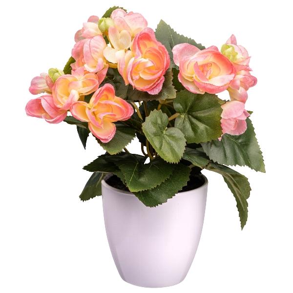Fleur artificielle Bégonia SYLINA, pot décoratif blanc, rose, 25cm