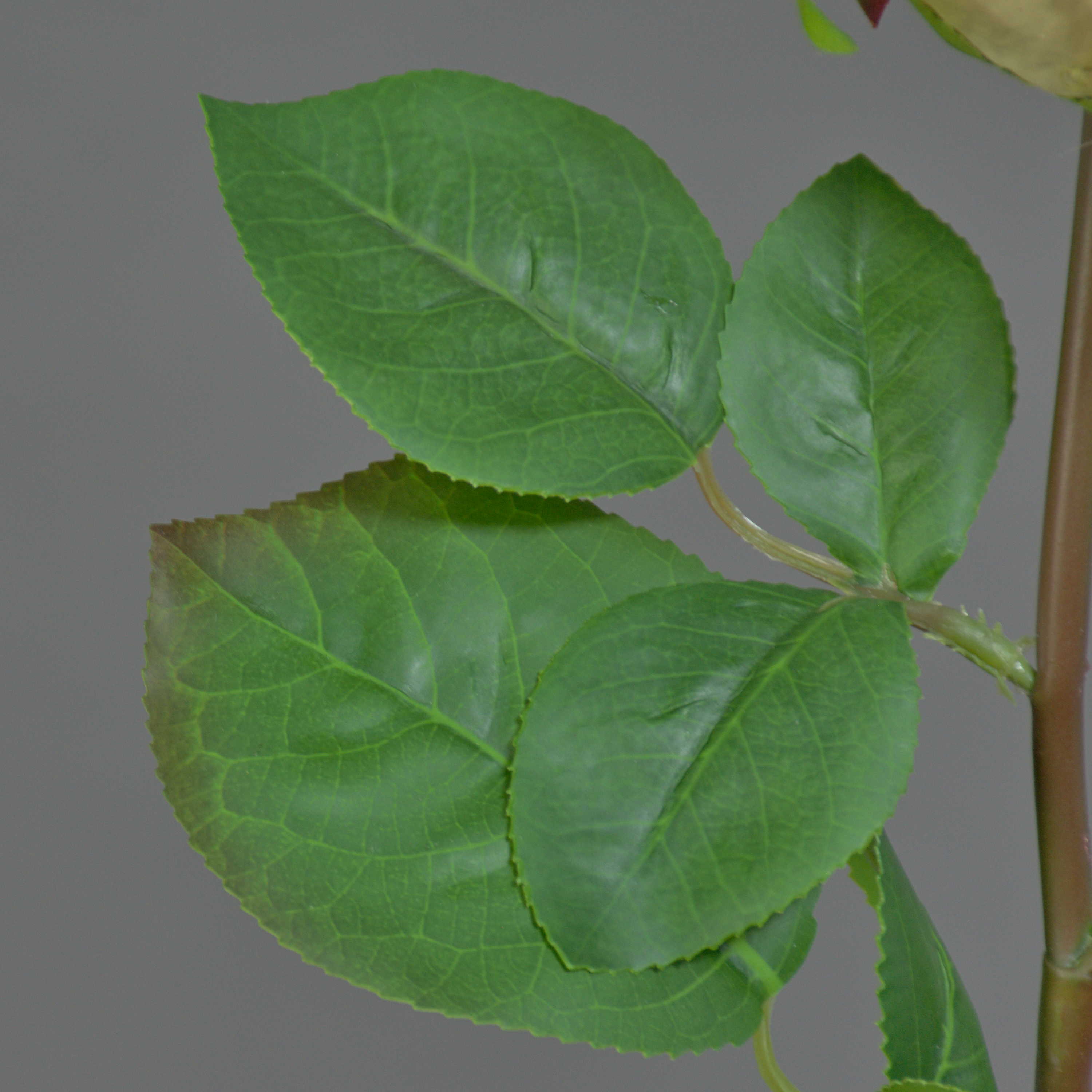 - Les fleurs doubles au toucher naturel se distinguent par leur surface particulière (real touch), les feuilles possèdent un bord dentelé et des veines bien visibles