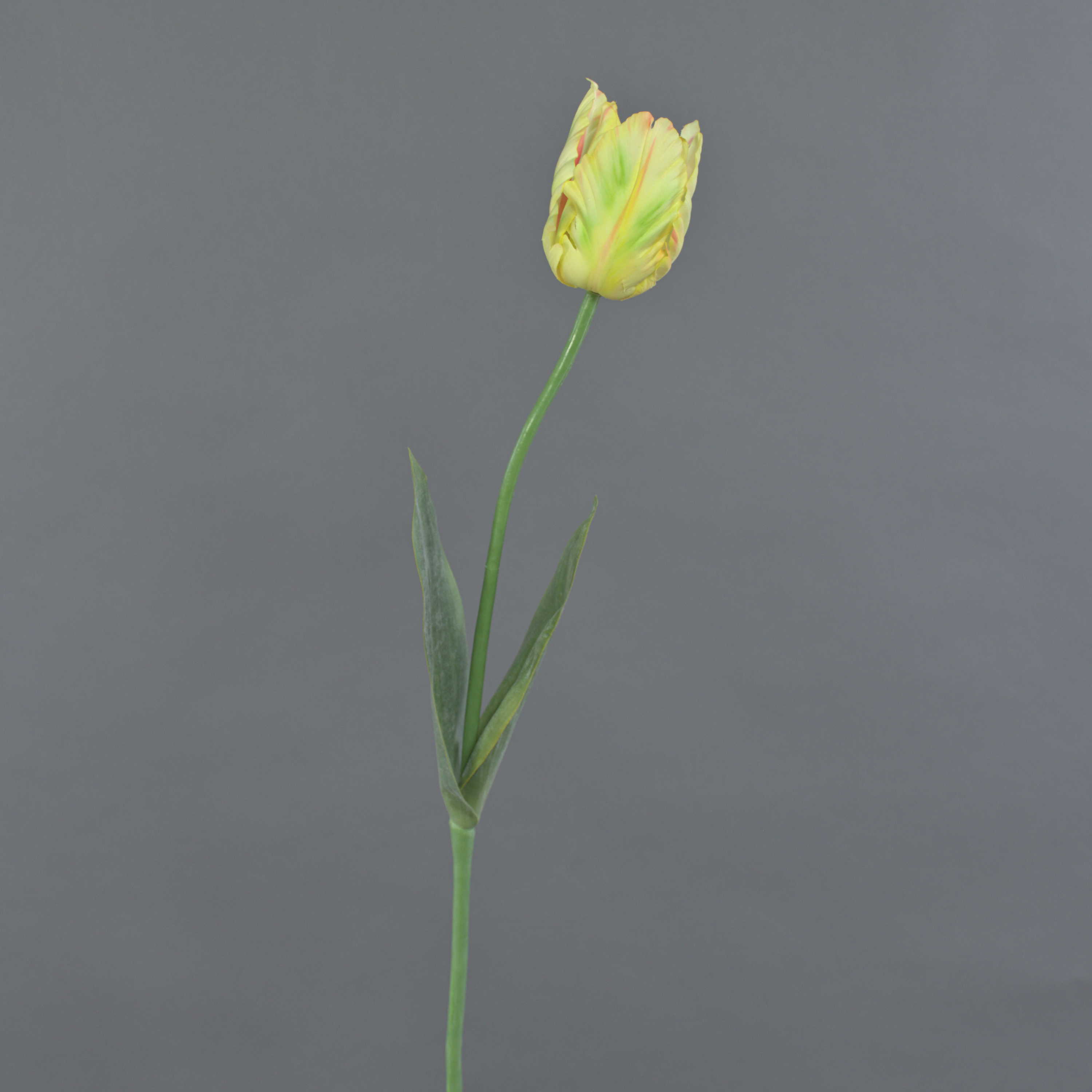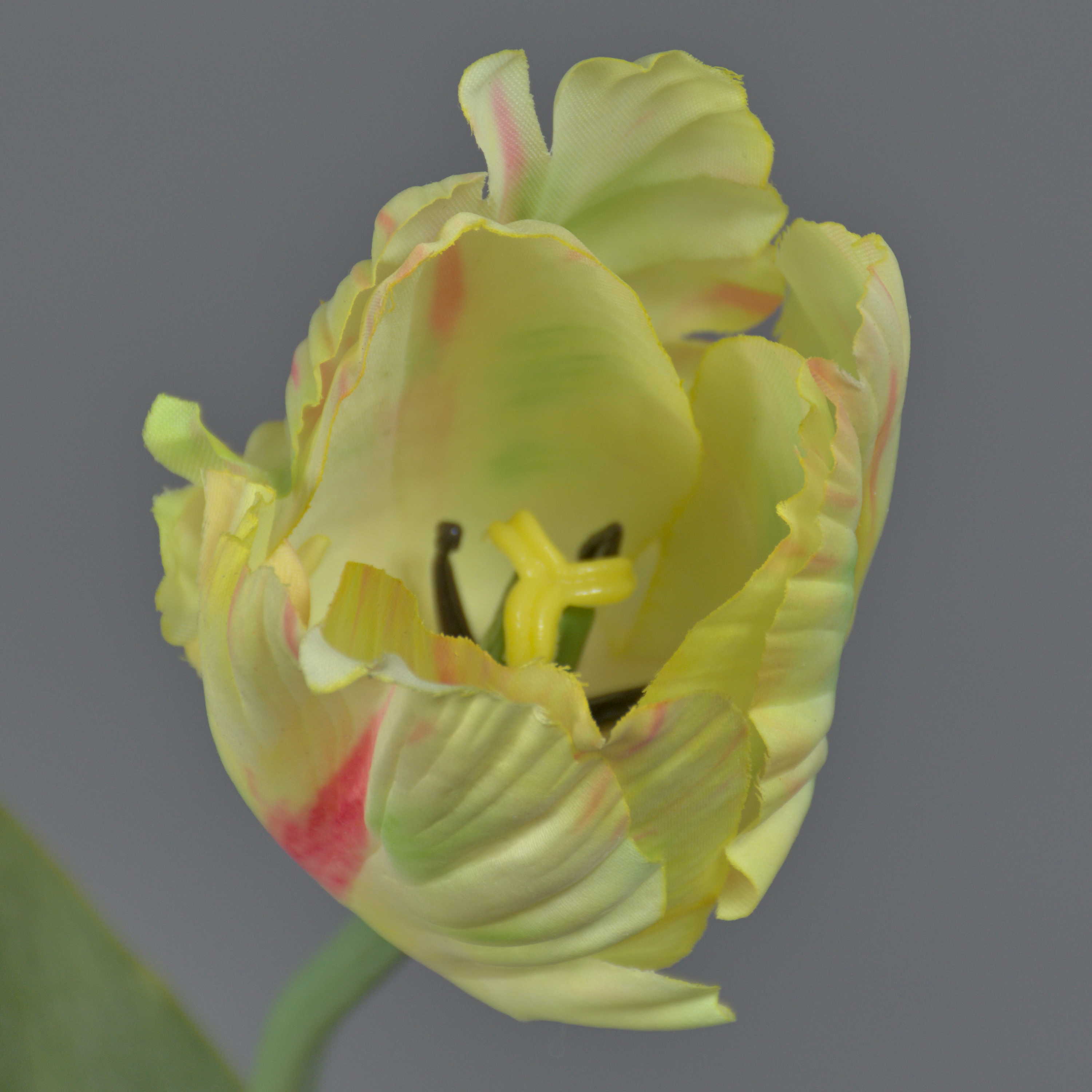 - Les pétales au toucher naturel possèdent un bord ondulé caractéristique d'une tulipe de perroquet et se distinguent par leur surface particulière (real touch), la tige est pourvue de grandes feuilles