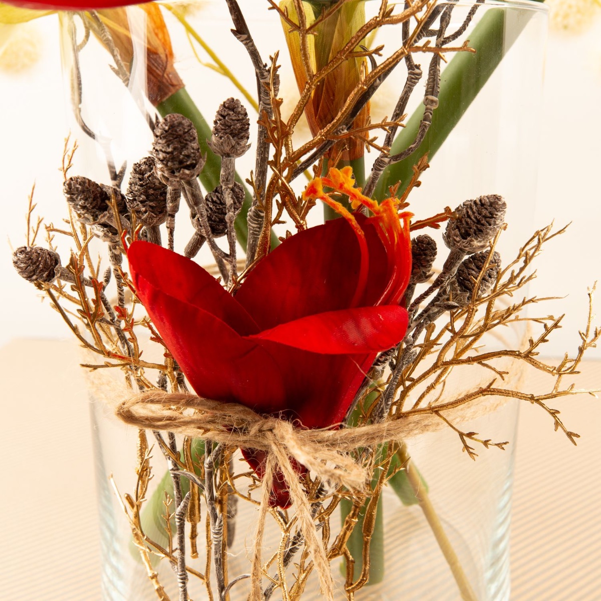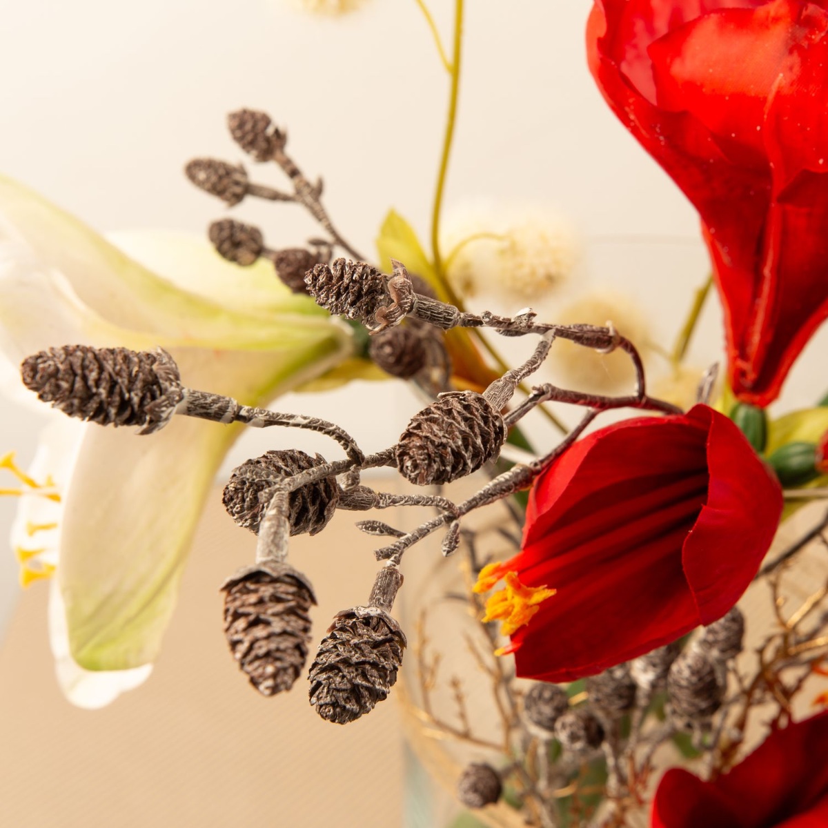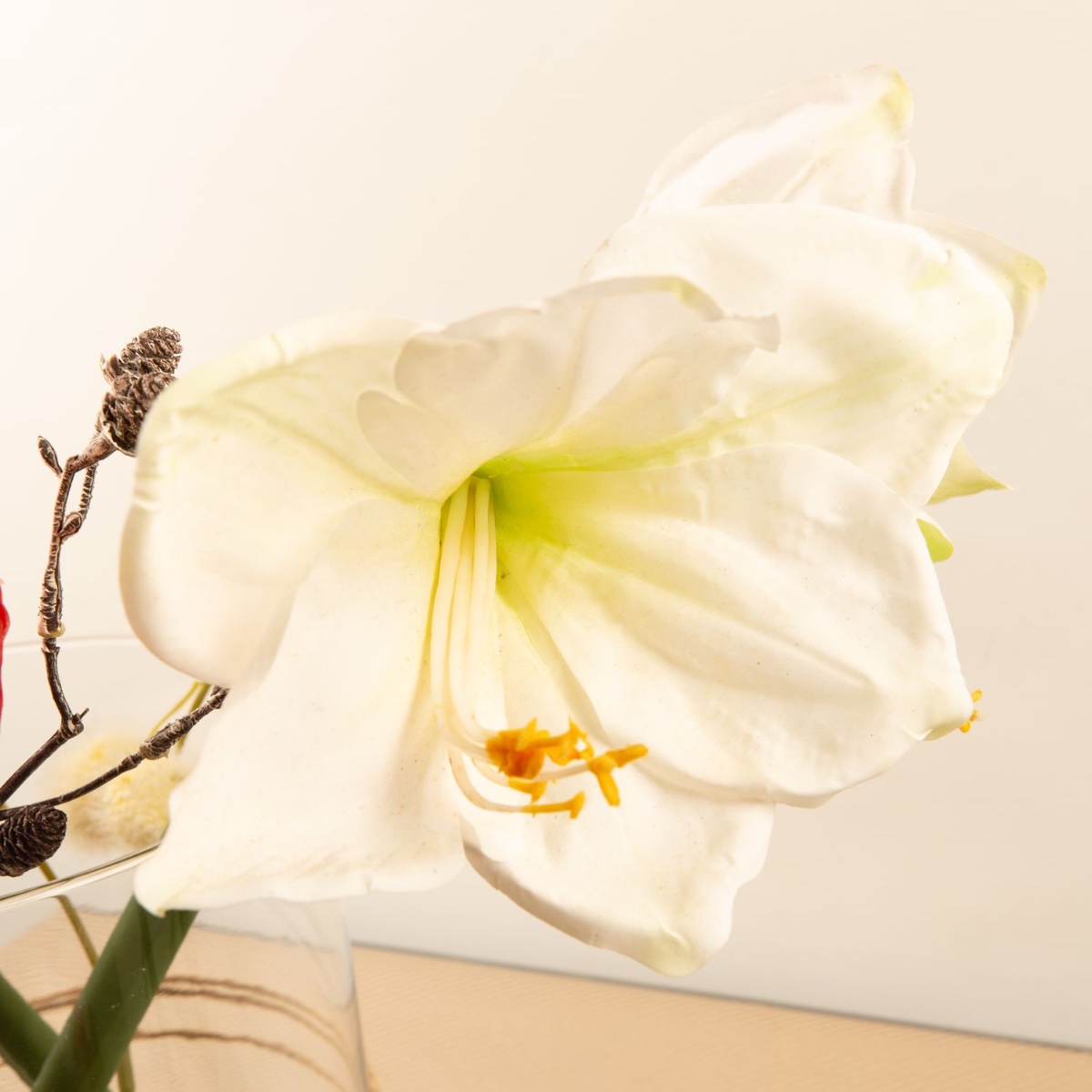 Rouge et blanc ! Les fleurs des amarillis créent une belle ambiance hivernale qui rappelle déjà Noël. Ces fleurs enchantées sont entourées d'une branche qui ressemble à des boules de neige et d'une branche de pomme de pin. Nous avons légèrement décoré le vase Sanya classique. Une superbe décoration pour la période de Noël. Shop the look !