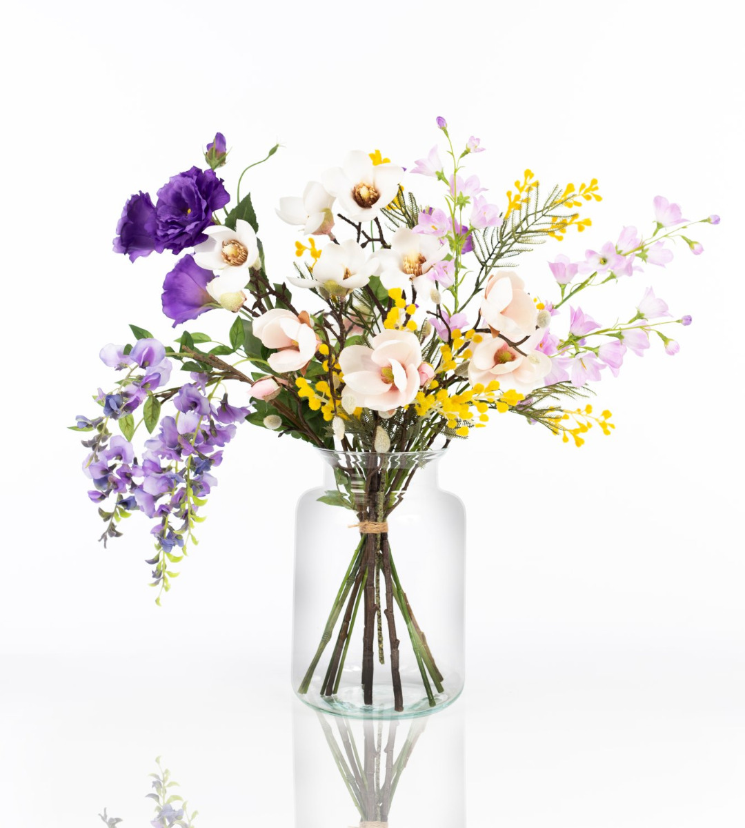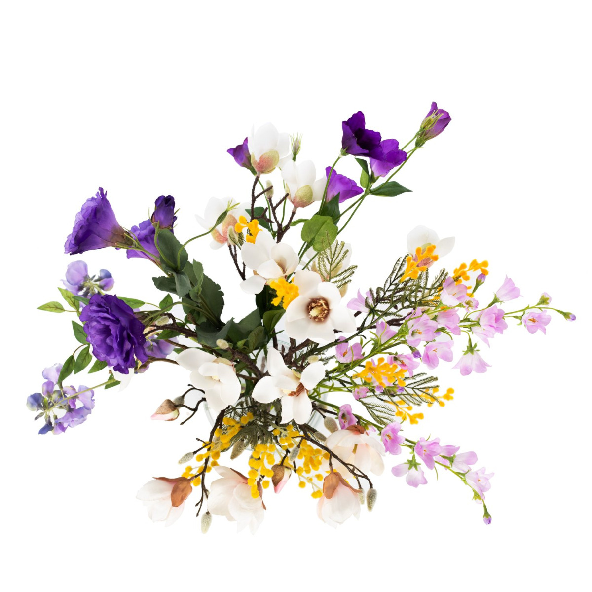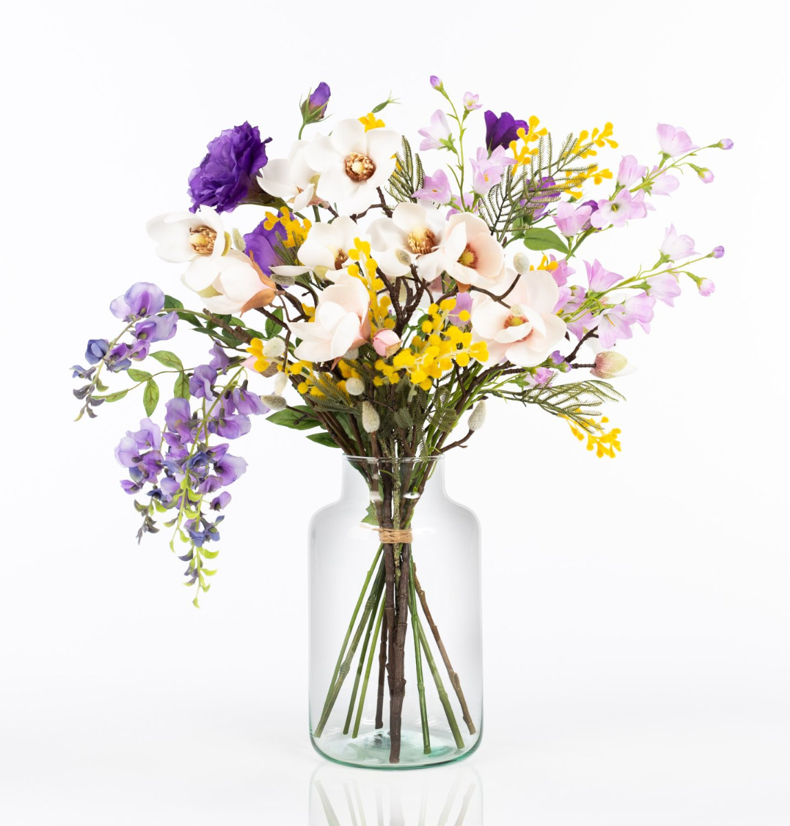 Avec le bouquet coloré CALISSA, tu reçois une salutation florale d'une beauté exceptionnelle. Des glycines rentombantes, des lisianthus luxuriants et de délicates campanules sont complétés par de délicates branches de magnolia. Les petites fleurs du mimosa jaune apportent encore la touche finale au bouquet en surgissant avec audace entre les grandes fleurs.
