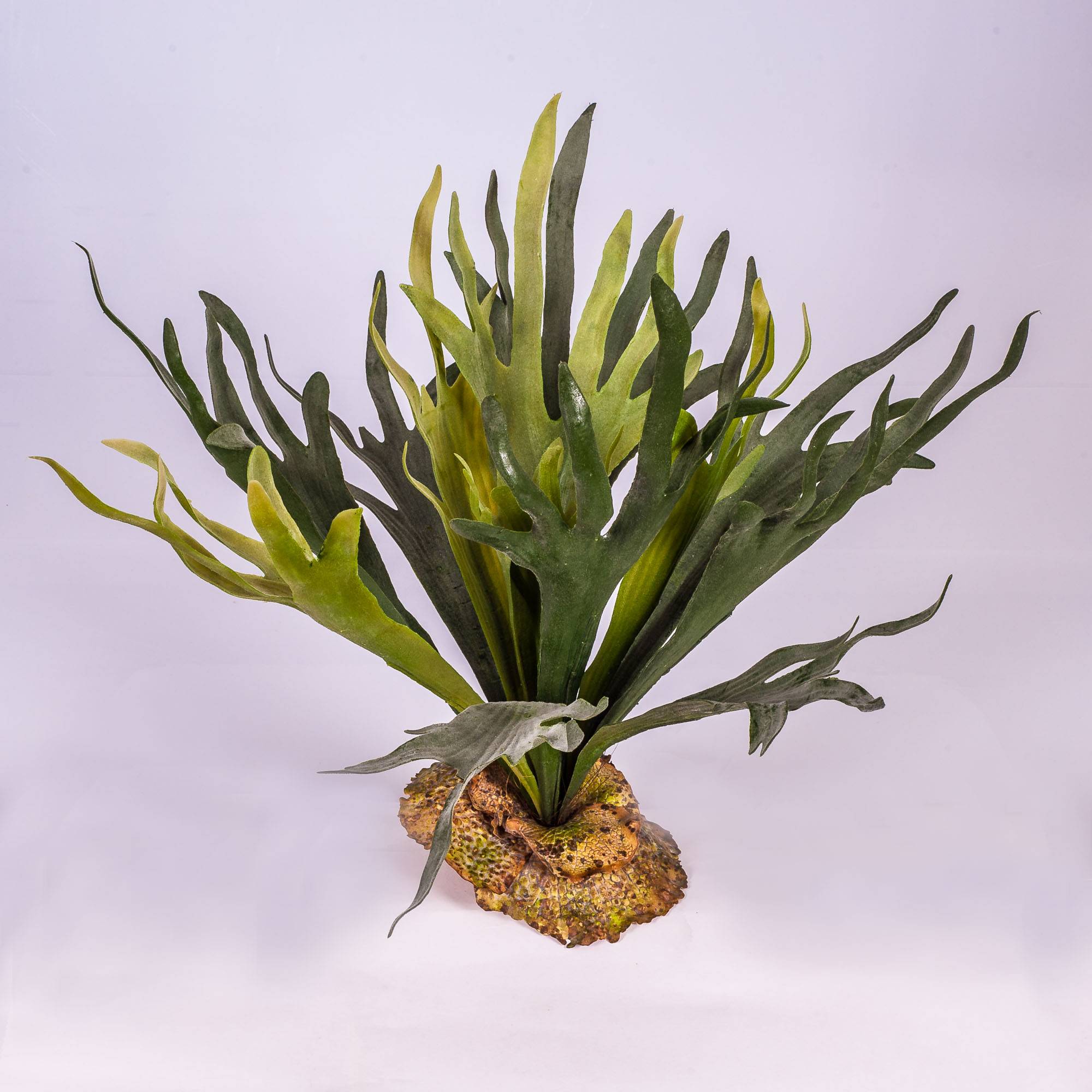 Fougère platycerium décorative sur piquet pourvue de 14 frondes/feuilles et mesurant environ 45 cm de long. Le diamètre de cette fougère artificielle est d’environ 80 cm.