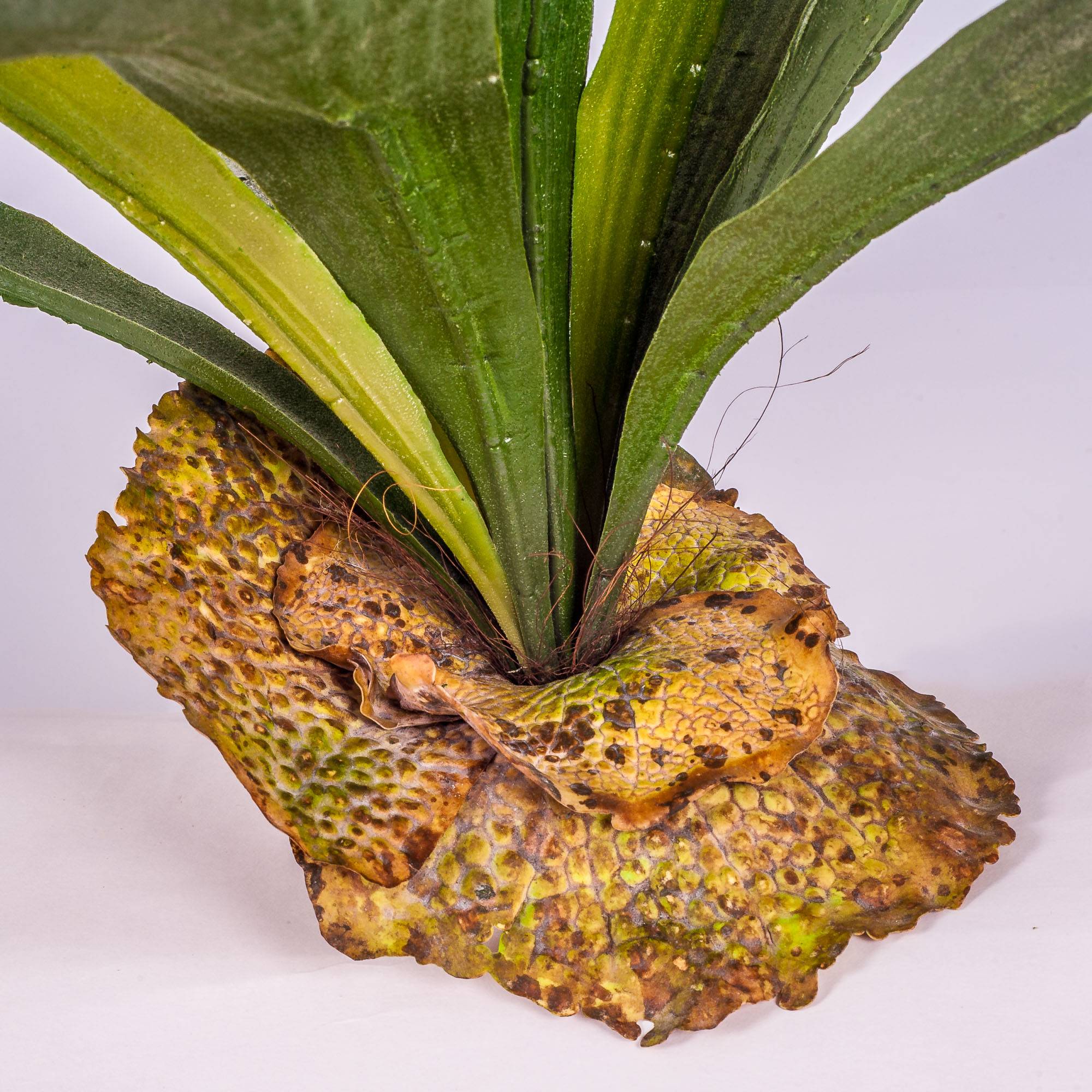 - Avec 14 feuilles/frondes de couleur verte, deux feuilles brunes rondes à la base