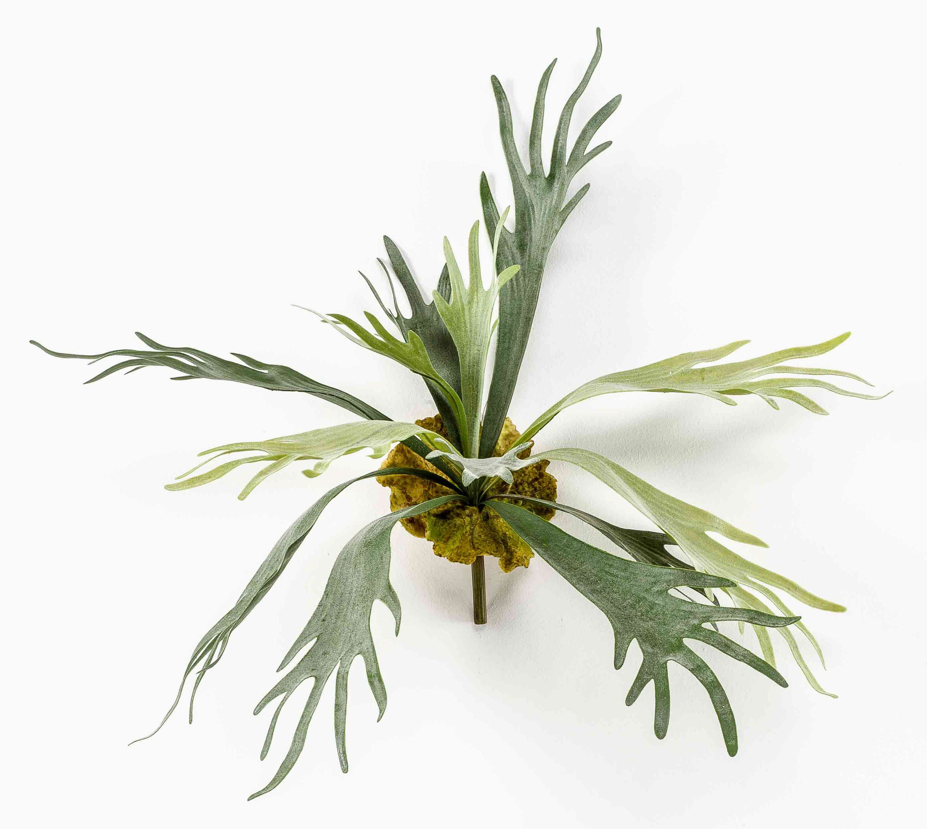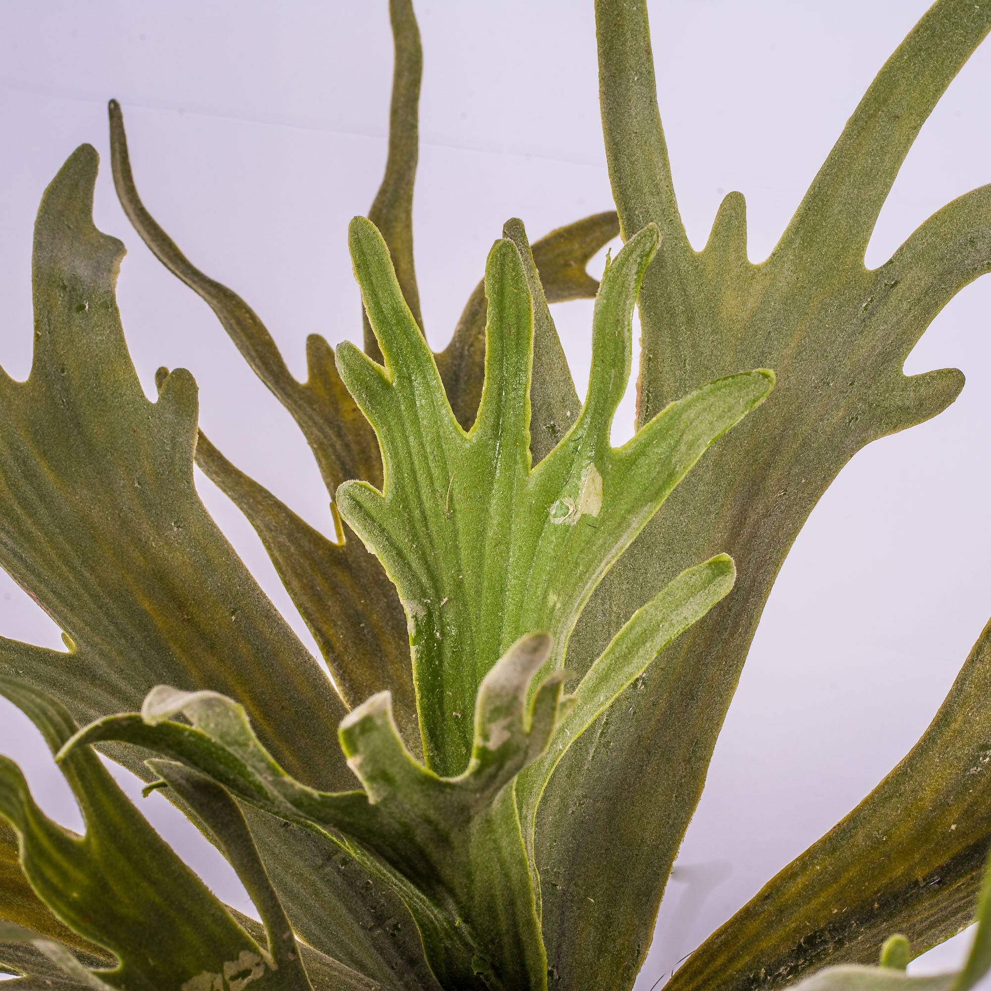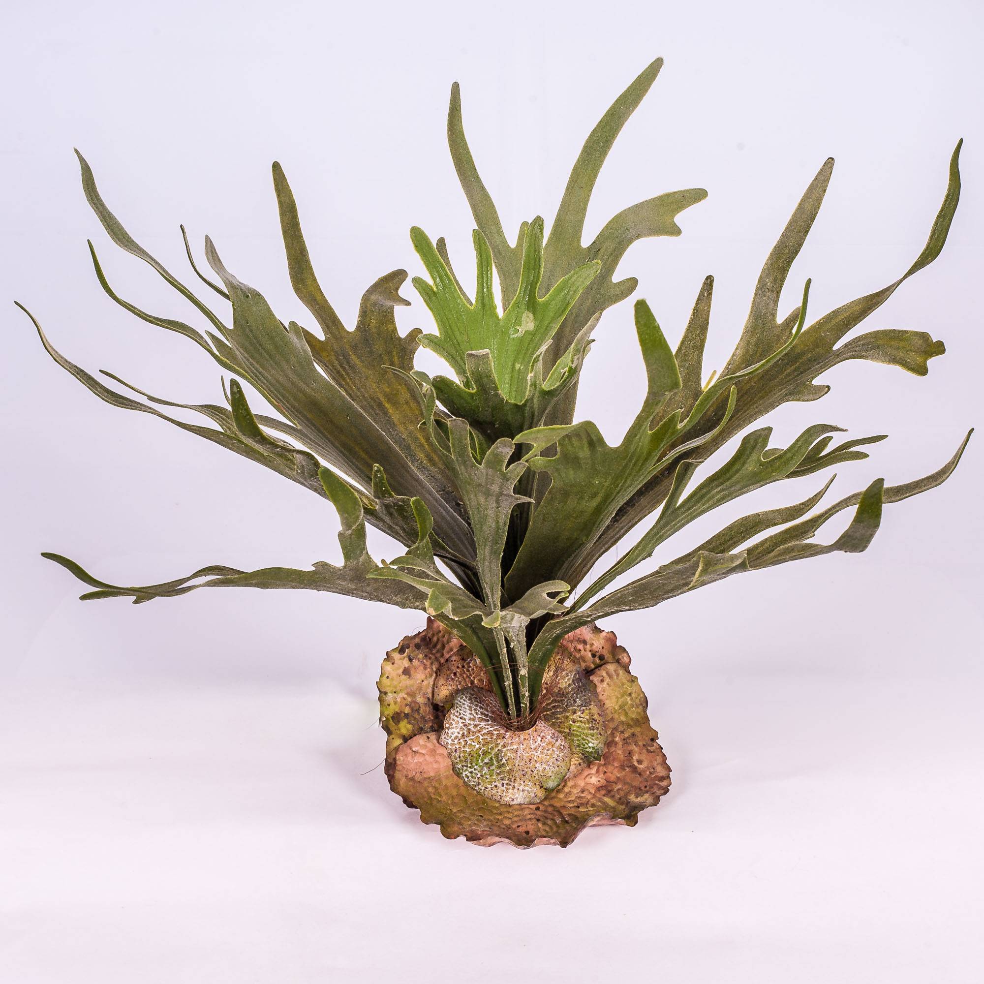 Fougère platycerium décorative sur piquet pourvue de 13 frondes/feuilles et mesurant environ 50 cm de long. Le diamètre de cette fougère artificielle est d’environ 70 cm.