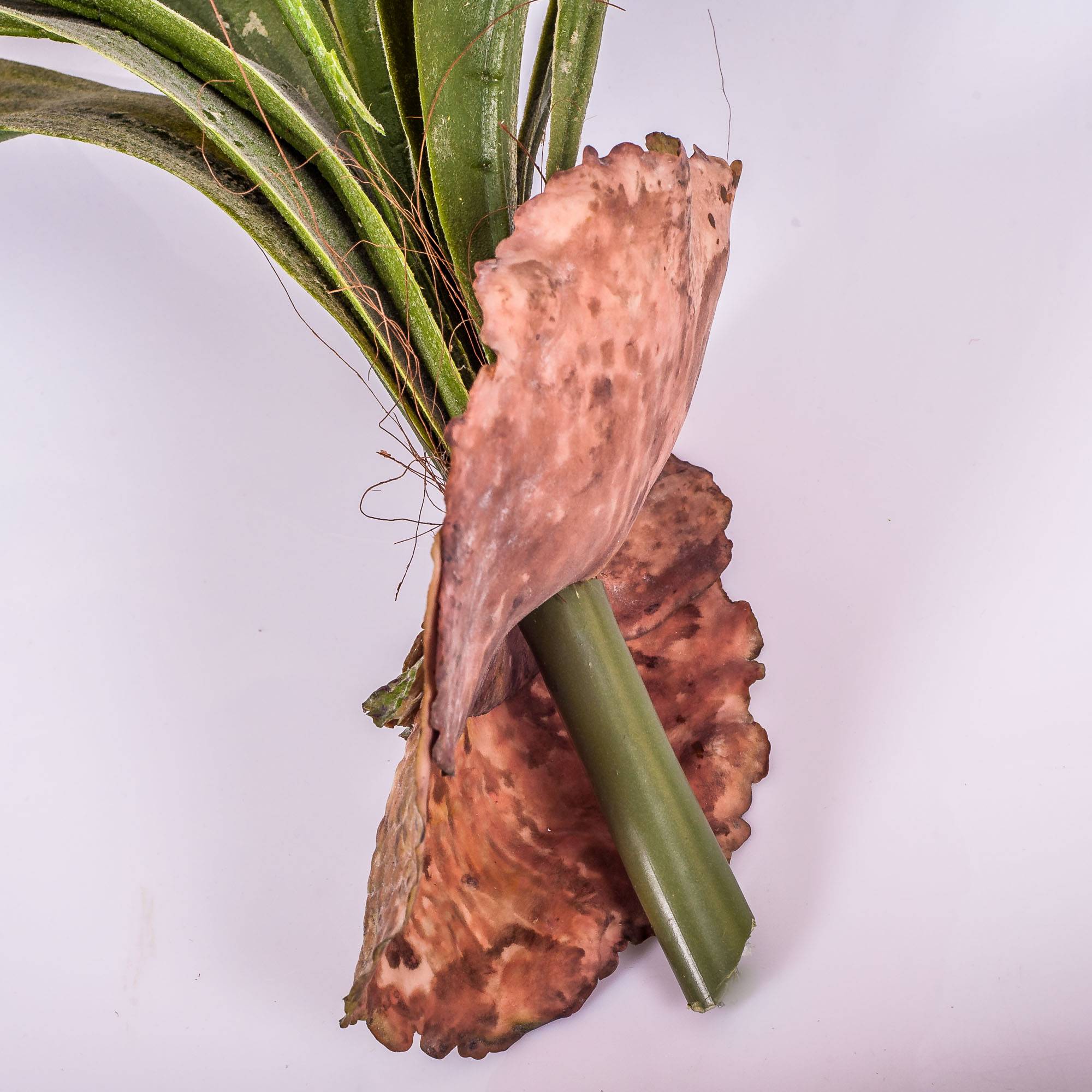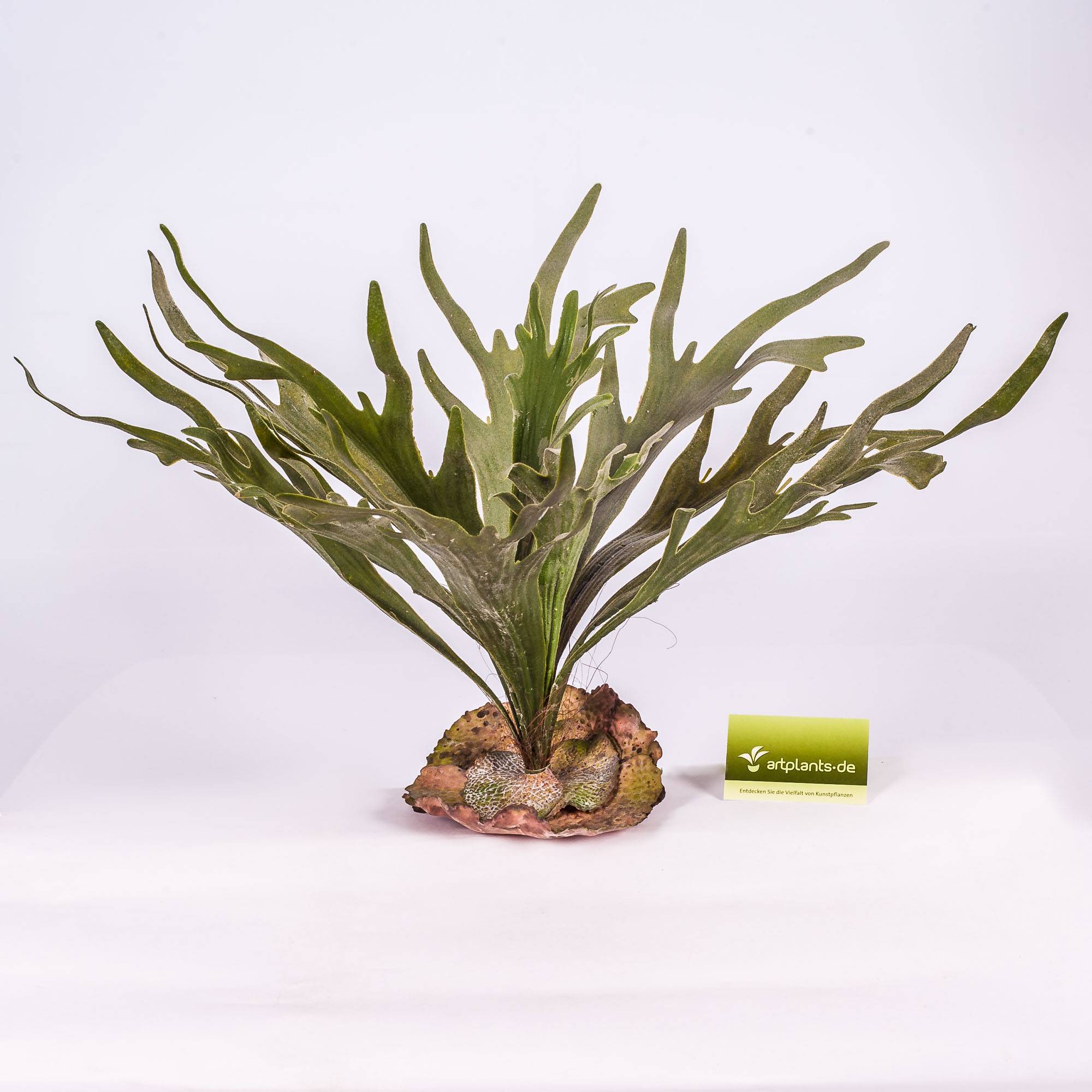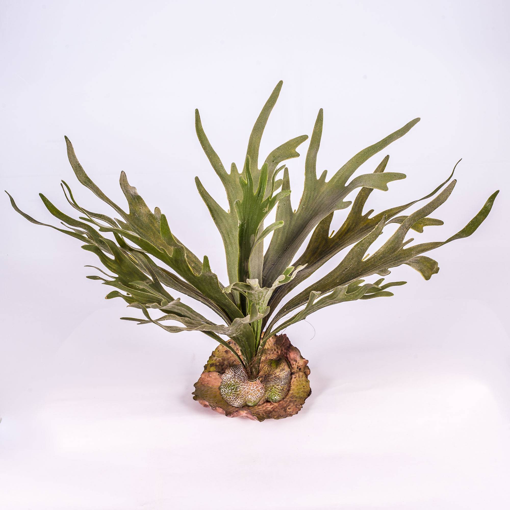 Fougère platycerium décorative sur piquet pourvue de 13 frondes/feuilles et mesurant environ 50 cm de long. Le diamètre de cette fougère artificielle est d’environ 70 cm.