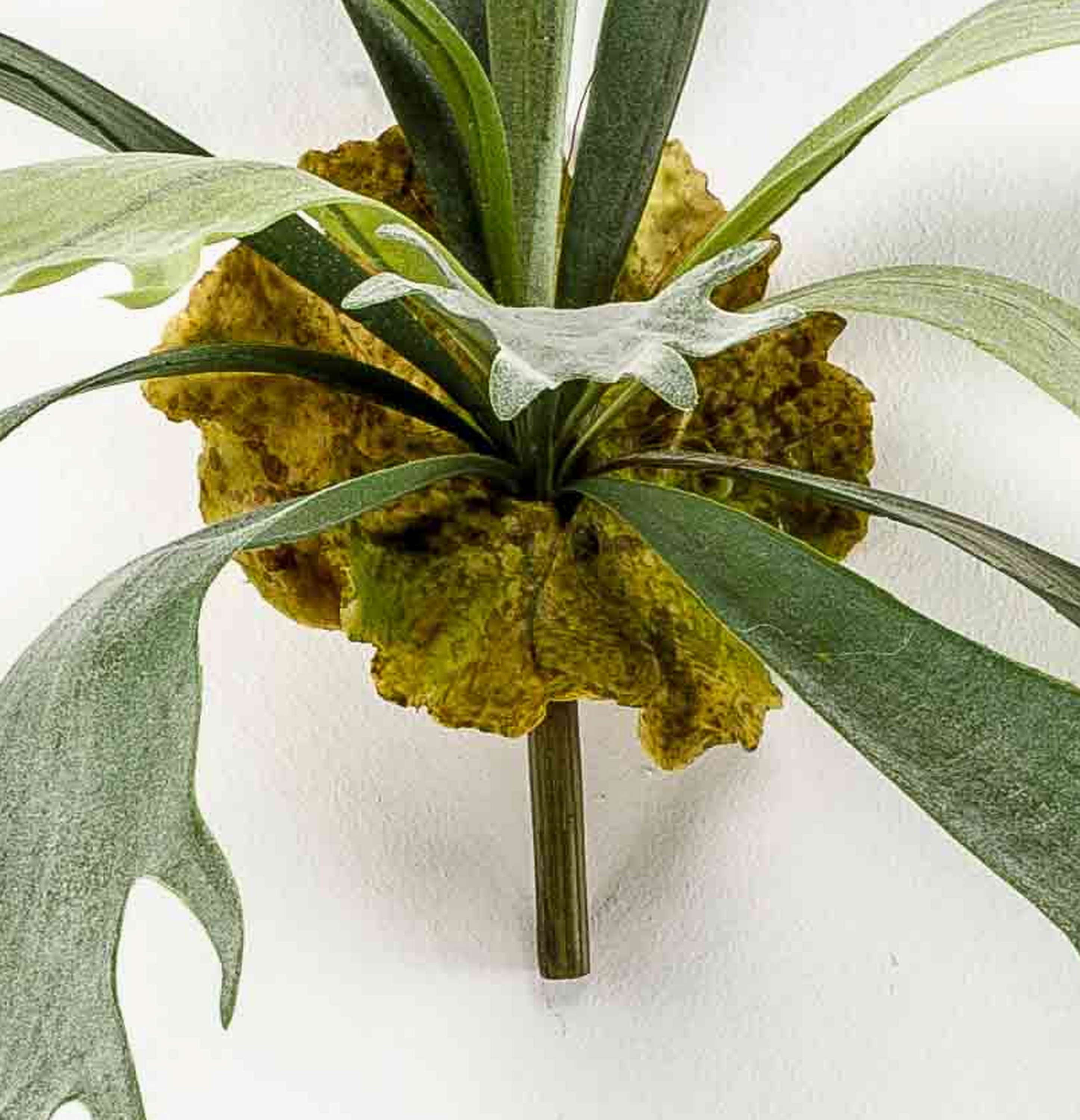 - Avec 13 feuilles/frondes de couleur vert clair et foncé, quelques feuilles brunes rondes à la base