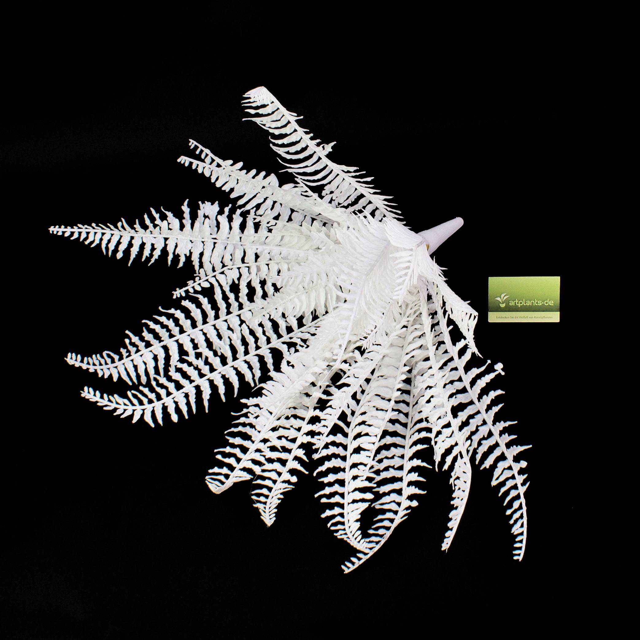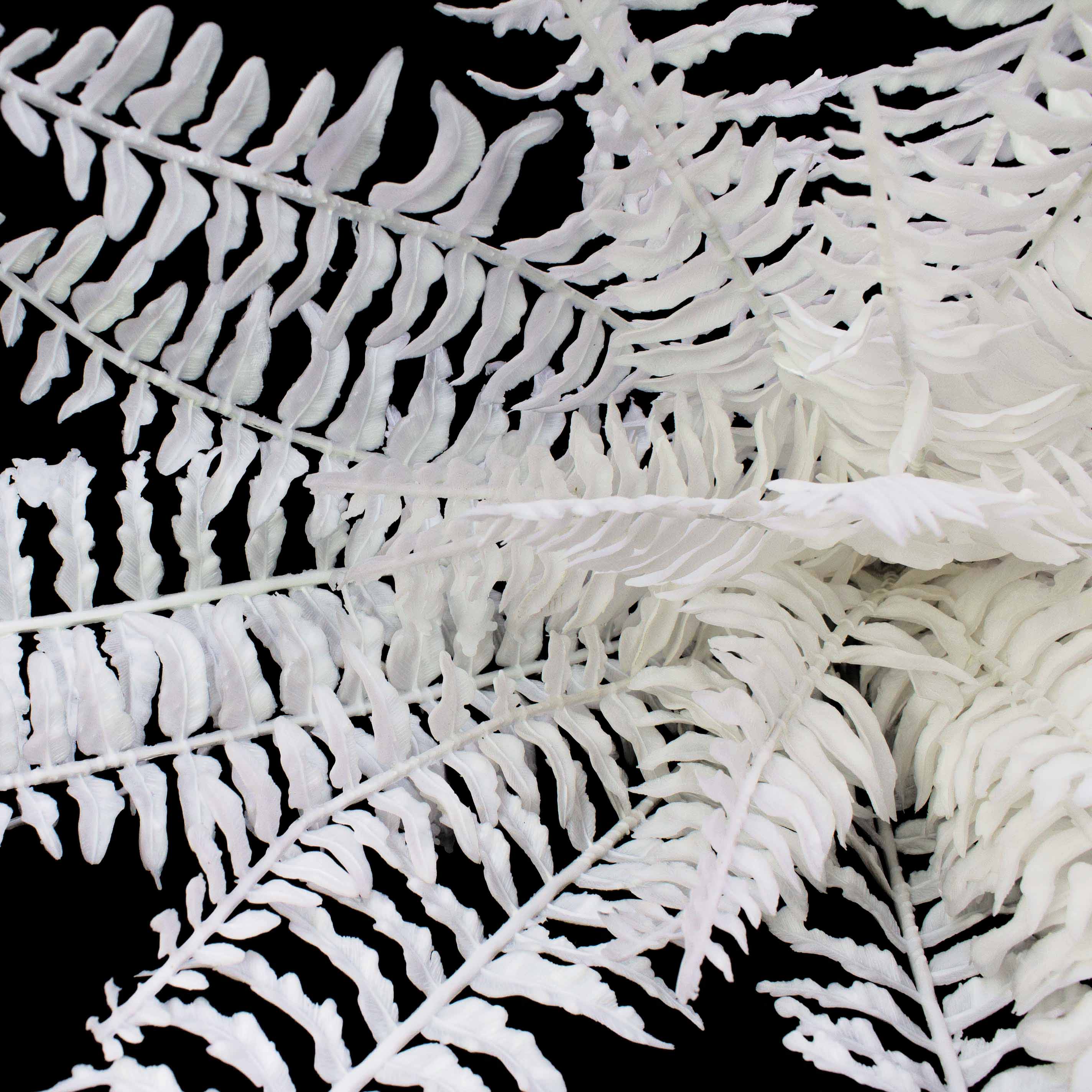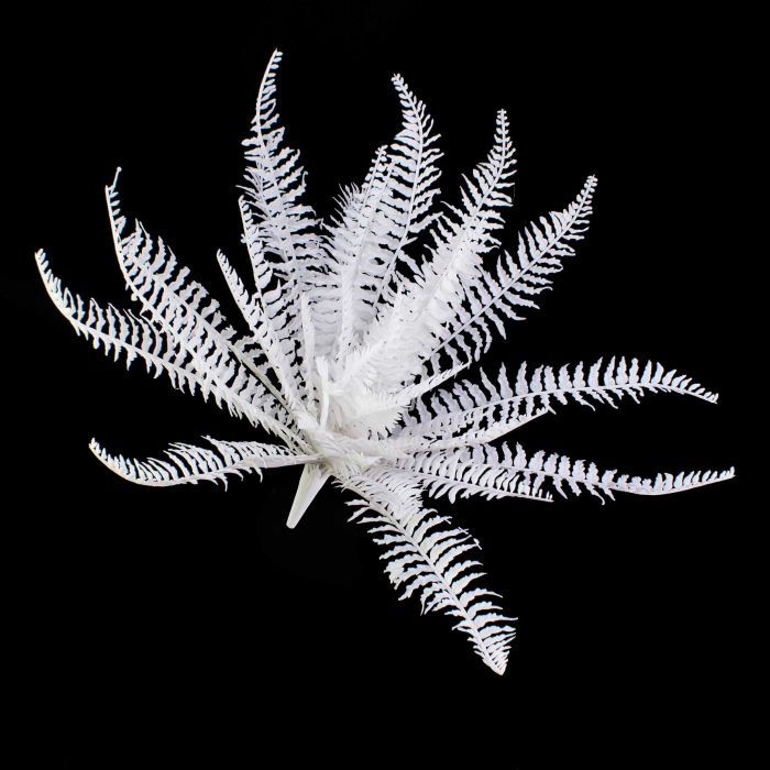 Fougère décorative pourvue de 36 feuilles. Fougère artificielle de couleur blanche (les feuilles ne sont pas réactives aux rayons UV), particulièrement adaptée pour une décoration originale.
