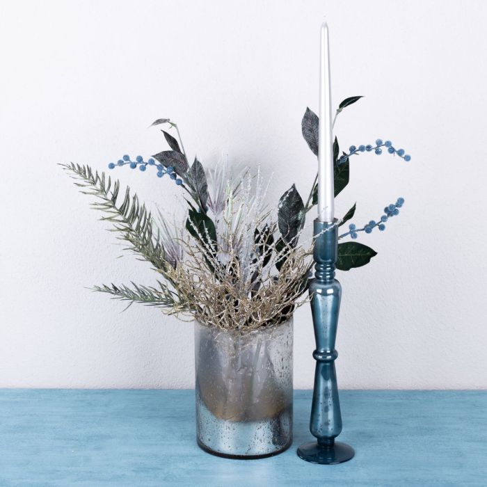 Le bleu glacé et l'argent ! Avec ce look à l'aspect glacé, nous voulions faire quelque chose pour l'hiver qui ne ressemble pas à Noël et qui crée pourtant une ambiance agréable. Le chandelier brille d'un magnifique bleu et ses taches sombres donnent l'impression qu'il s'agit d'une pièce antique. Le verre cylindrique argenté et brillant au design vintage s'y accorde parfaitement. Des branches scintillantes, comme la branche de corail et les baies bleues, complètent parfaitement ce look et conviennent super bien pour une décoration de Nouvel An. Shop the look!