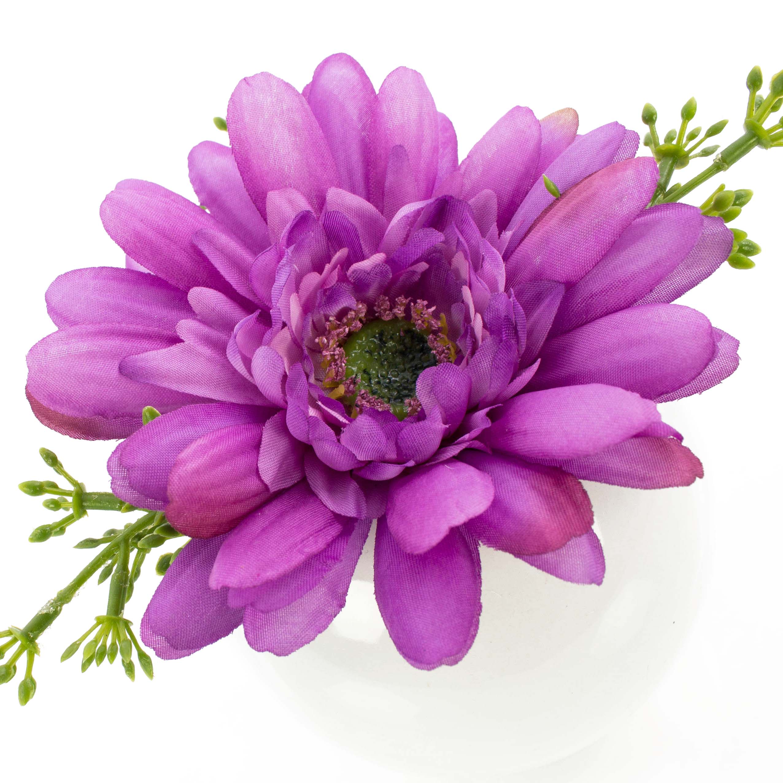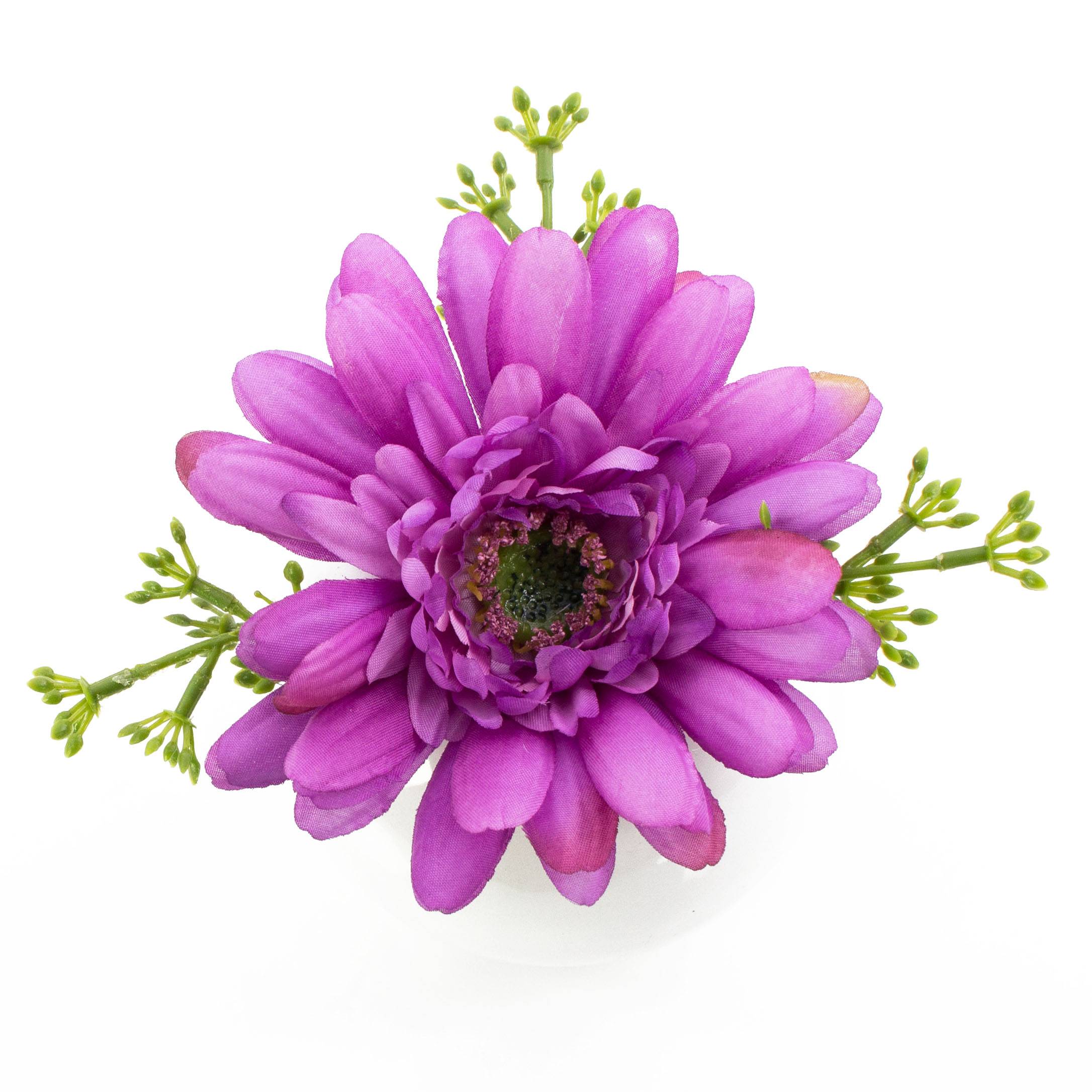 - Orné d'une fleur de gerbera de couleur lilas ainsi que de trois branches vertes