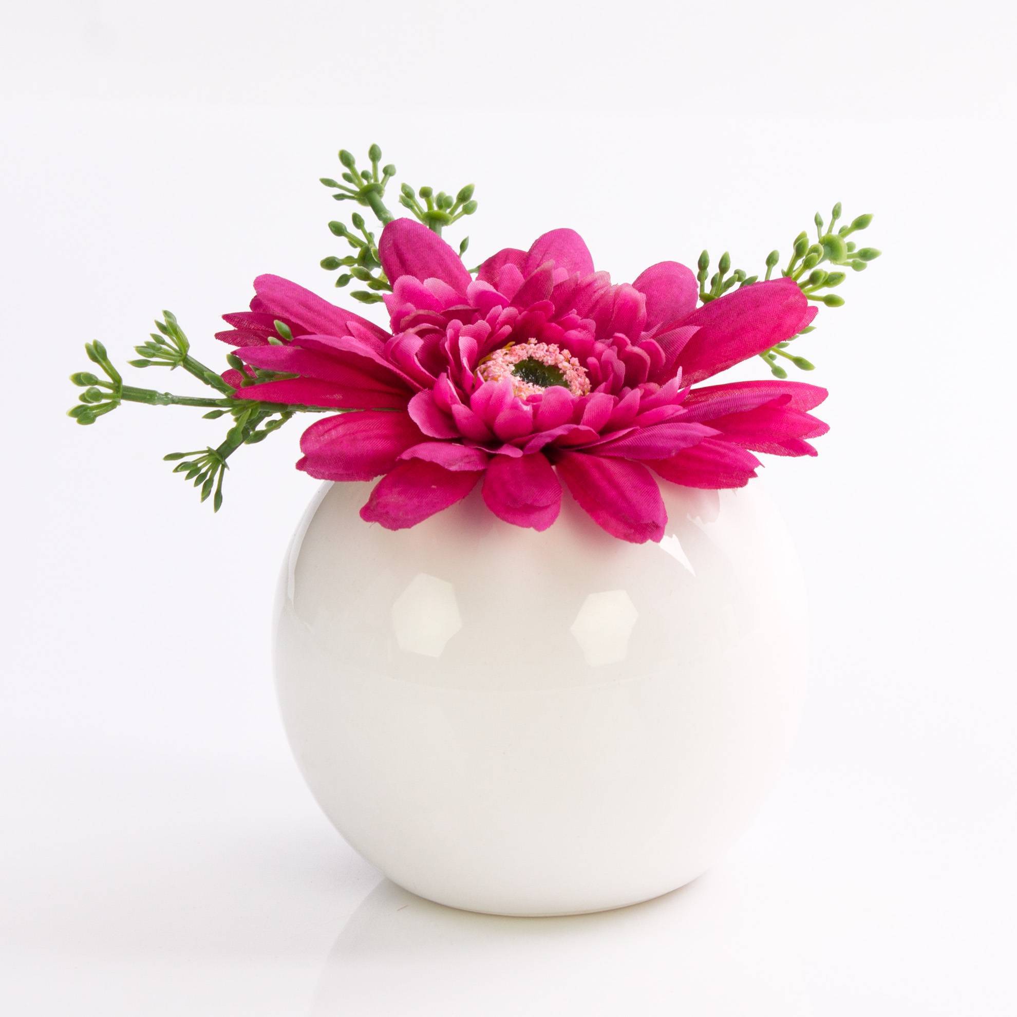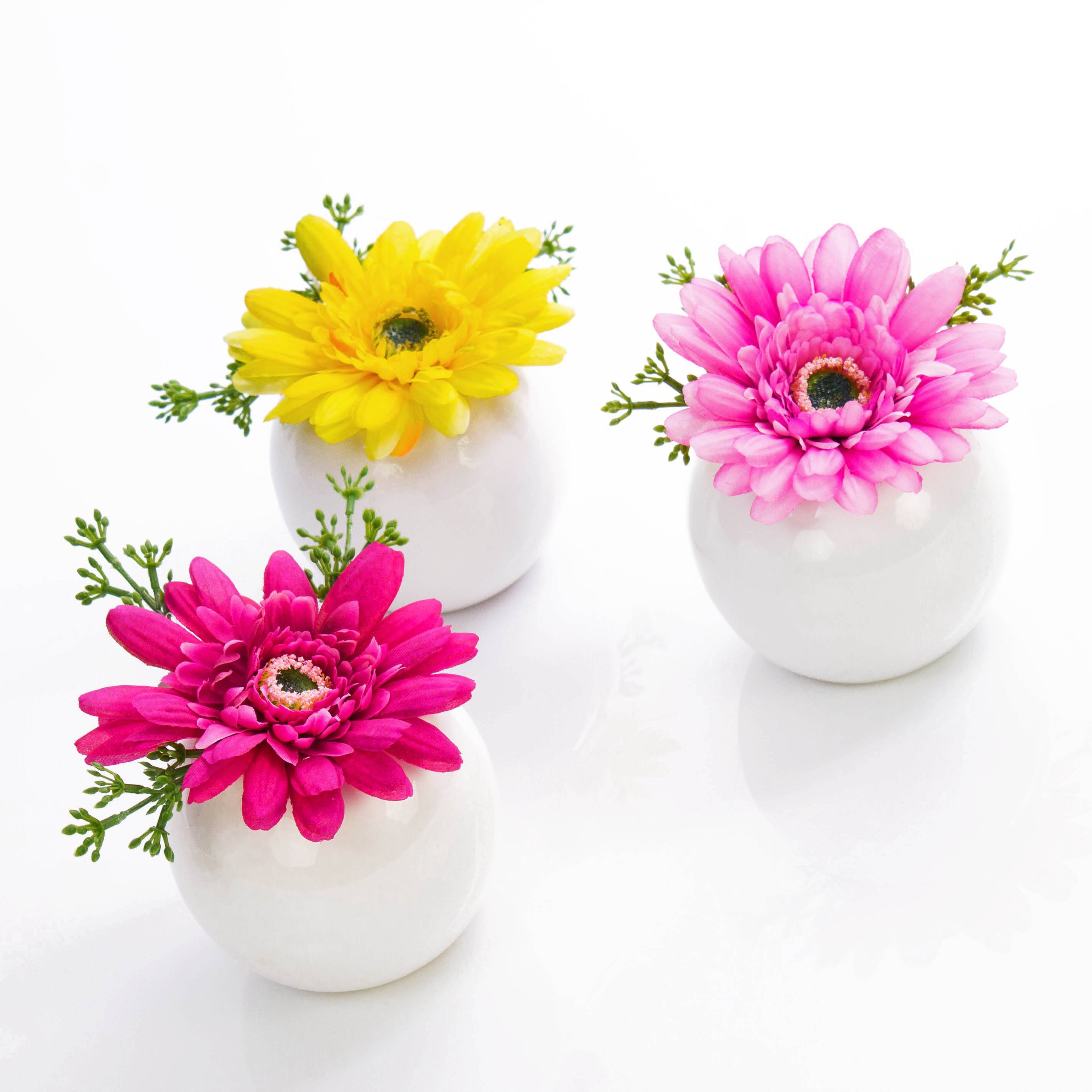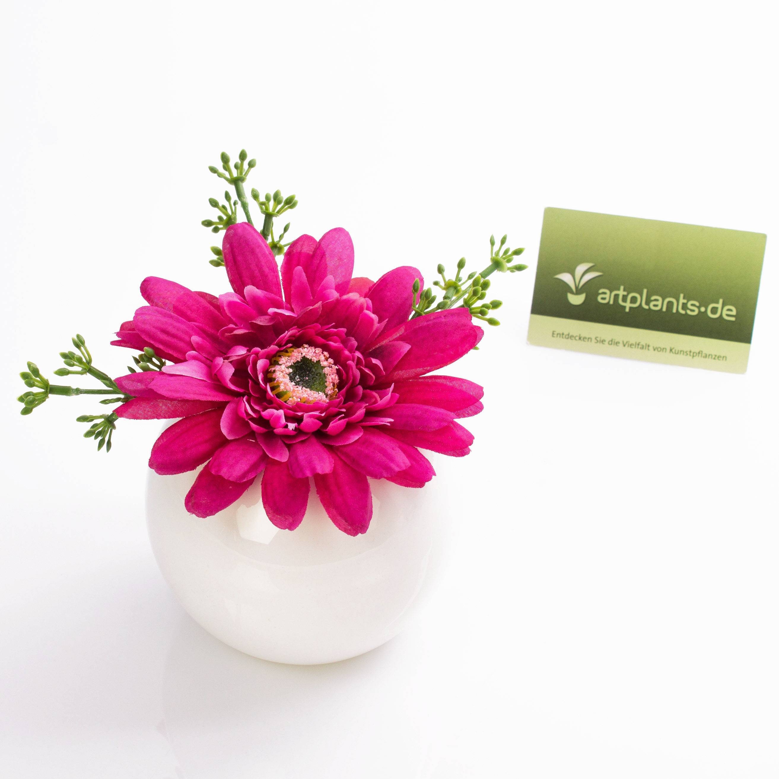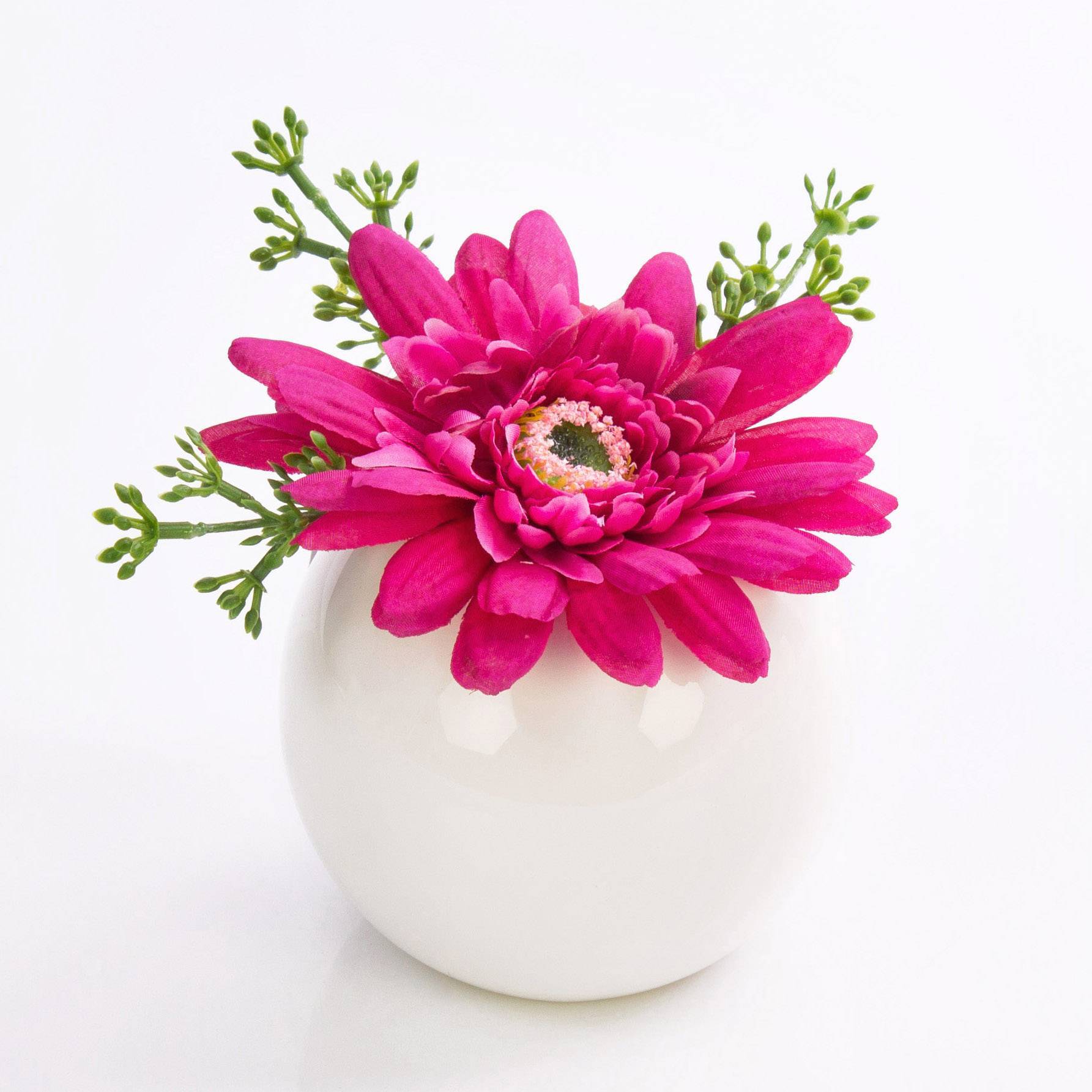 Ce joli arrangement artificiel IMINA se compose de gerberas et de branches vertes et mesure au total environ 12 cm de haut.