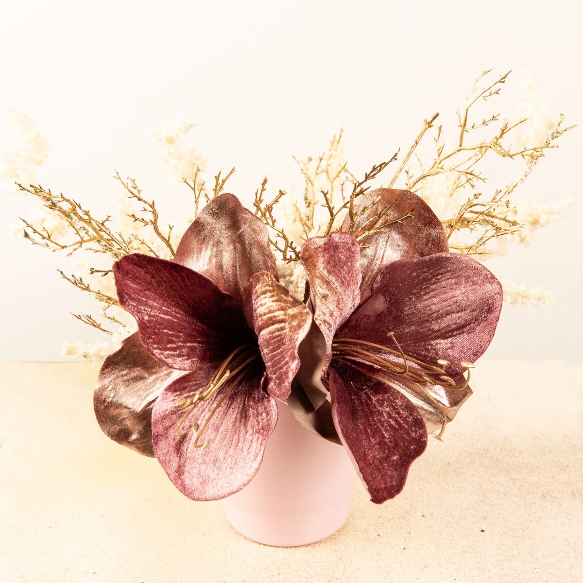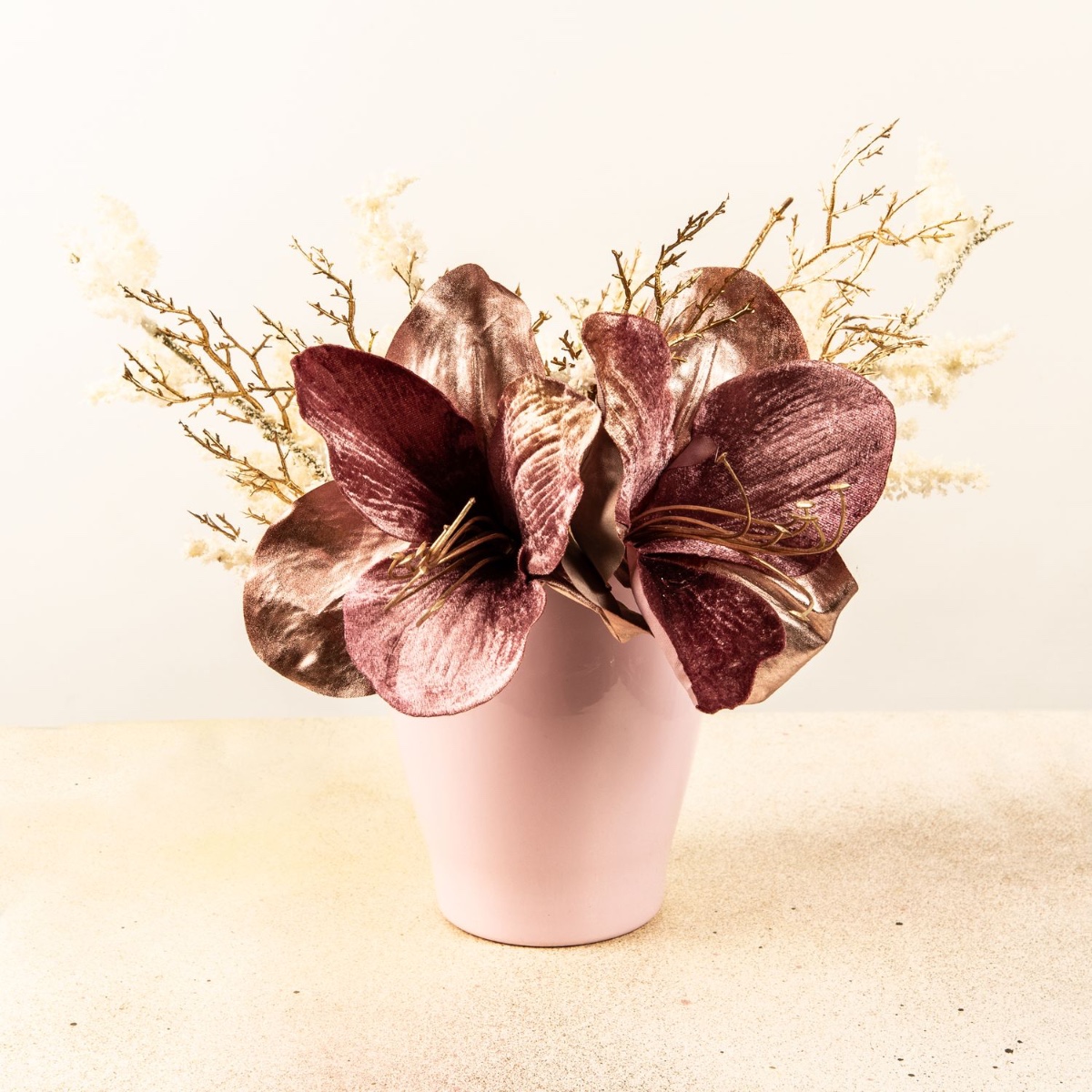 Rose et or ! Une combinaison glamour qui convient particulièrement bien à la période festive. Le pot rose de l'orchidée s'harmonise parfaitement avec les amarillis veloutés, qui symbolisent l'affection et l'amitié. Les branches dorées et enneigées apportent encore plus d'éclat à ce look et mettent les fleurs en valeur. Shop the Look !