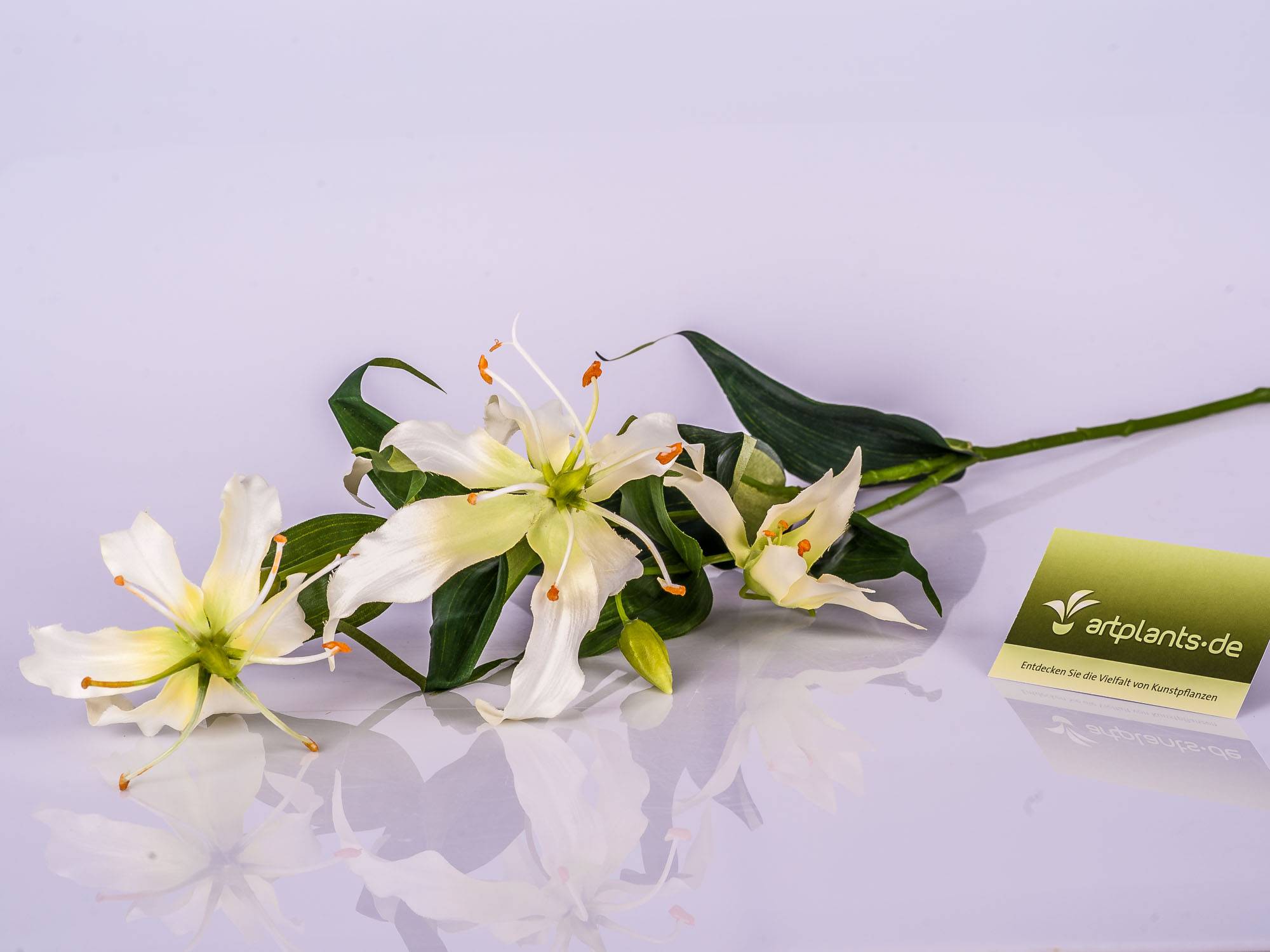 Fausse Gloriosa pourvue de 2 fleurs blanc crème en fibre textile. Cette jolie fleur artificielle mesure au total environ 80 cm de long.