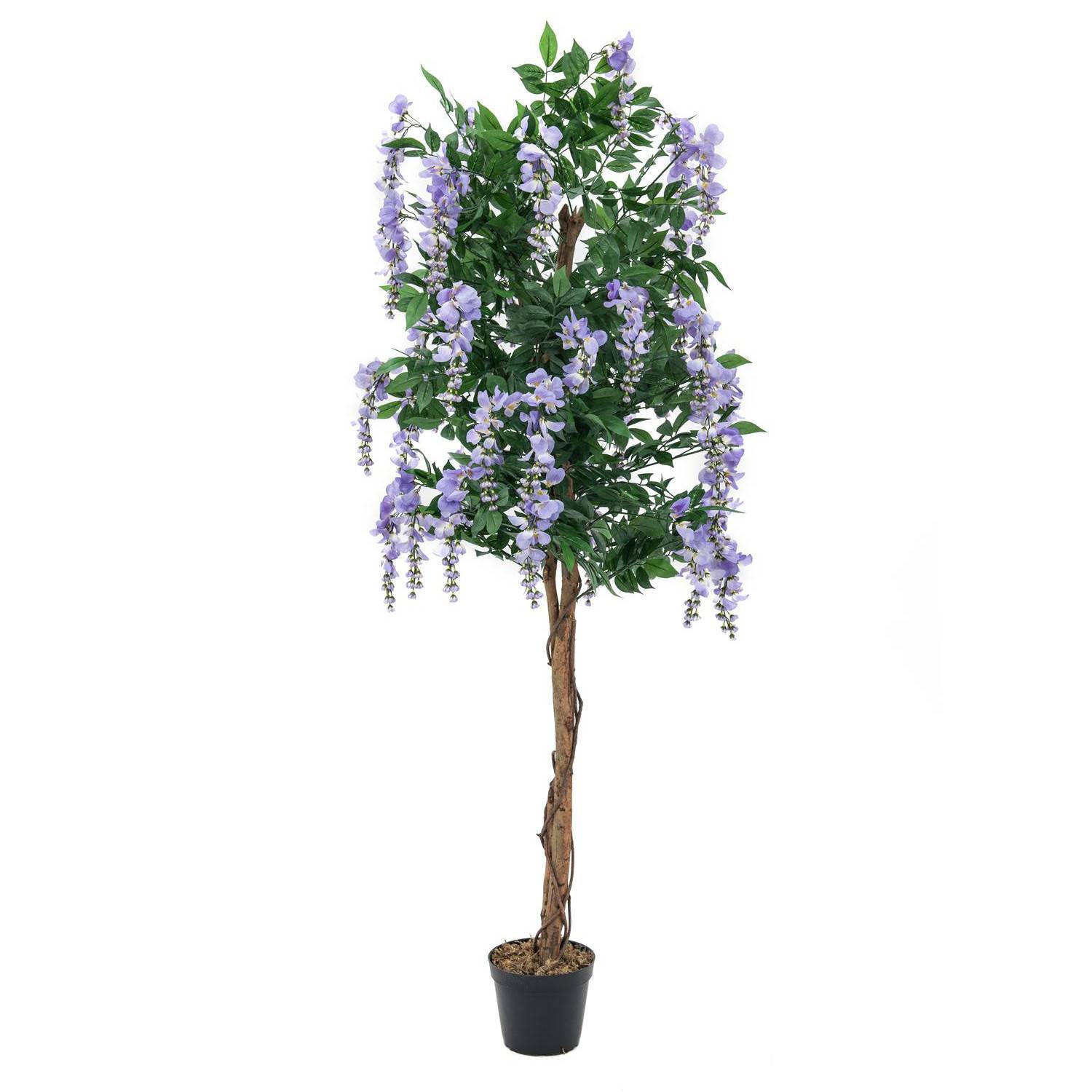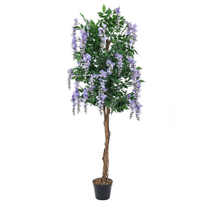 Glycine artificielle en pot pourvue de 3 troncs et mesurant au total environ 180 cm de haut. Cet arbre décoratif est orné d'environ 1000 fleurs violettes et 2020 feuilles.