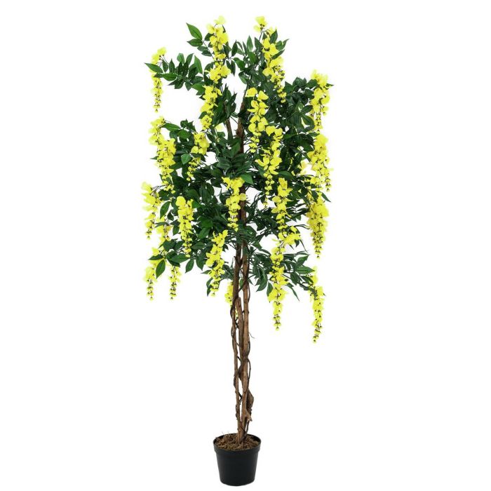 Jolie glycine artificielle ornée d'environ 820 fleurs jaunes et 1370 feuilles. Cette plante artificielle en pot est constituée de 3 troncs entourés de quelques lianes et mesure au total environ 150 cm de haut.