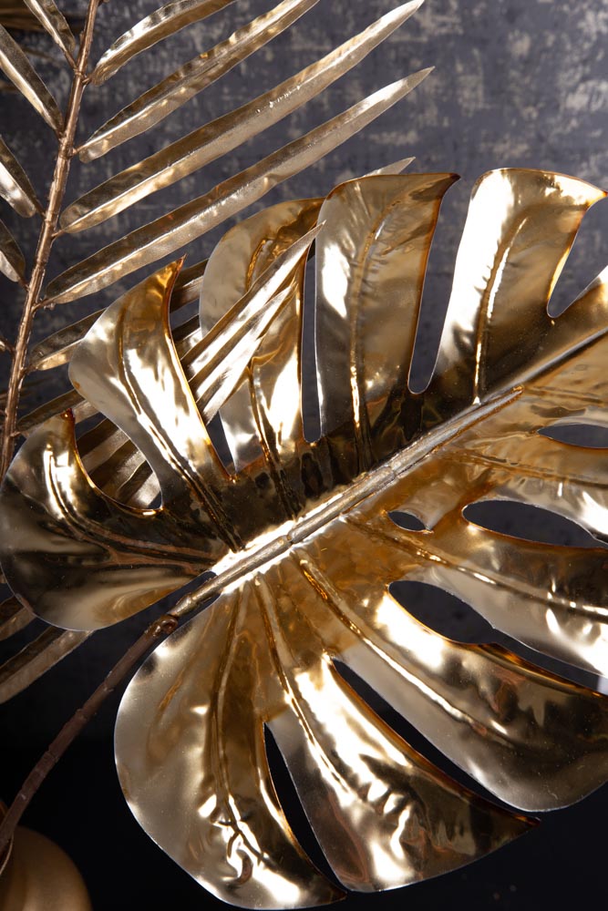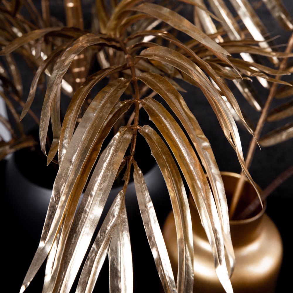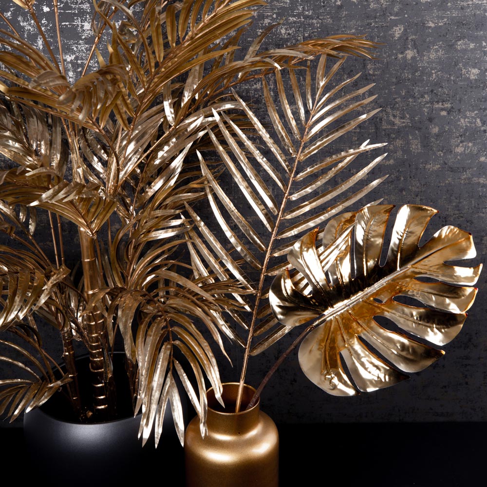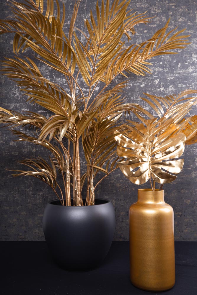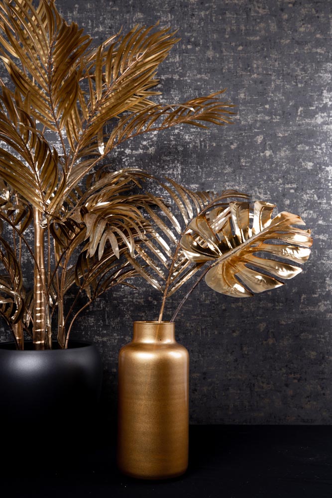 Du noir et de l'or! Notre variété de plantes artificielles dorées est tout simplement totalement inspirante ! Pour ce look, nous avons opté pour une conception classique qui convient vraiment à chaque salon. Un palmier dans un pot anthracite combiné à un vase doré garni d'une feuille de philodendron et d'une feuille de palmier. Simple, intemporel et beau ! Shop the Look!