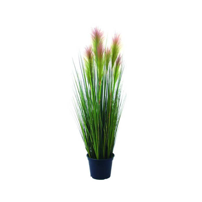 Stipe pennée décorative dans son pot mesurant au total environ 90 cm.. Cette graminée artificielle est pourvue de brins d'herbe vert foncé et quelques épis roses.
