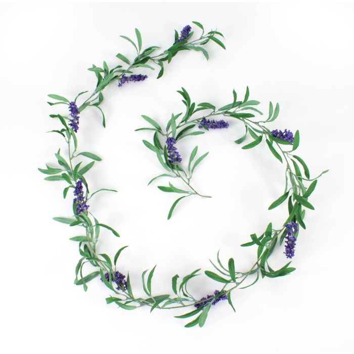 Guirlande de lavande synthétique mesurant au total environ 180 cm de long, composée de fleurs de lavande, et quelques feuilles.