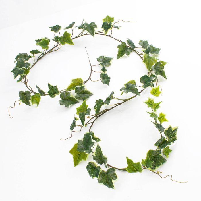 Guirlande de lierre artificielle mesurant au total environ 180 cm de long et pourvue de 65 feuilles de couleur blanc-vert. Cette guirlande aux finitions soignées, produit de qualité supérieur à l'aspect et au toucher naturel conviendra parfaitement pour une déco de vitrine.
