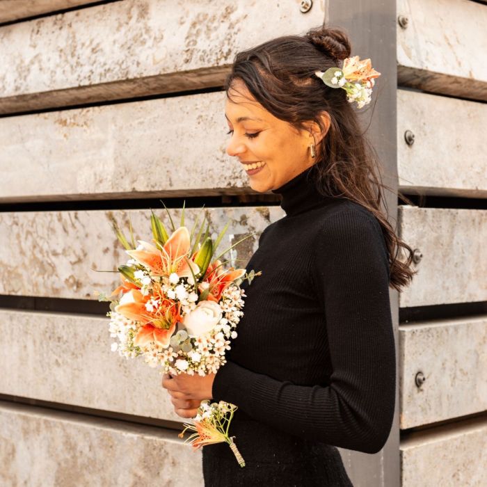 L'orange et le blanc ! Des lys orange de la série EMIKO devaient tout simplement faire partie du bouquet de mariée de Tamara. Ces fleurs textiles lumineuses ne sont pas seulement magnifiques, elles ont aussi une signification appropriée pour un mariage. En effet, les fleurs de lys orange symbolisent la passion, le bonheur et la joie. De plus, elles ont une floraison fascinante qui rend chaque bouquet élégant. Notre équipe créative a également réalisé les accessoires de cheveux assortis sous forme de serre-tête pour Tamara elle-même et sa demoiselle d'honneur, ainsi qu'une boutonnière assortie pour l'homme. Une combinaison parfaite pour cette occasion spéciale. Shop the Look!