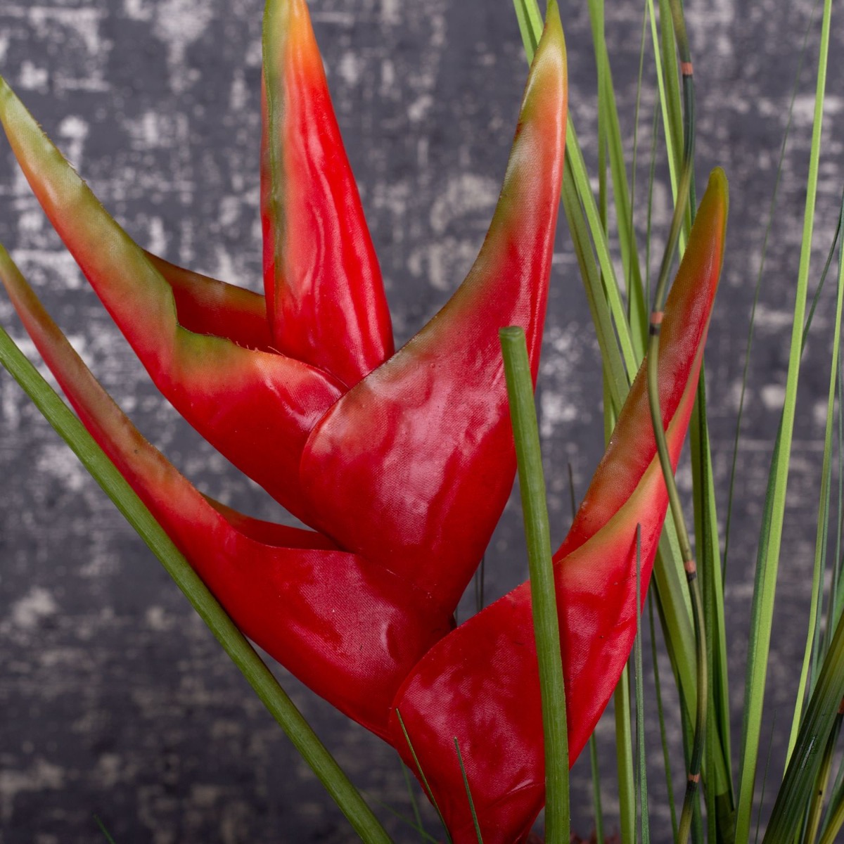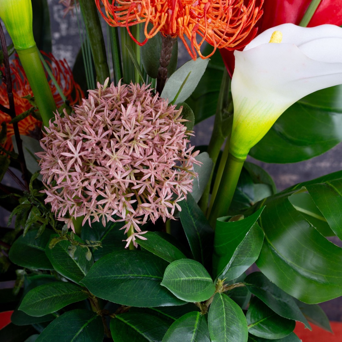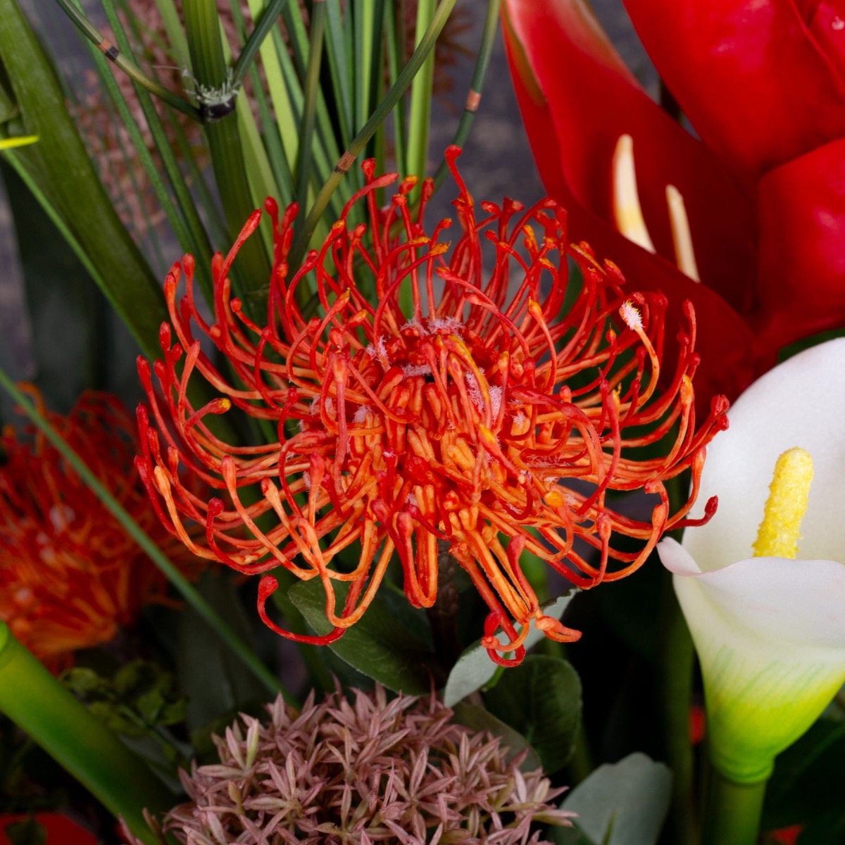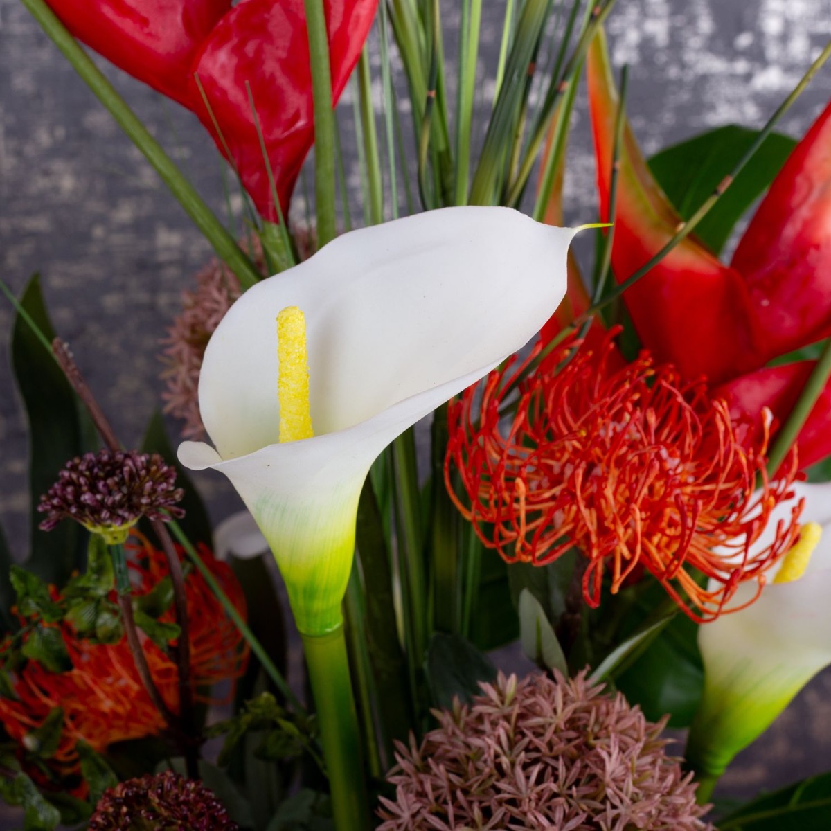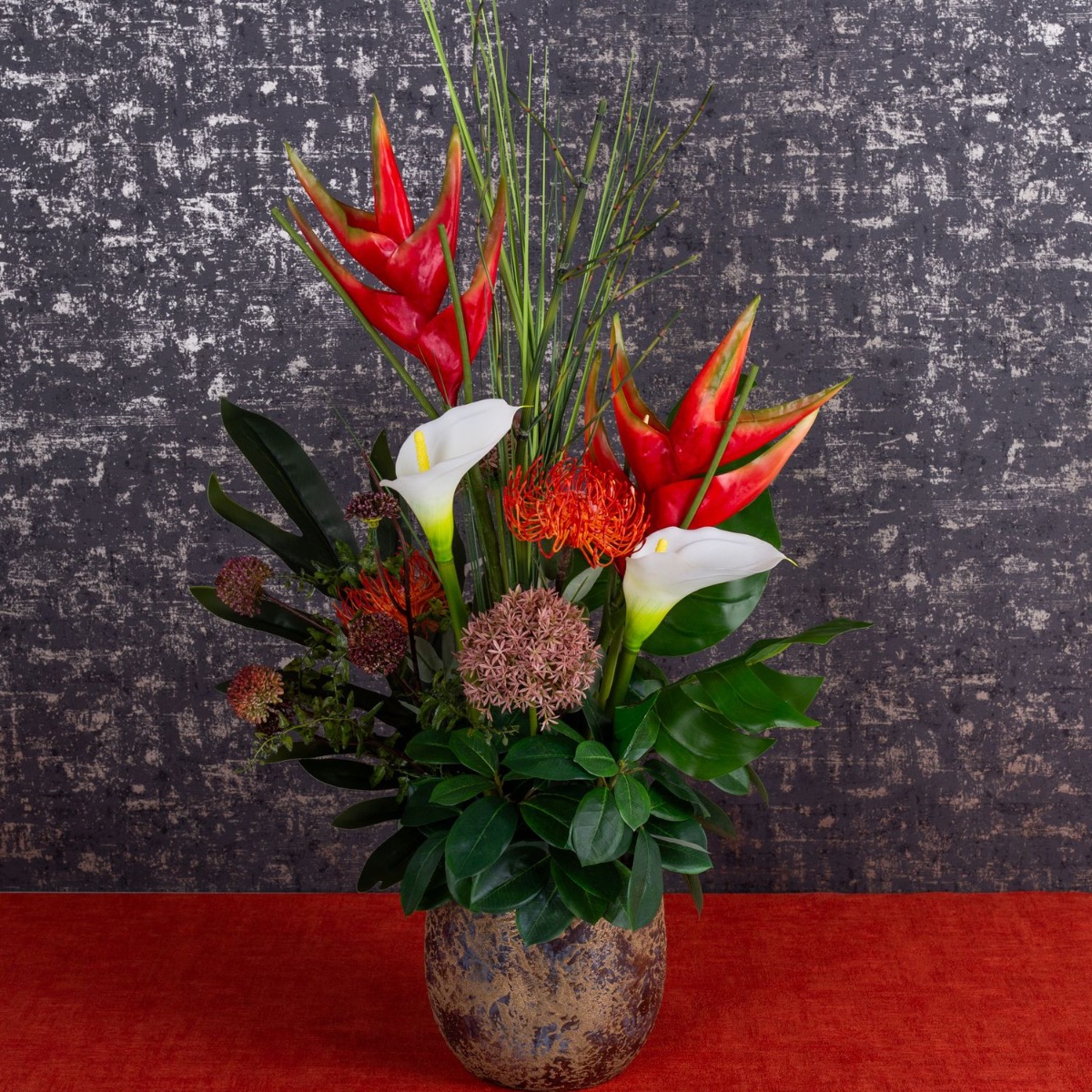 Héliconias rouges et callas blancs! D'une beauté intemporelle, cette composition orne votre intérieur. Devant un mur sombre, les couleurs sont particulièrement bien mises en valeur, mais cette composition florale artistique convient également comme décoration placée au milieu de la pièce, car elle a été conçue de manière à ce que l'on puisse la regarder de tous les côtés. Un cache-pot doré met en valeur la beauté classique. Parfaitement adapté aux pièces à vivre, aux entrées et aux salles à manger. Shop the Look!