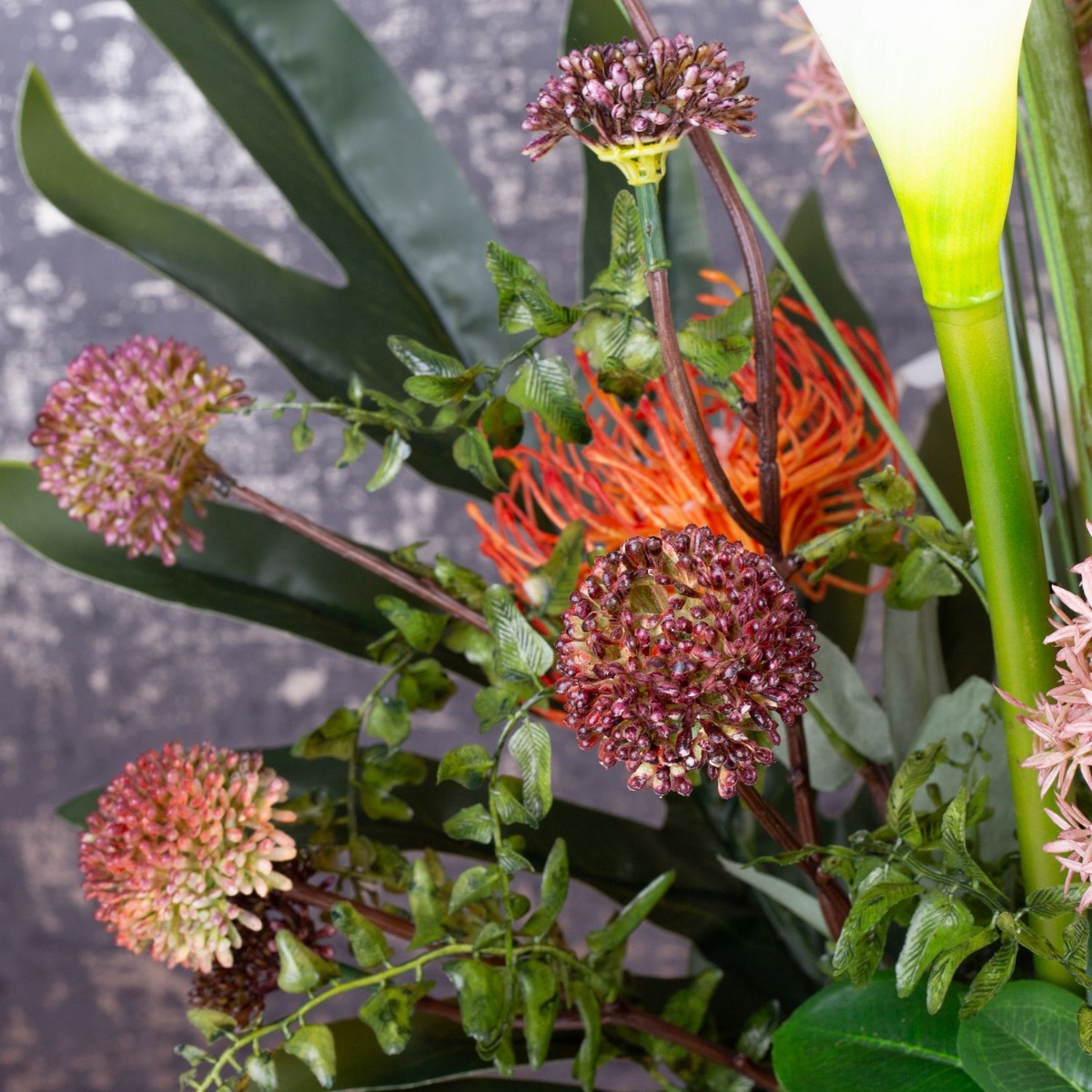 .Conseil d'aménagement: Les fleurs primaires sont d'abord plantées dans la mousse de bouturage. C'est ainsi que l'on peut le mieux influencer la disposition des fleurs voyantes. Le mieux est de les couper à différentes hauteurs. Les fleurs secondaires sont piquées tout autour. Il est important de planter les fleurs et les feuilles de manière à ce que chaque côté soit harmonieux.