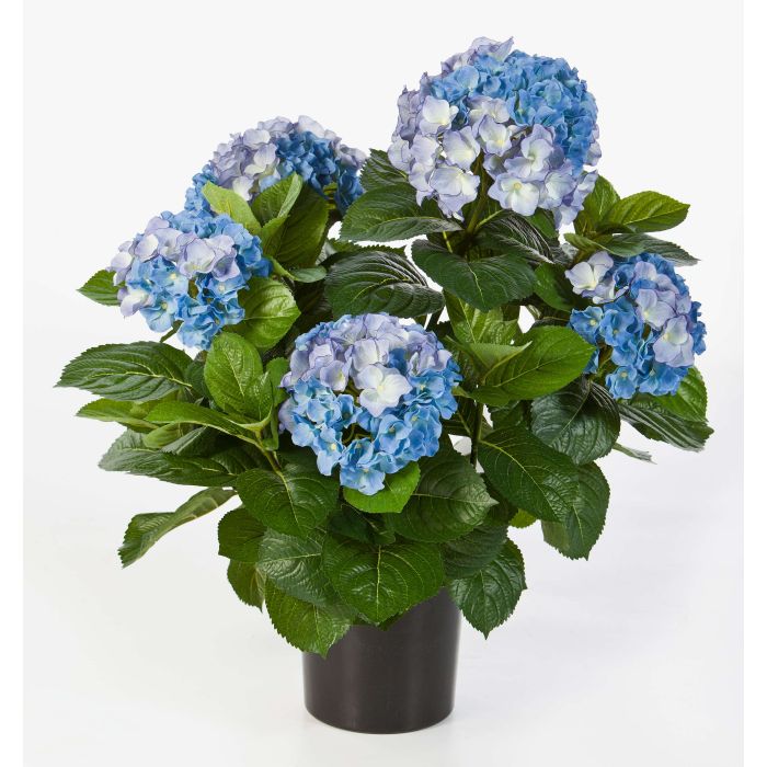 Hortensia artificiel pourvu de 5 grosses fleurs bleues livré dans son pot en plastique noir et mesurant au total environ 55 cm de haut.
