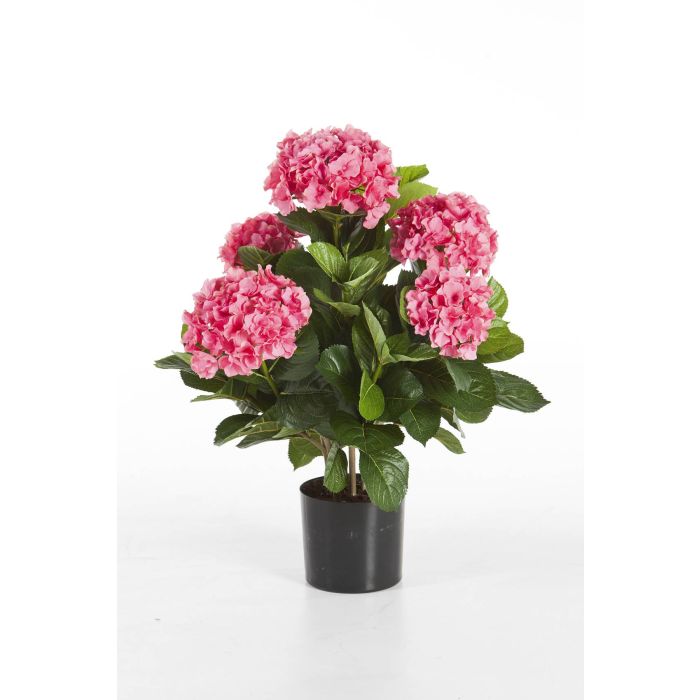 Hortensia artificiel pourvu de 5 grosses fleurs roses livré dans son pot en plastique noir et mesurant au total environ 55 cm de haut.