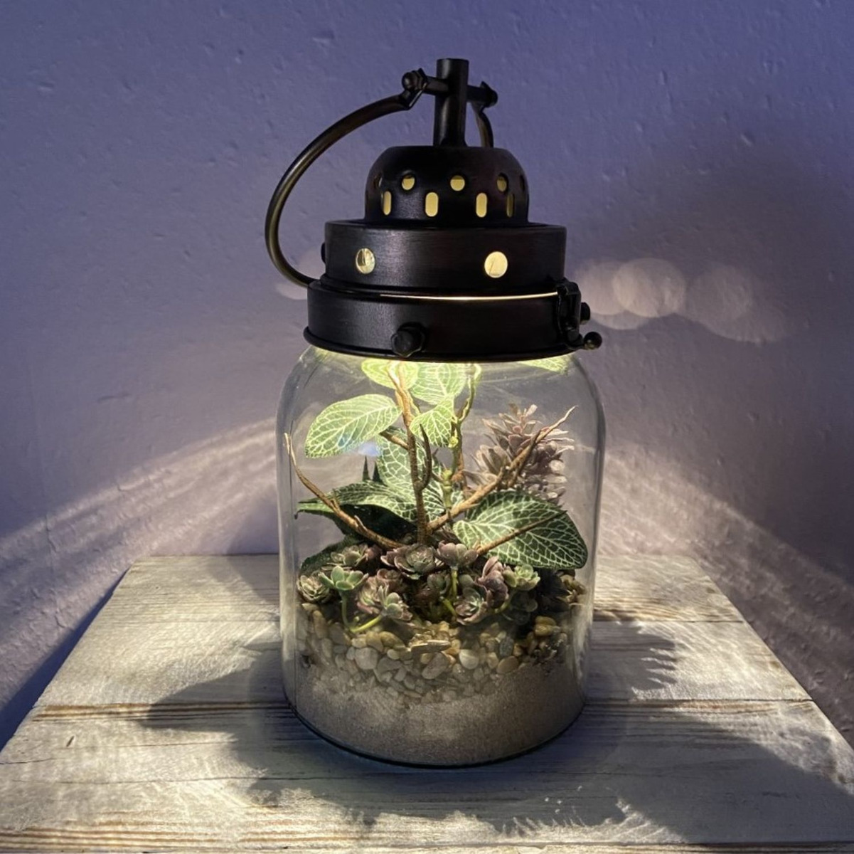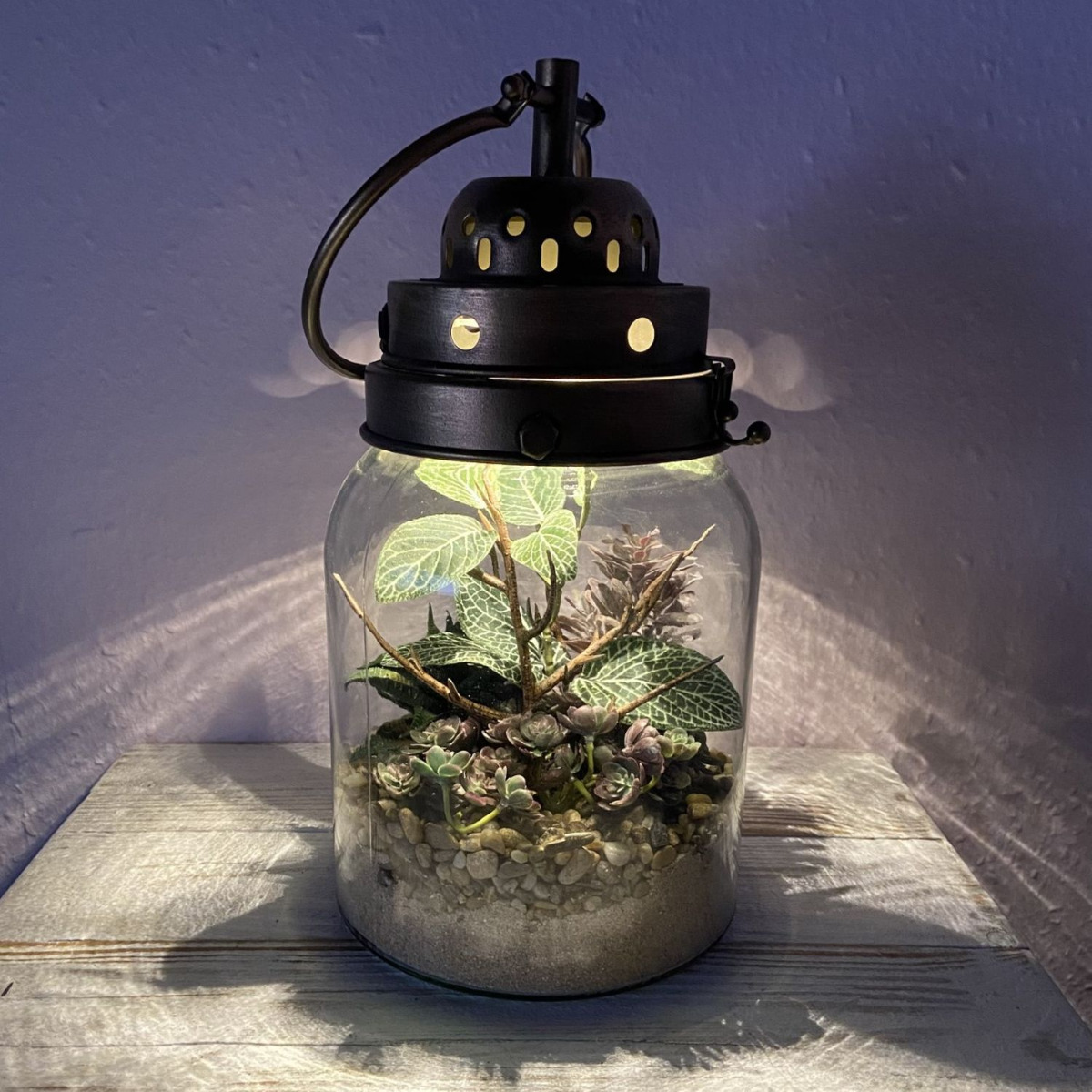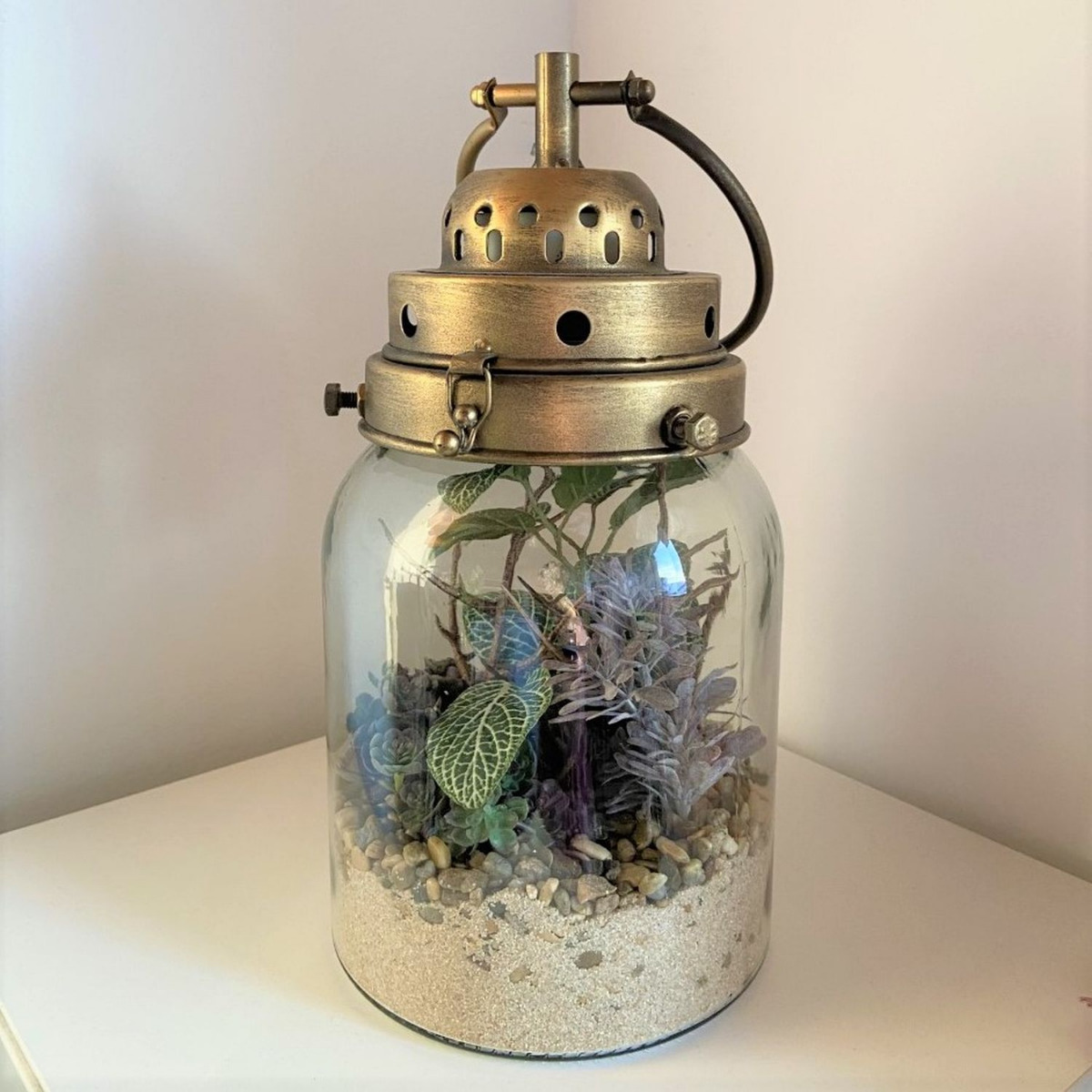 Un bel objet de décoration pour le soir ! Le couvercle du verre transparent est conçu de manière unique dans un look industriel. Fixé par trois vis, il est relié au verre, mais peut néanmoins être ouvert par une fermeture au-dessus. La grande anse apporte une touche visuelle. Mais ce qui rend ce verre particulier, c'est l'éclairage LED à l'intérieur du couvercle, qui s'allume et s'éteint à l'aide d'un bouton-poussoir. La lumière blanc chaud crée une ambiance agréable le soir, avec une tasse de thé à la main et un bon film pour terminer la journée. Les plantes artificielles et les succulentes aux couleurs assorties s'harmonisent parfaitement avec le couvercle. Le sable naturel et les petits cailloux offrent un support aux petites plantes et permettent de créer un aspect réaliste. Vous aussi, vous aimeriez donner un nouvel éclat à votre intérieur ? Shop the Look!