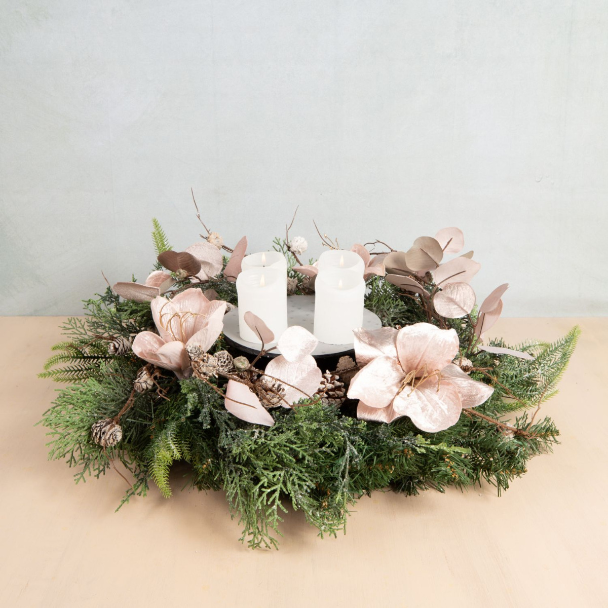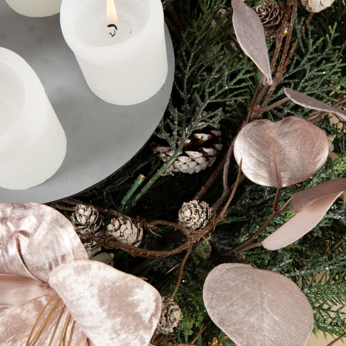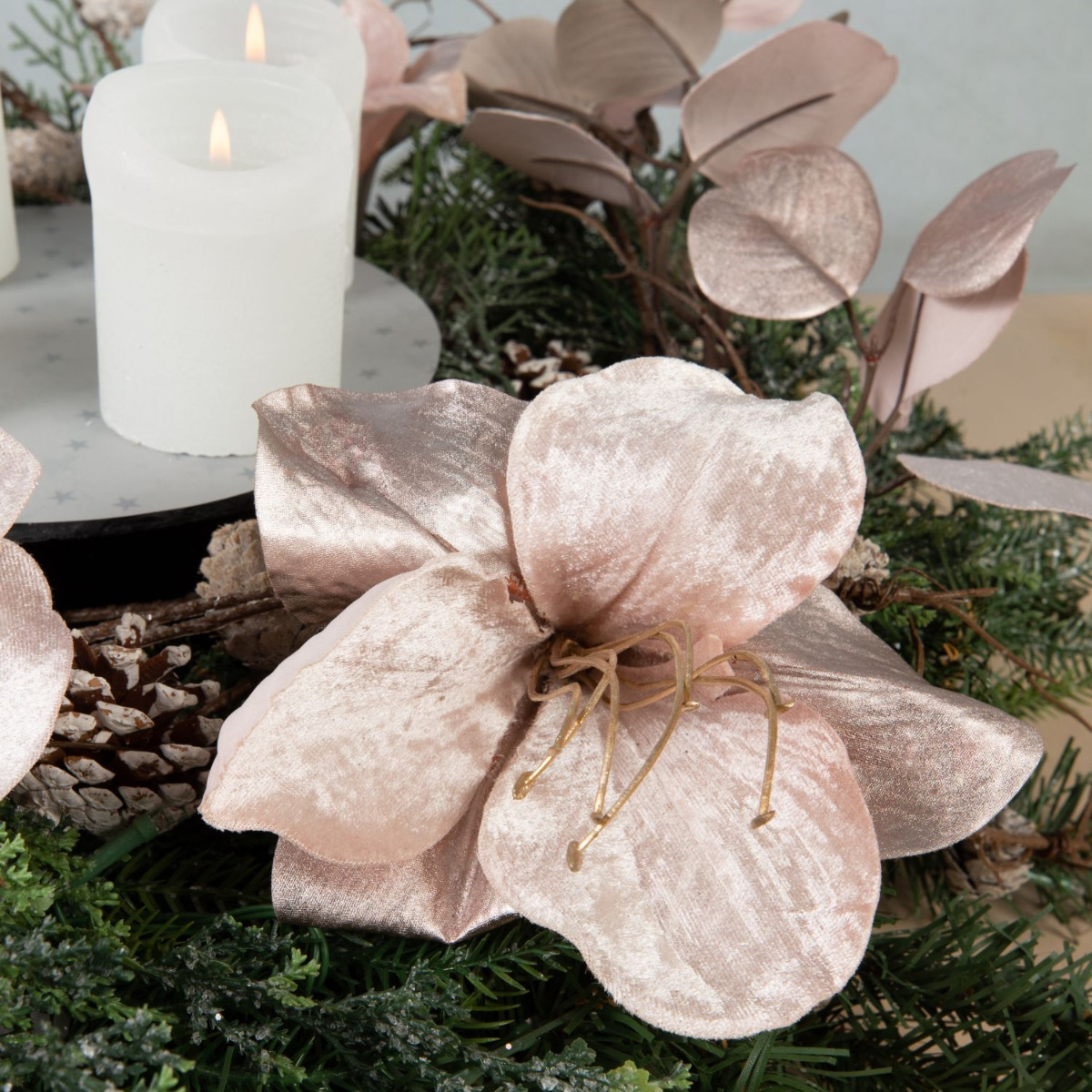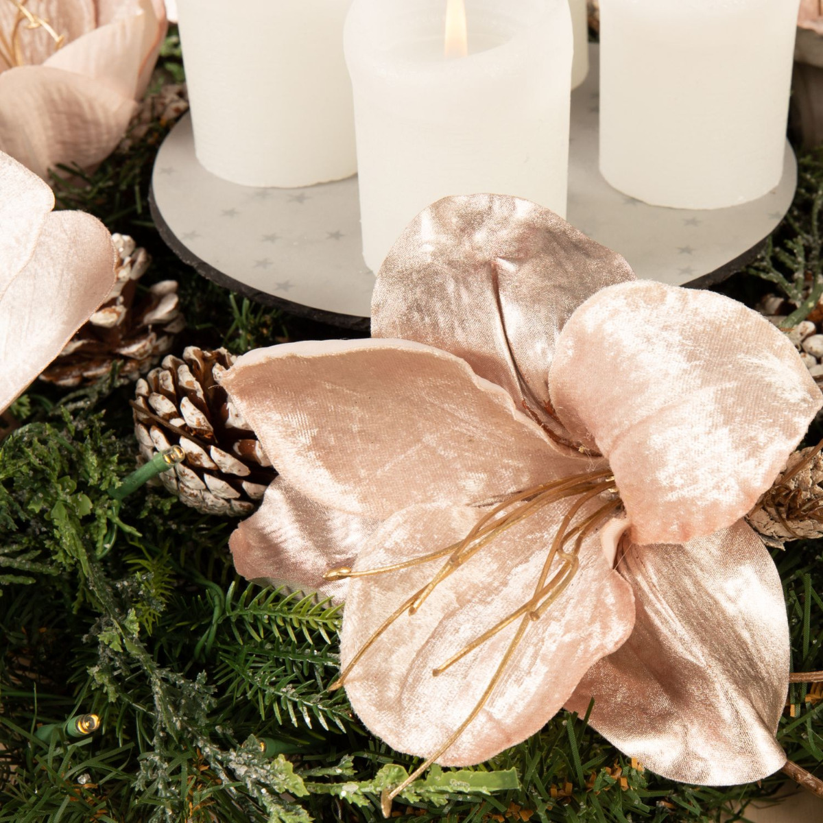 Traditionnelle et moderne! Cette couronne de l'Avent a été composée avec beaucoup d'amour et de souci du détail. Les branches de sapin, les pommes de pin et les cyprès de la couronne se mêlent parfaitement à l'élégance veloutée de l'amaryllis et de l'eucalyptus rose. La disposition moderne des bougies au centre de la couronne donne à ce look une toute nouvelle allure. On attend Noël avec impatience. Shop the Look!