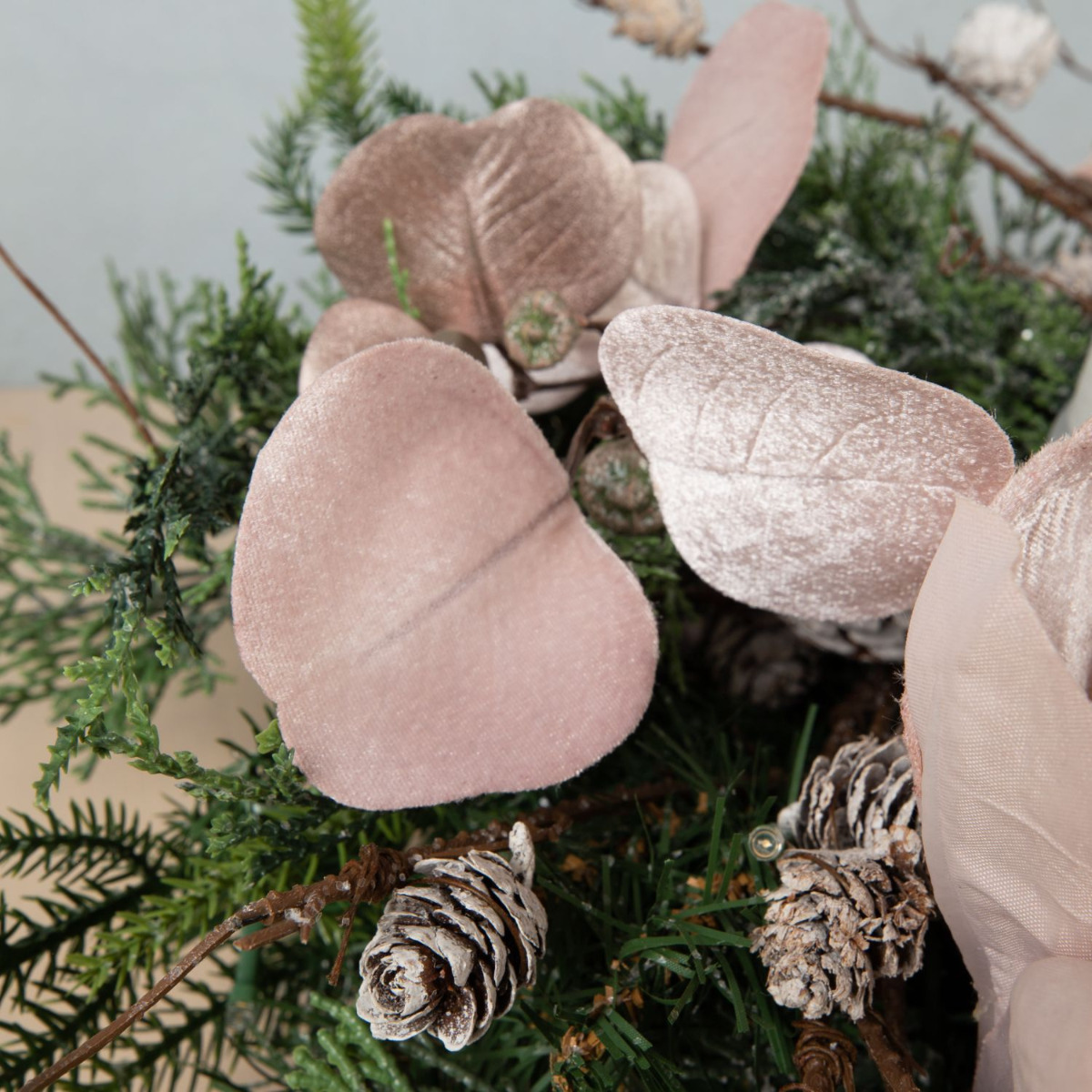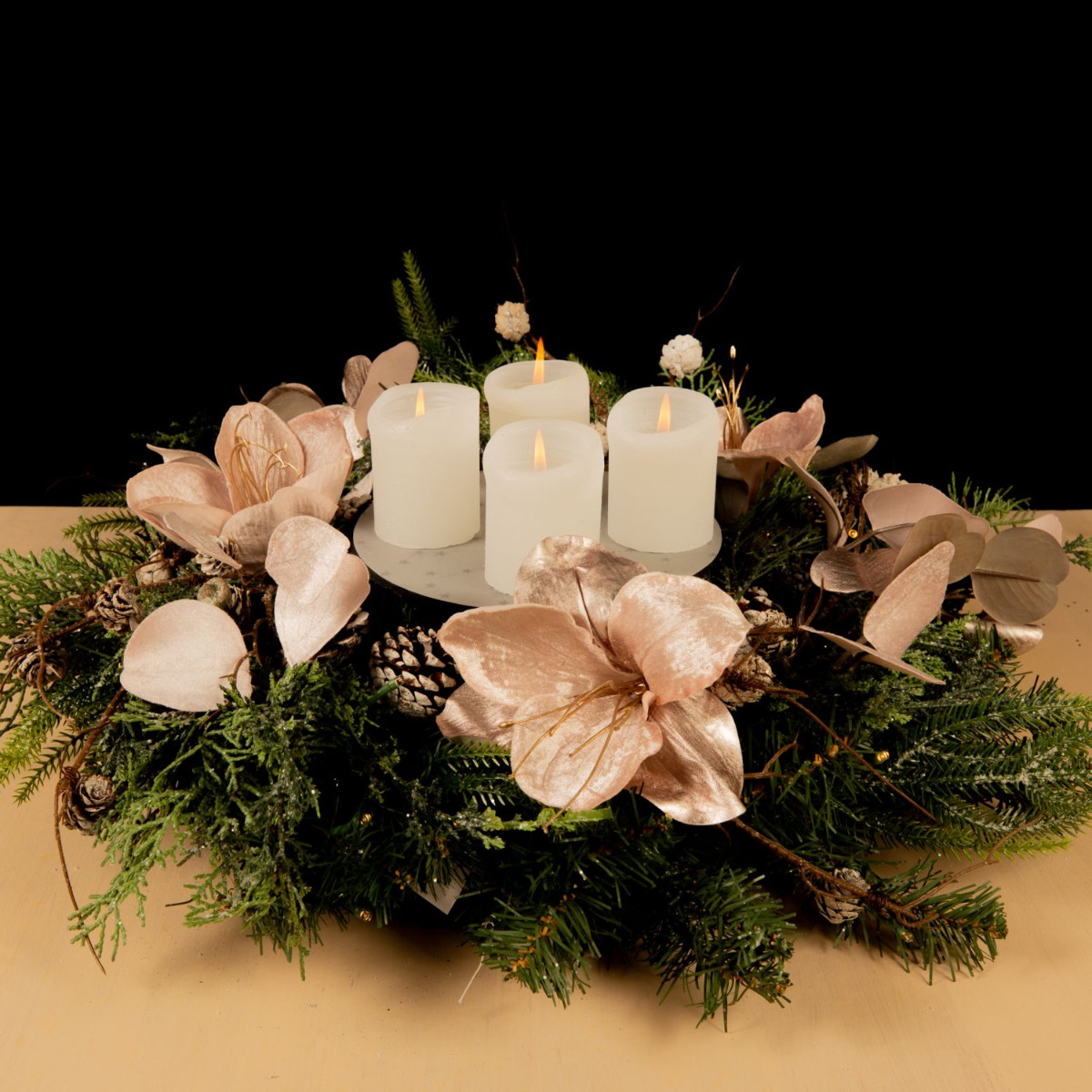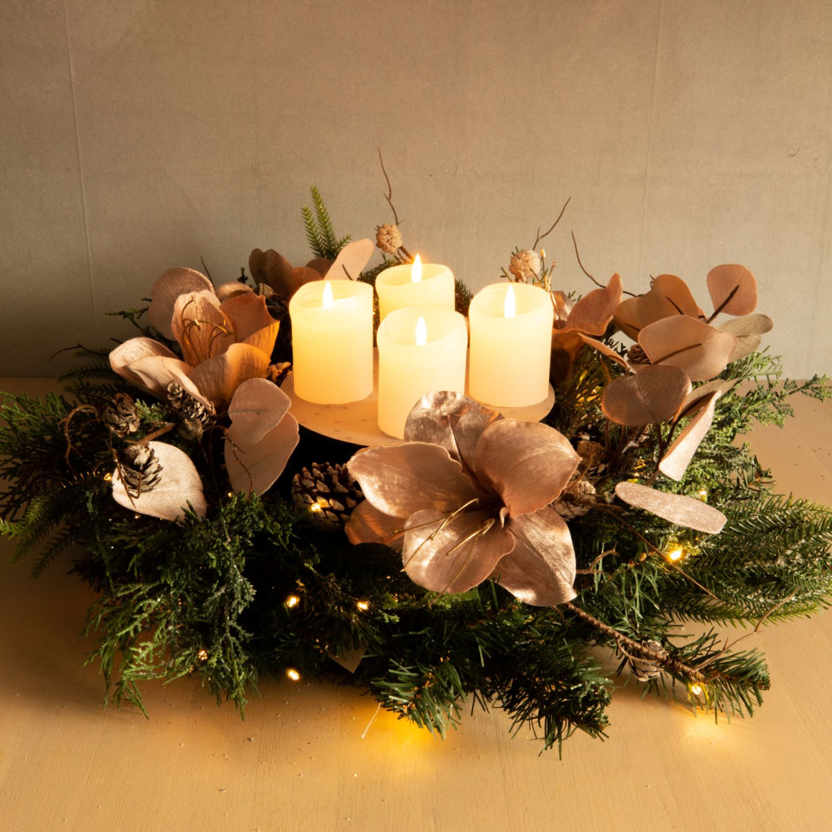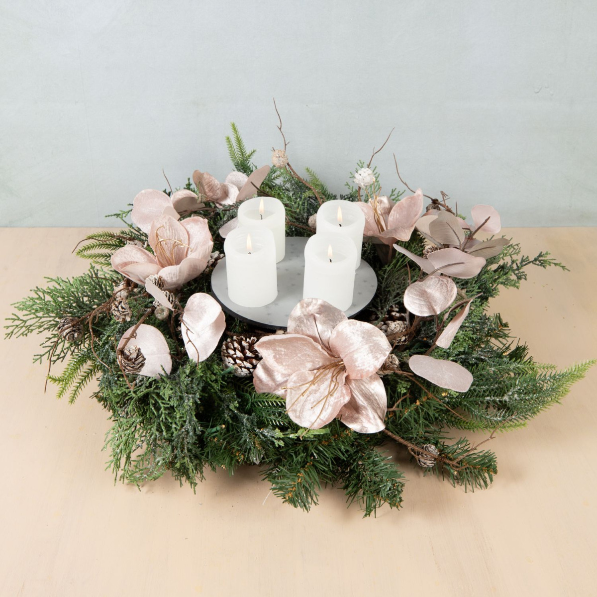 Traditionnelle et moderne! Cette couronne de l'Avent a été composée avec beaucoup d'amour et de souci du détail. Les branches de sapin, les pommes de pin et les cyprès de la couronne se mêlent parfaitement à l'élégance veloutée de l'amaryllis et de l'eucalyptus rose. La disposition moderne des bougies au centre de la couronne donne à ce look une toute nouvelle allure. On attend Noël avec impatience. Shop the Look!