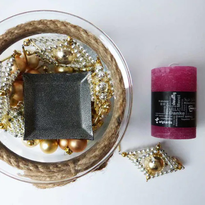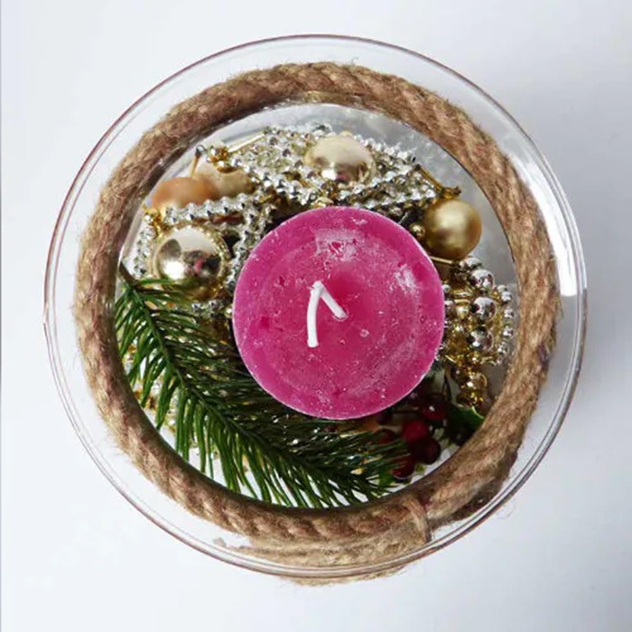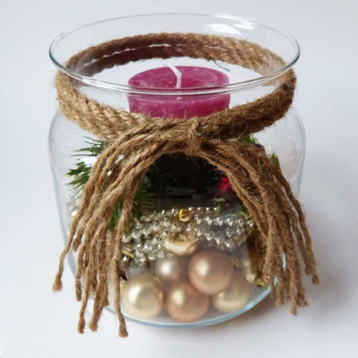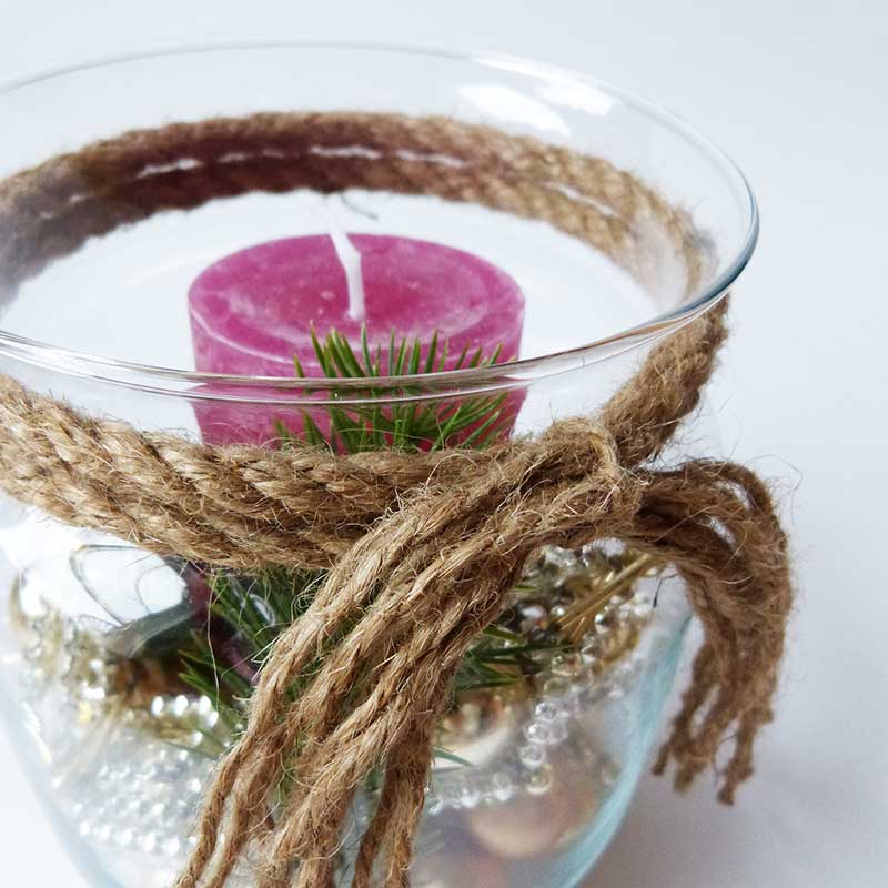 .Conseil d'aménagement : Répartir d'abord la décoration dans le verre, puis placer le bougeoir et la bougie dessus. Si nécessaire, raccourcir légèrement la branche de sapin ou la couper en branches individuelles.