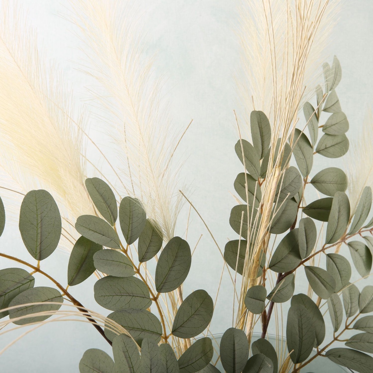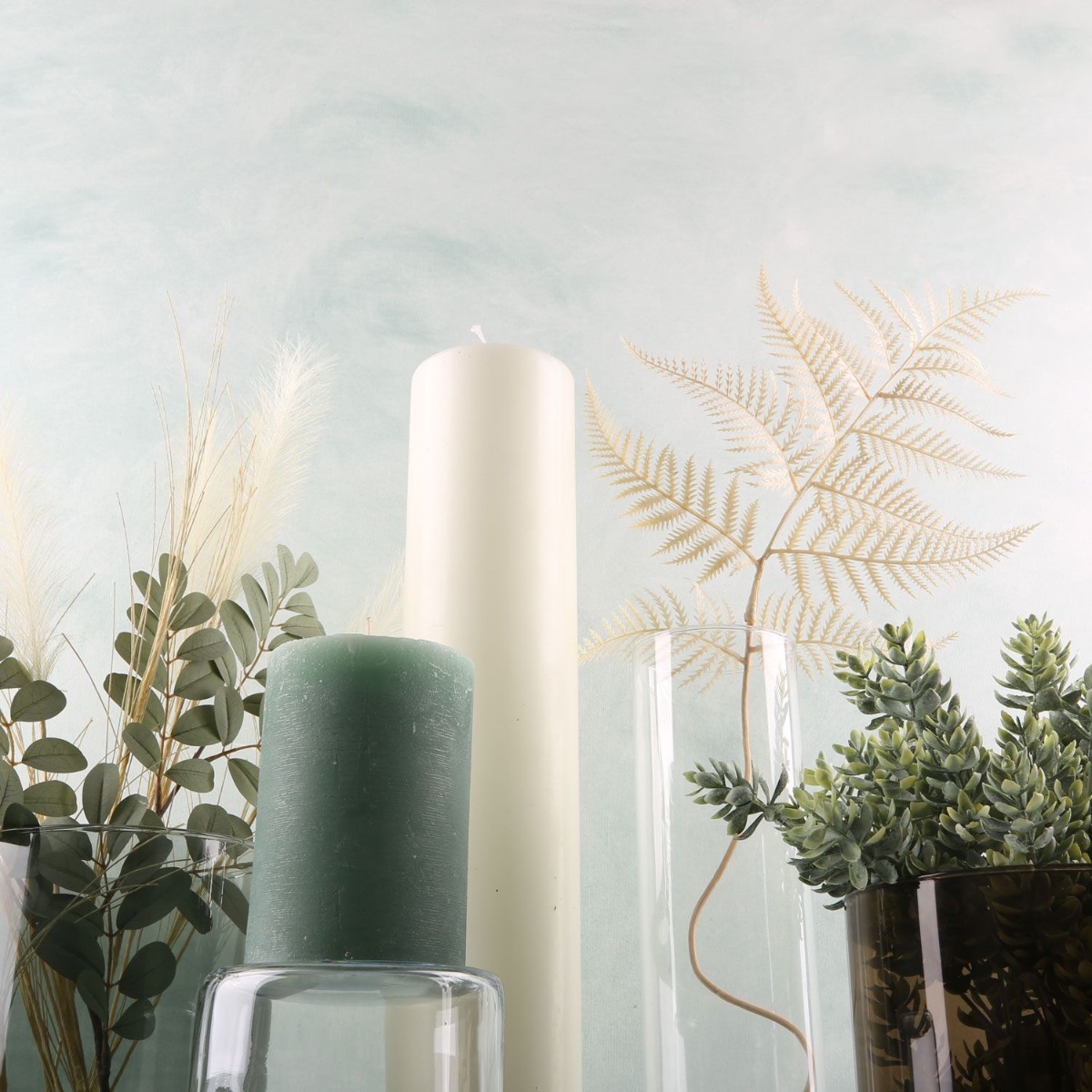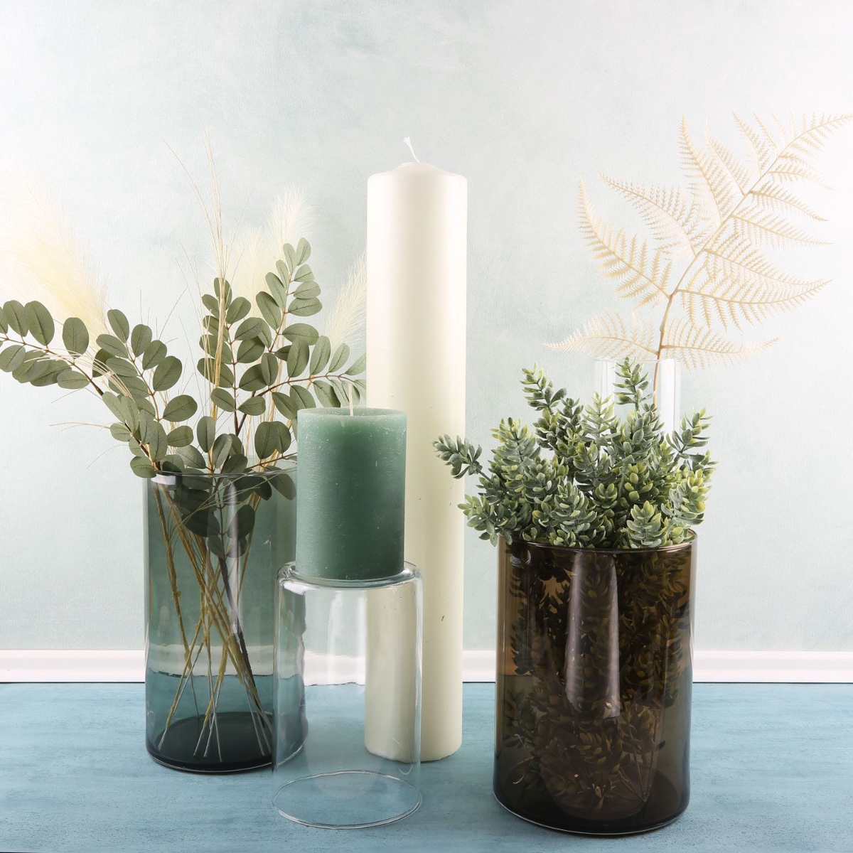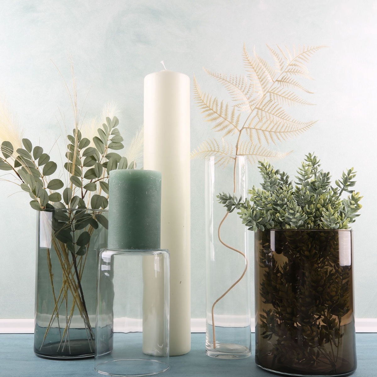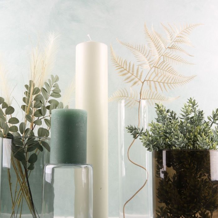 Vert eucalyptus et blanc cassé ! Ce look offre une décoration élégante pour toute l'année aux amateurs de designs classiques. Une collection de vases Sanya de différentes hauteurs et couleurs constitue ici la base du look. Le clou, c'est qu'en retournant un vase, on obtient un chandelier. Ainsi, la petite bougie dans la couleur tendance vert menthe atteint la hauteur de notre bougie à poser au sol géante. La feuille de fougère de couleur crème s'accorde parfaitement avec le stipa délicat et les branches gris-vert. Que ce soit en été ou en hiver, cette décoration convient toujours. Shop the Look!