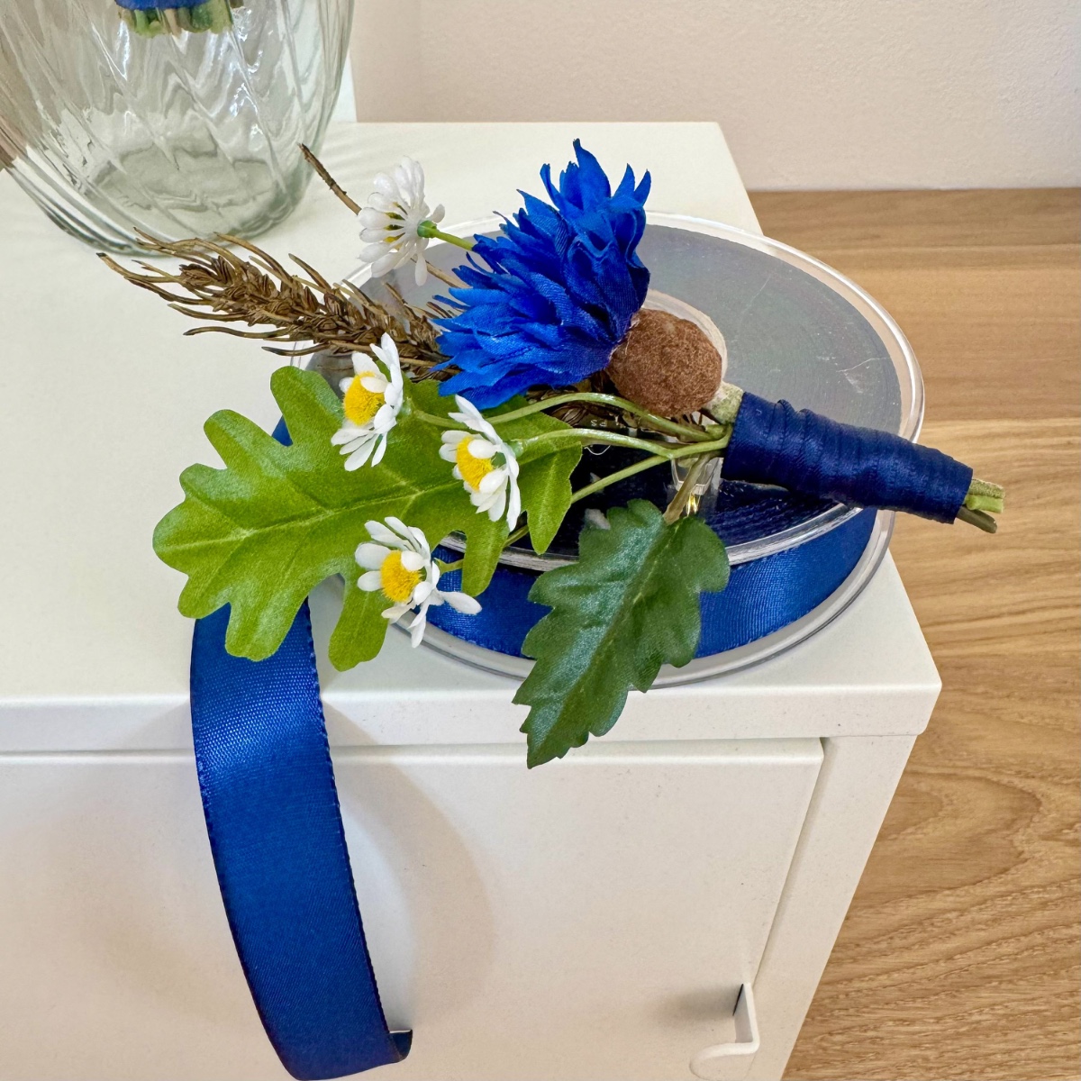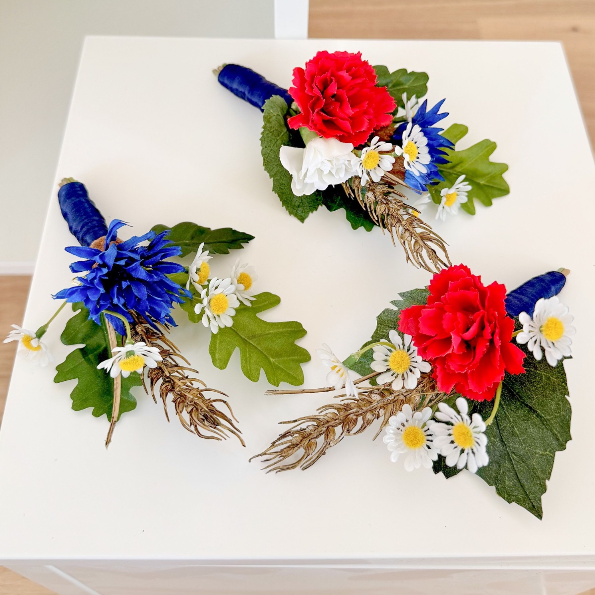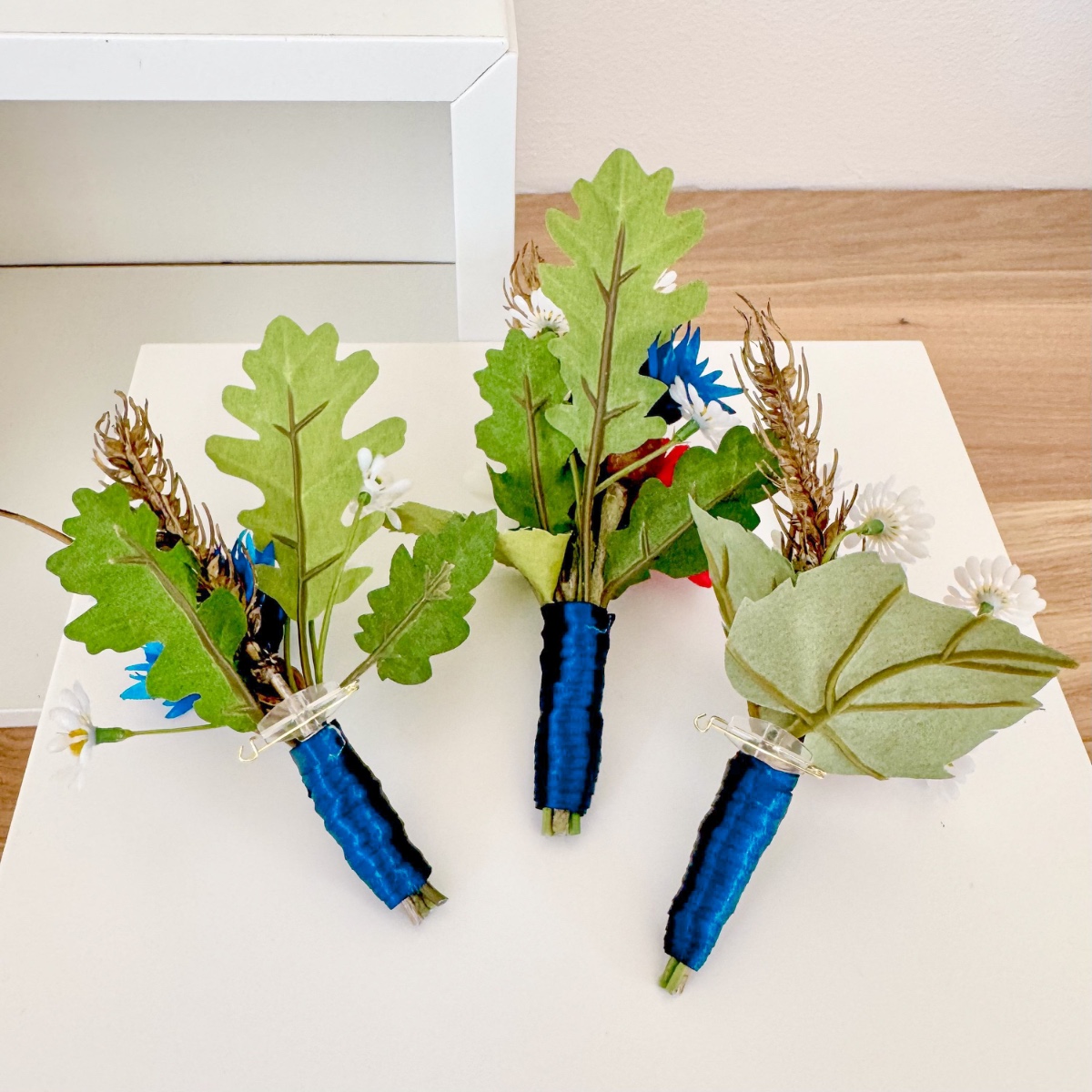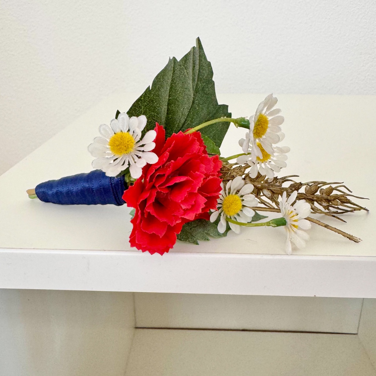 Un bouquet empreint d'amour, de force et d'attachement à ses racines ! Pour son mariage, Tina souhaitait un bouquet de mariée doté d'une symbolique particulière. Au centre de la composition, on trouve des œillets rouges et blancs très expressifs, ainsi que des bleuets bleus comme fleurs principales. Les œillets rouges symbolisent l'amour passionné et le dévouement, tandis que les œillets blancs représentent la pureté, la fidélité et un attachement sincère. Le bleuet complète la composition en apportant des notions de naturel, d’espoir et de constance. La délicate camomille, utilisée comme fleur de remplissage, confère une douce légèreté au bouquet et symbolise traditionnellement le calme, la modestie et la force intérieure. Les épis de blé dorés apportent non seulement une touche chaleureuse et structurante au bouquet, mais symbolisent également la fertilité, la prospérité et un avenir commun. La verdure est dominée par des feuilles de tilleul et de chêne : les feuilles de tilleul symbolisent l'amour, la sécurité et la communauté, tandis que les feuilles de chêne incarnent la force, la fermeté et la constance. Ensemble, elles créent une base puissante et proche de la nature. Le bouquet de mariée est complété par un ruban bleu foncé, qui symbolise la profondeur, la fidélité et la sérénité, et confère à l'ensemble une touche élégante et classique. Des boutons de manche floraux assortis au bouquet de mariée ont également été créés pour le marié et les invités. Le bouton de manche du marié reprend la symbolique principale du bouquet de mariée et relie les éléments centraux en un détail compact et significatif. Pour le témoin, l'accent est mis sur la combinaison de bleuets et de feuilles de chêne – une expression de loyauté, de force et d'amitié fidèle, complétée par de la camomille et du blé comme éléments fédérateurs. La boutonnière de la demoiselle d'honneur met en avant les thèmes de l'amour, de la cordialité et de la solidarité avec un œillet rouge et des feuilles de tilleul, également complétée par de la camomille et du blé pour un ensemble harmonieux. L'ensemble du look allie avec élégance symbolisme, amour de la nature et profondeur émotionnelle – un concept floral qui rend visibles et palpables les valeurs et les souhaits de la cliente. Shop the Look!